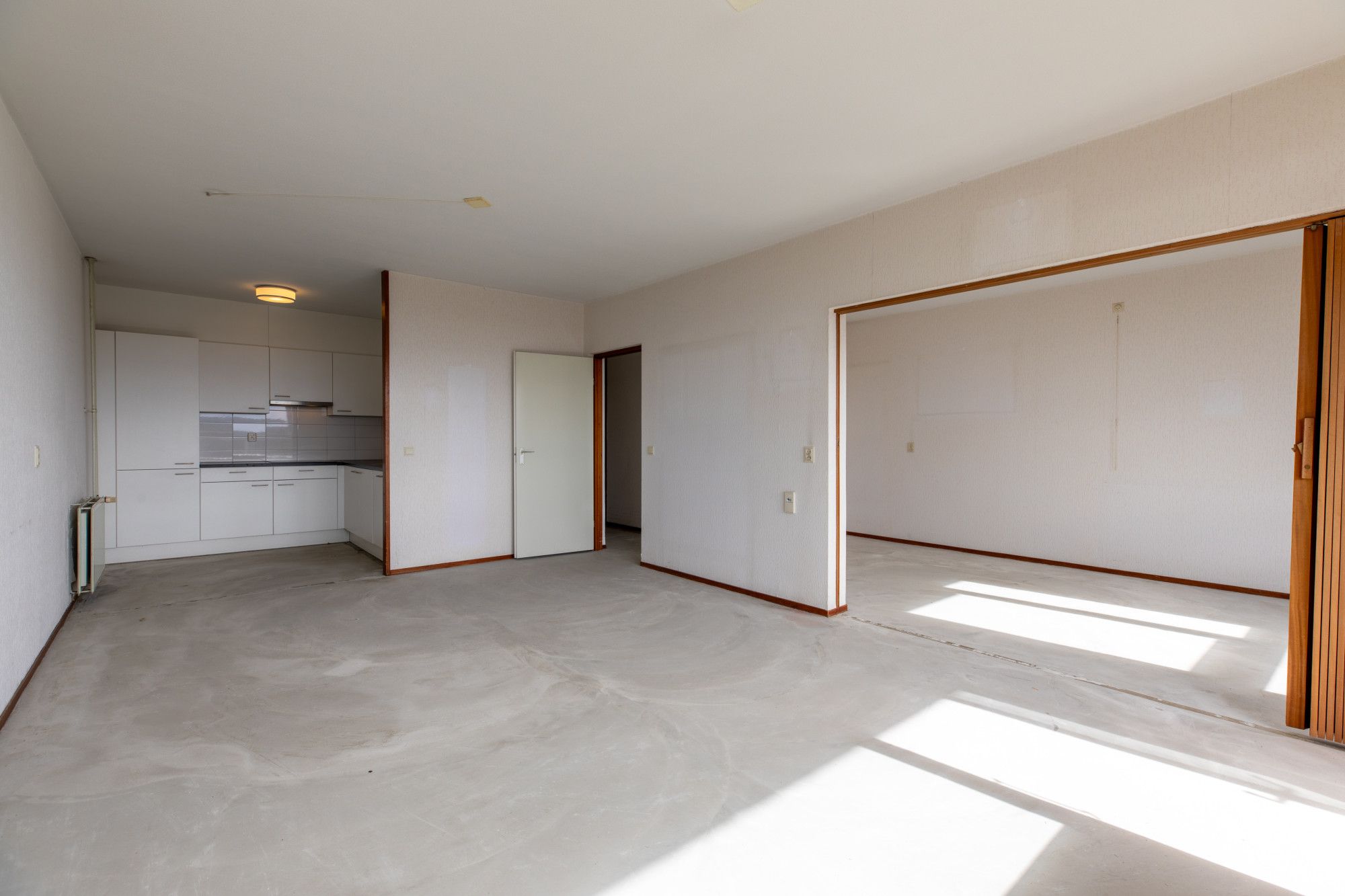 Ruime woonkamer met toegang naar balkon op het westen Halfopen keuken voorzien van een keurige keukeninstallatie. 1 slaapkamer.