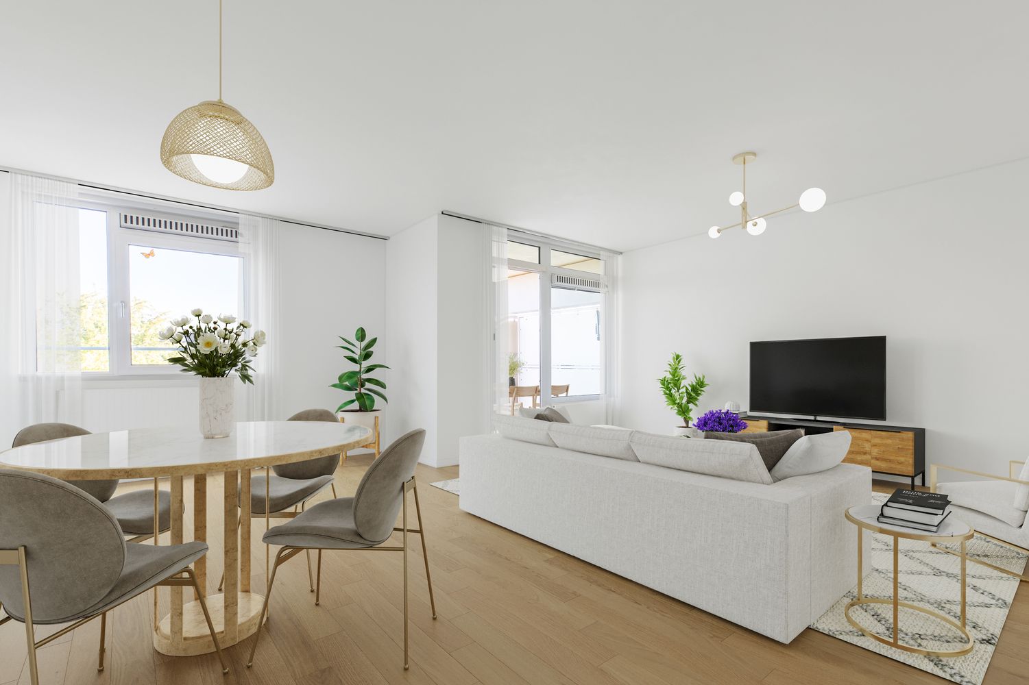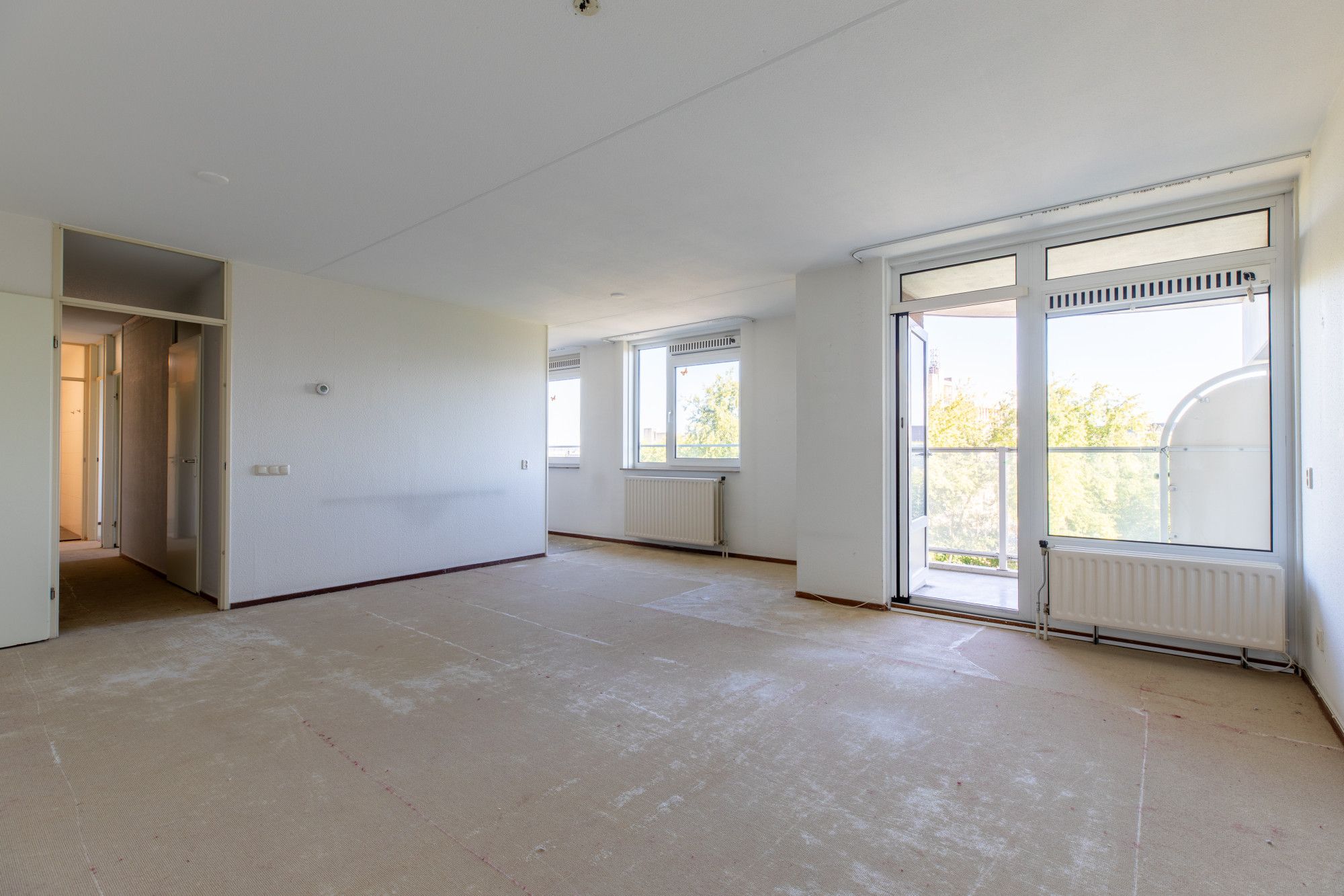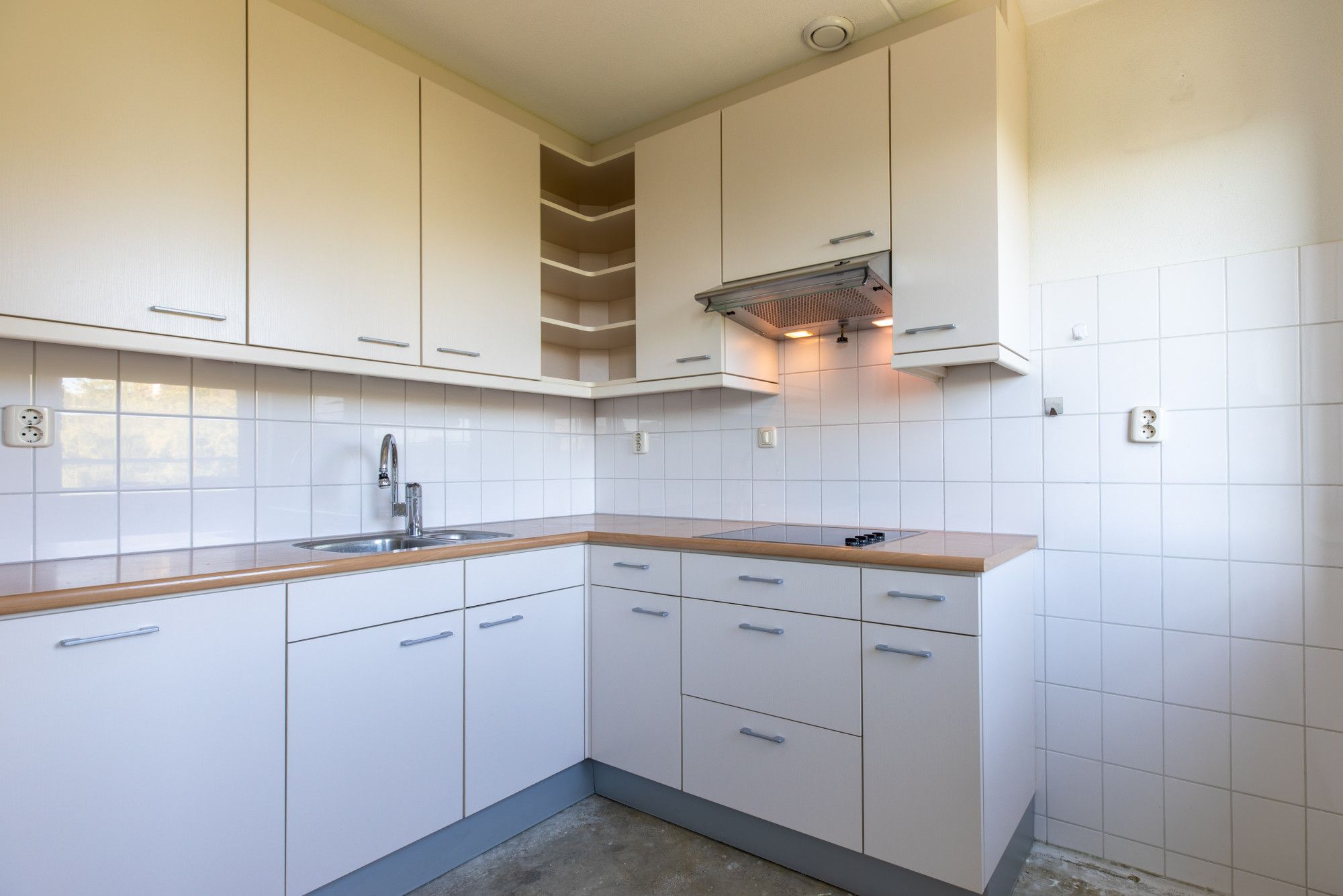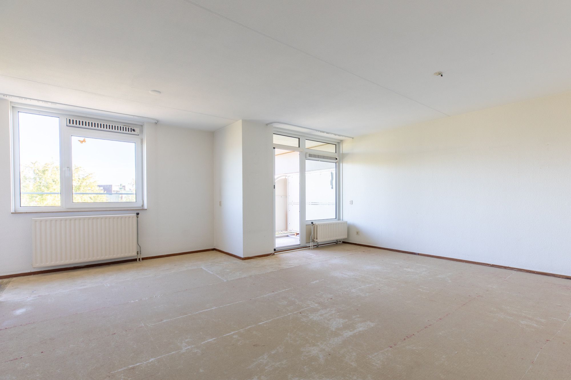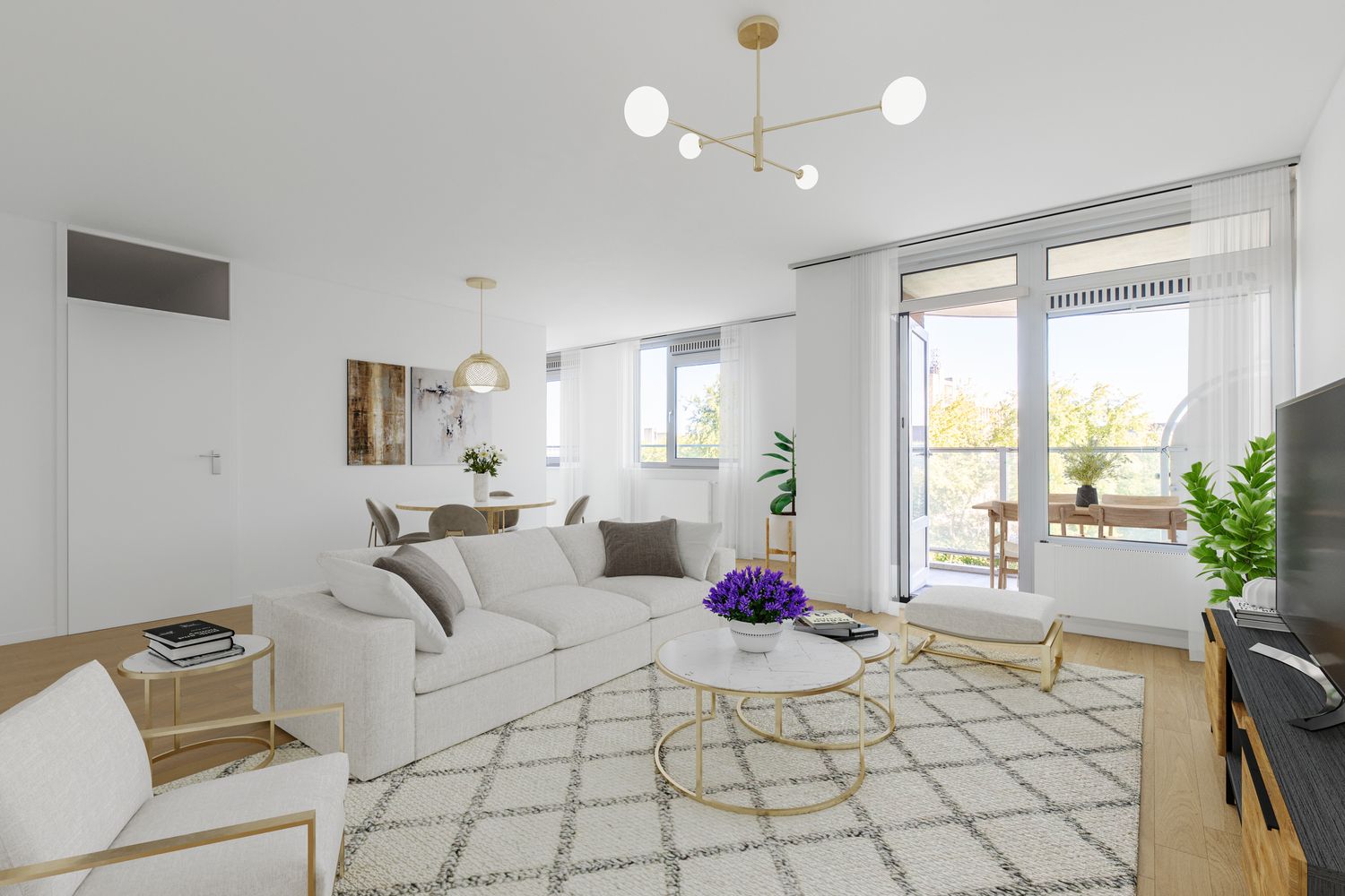 Woonkamer met toegang tot het balkon; half-open keuken met keuken installatie in hoekopstelling met diverse onder- en bovenkasten en inbouwapparatuur.