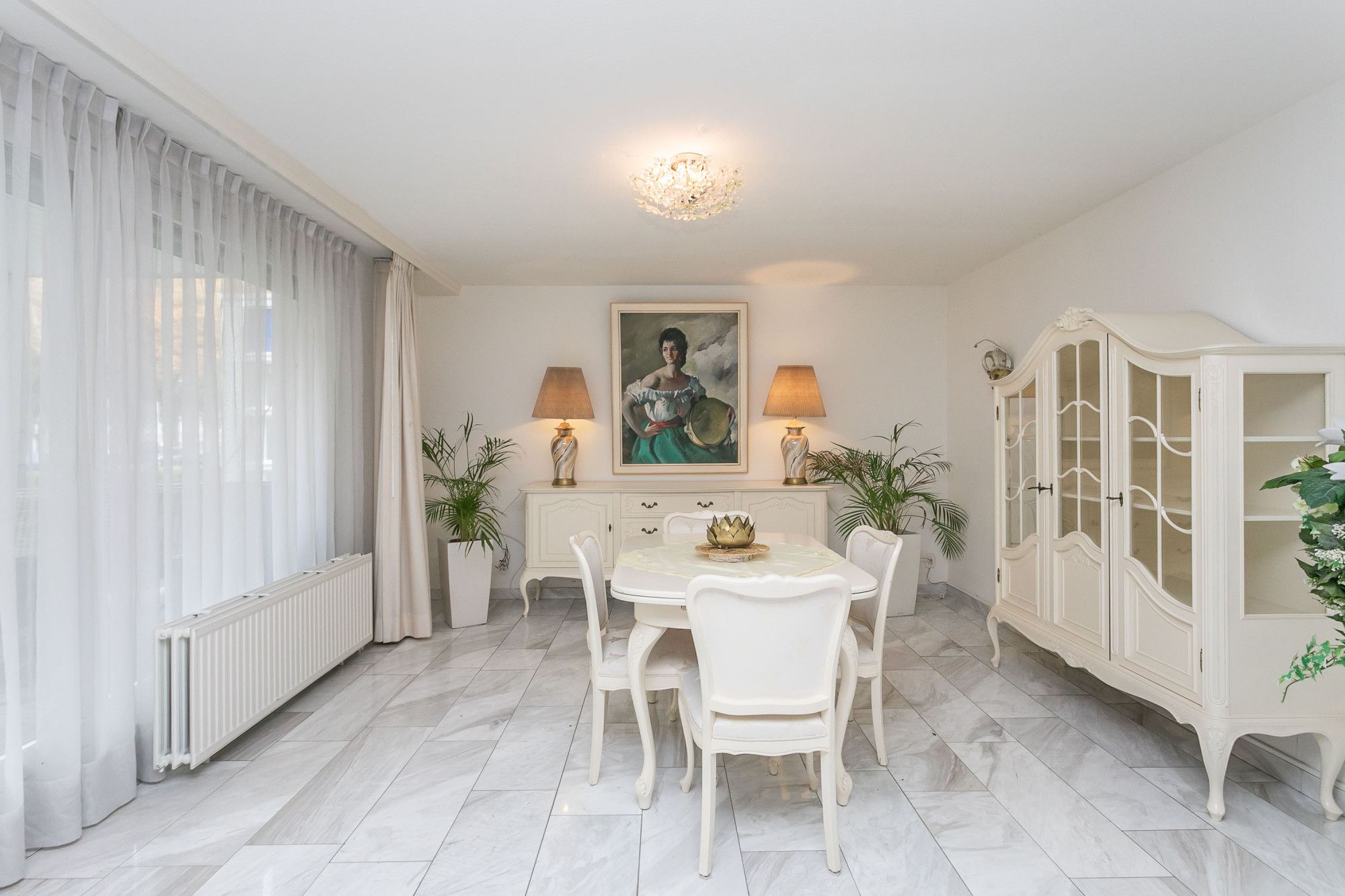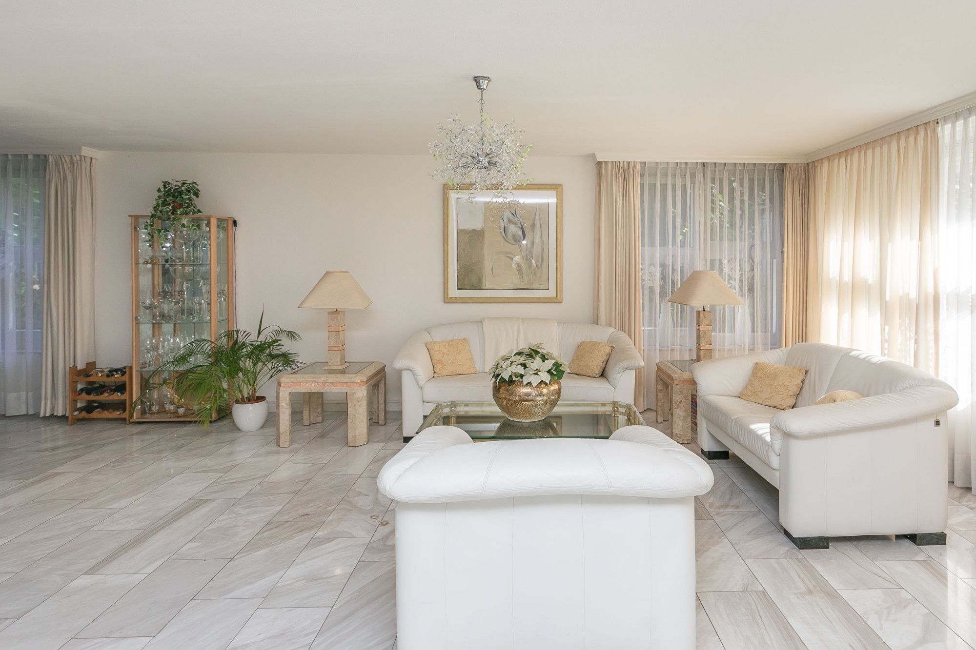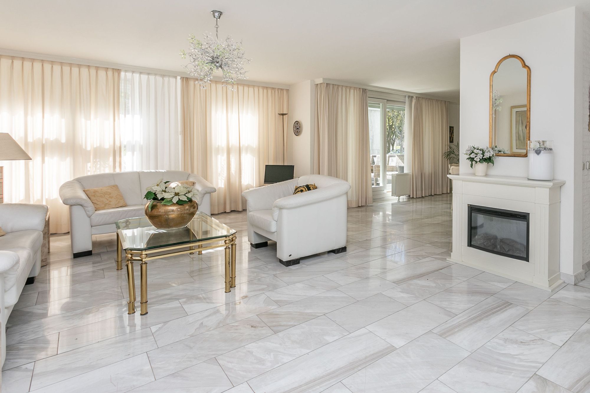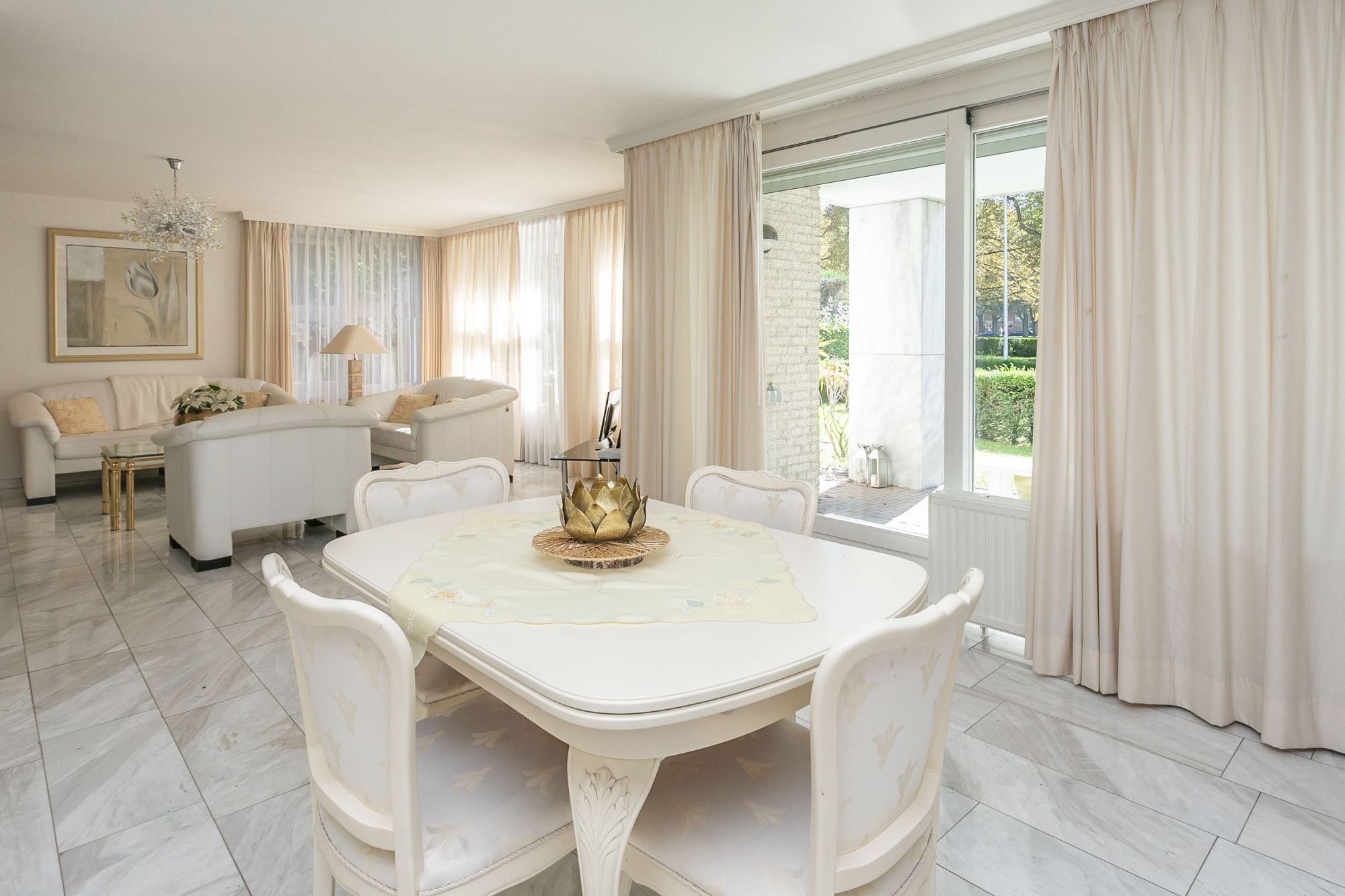 De riante living (ca. 50 m²) beschikt over een sfeervolle open haard en staat in open verbinding met de eetkamer. De woon-eetkamer staat via een schuifpui in directe verbinding met het zonnige terras en tuin aan de voorzijde.