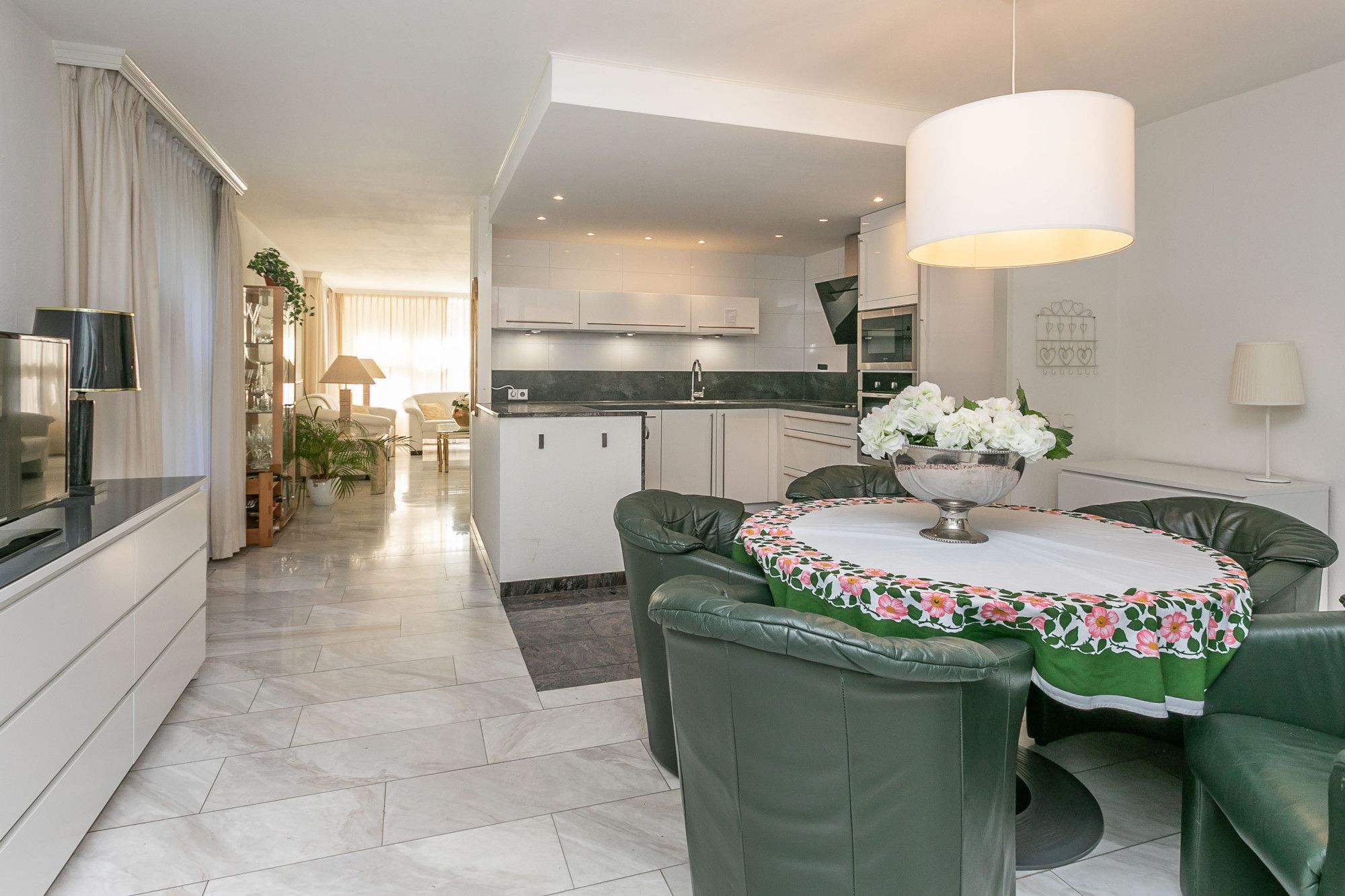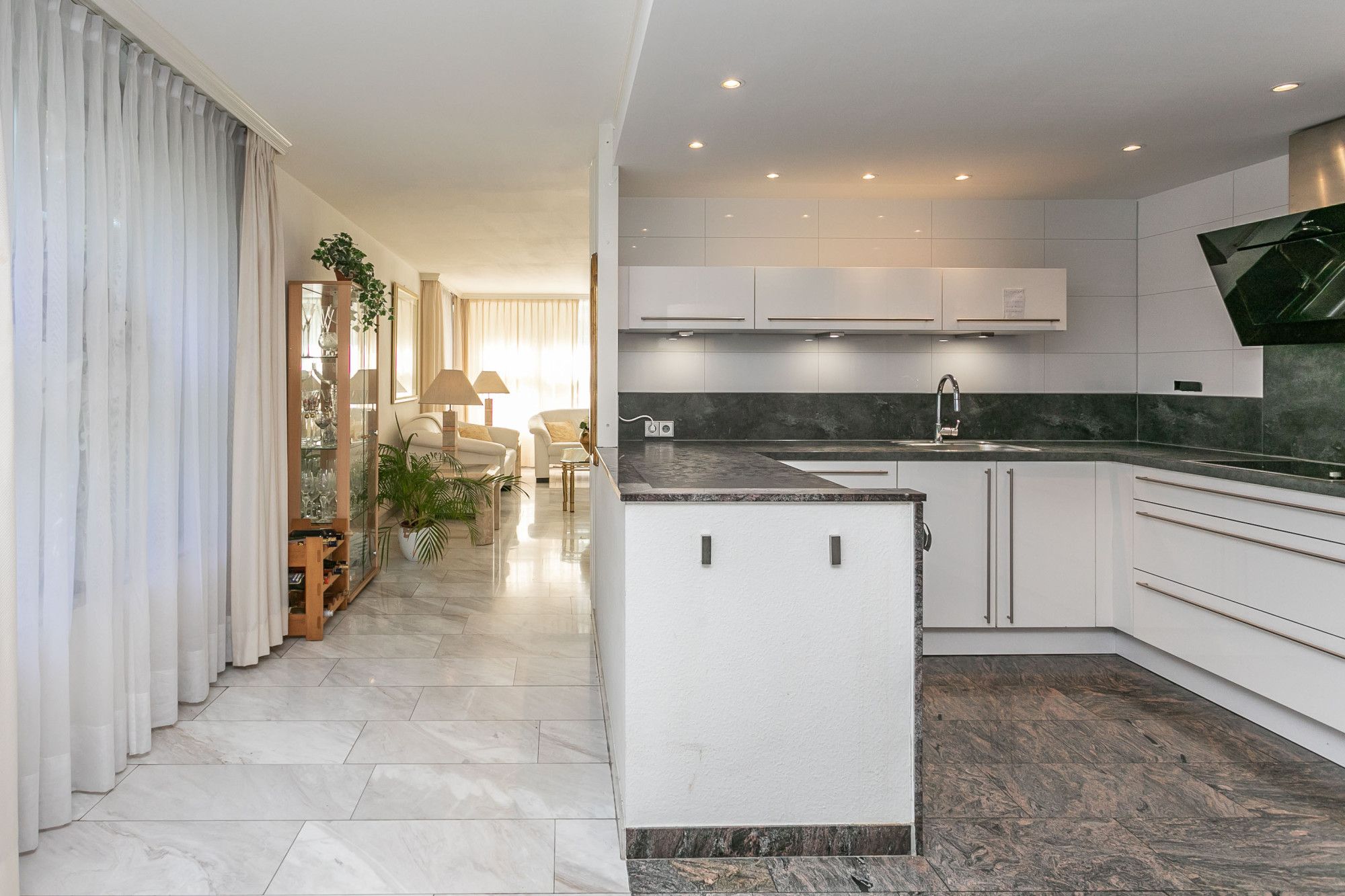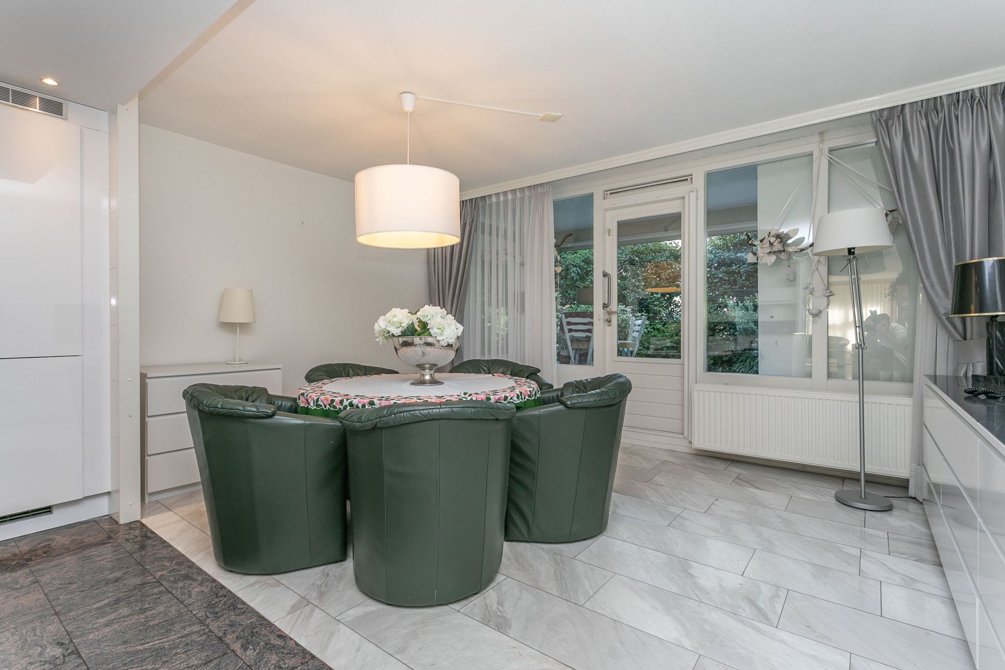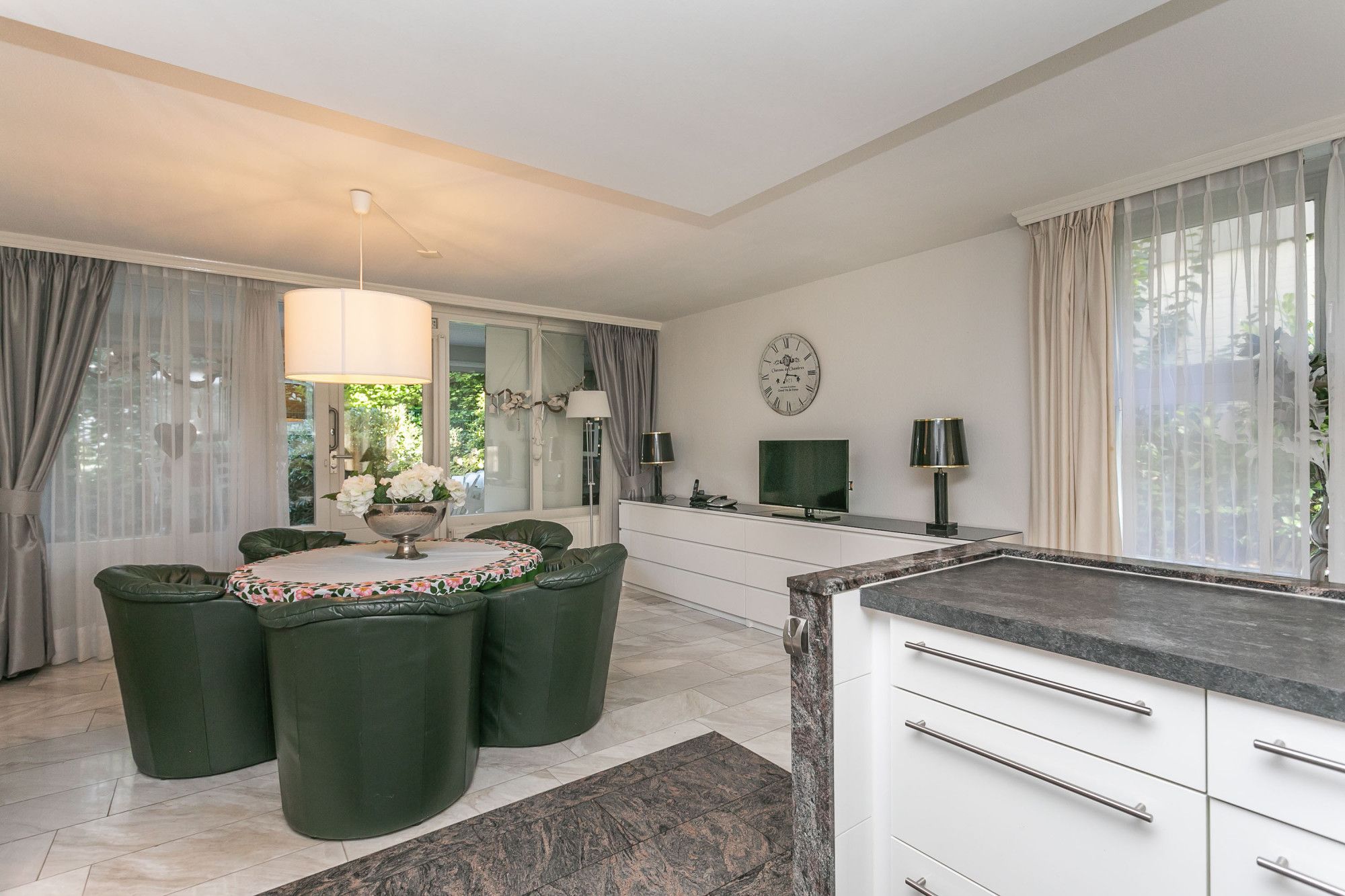 De ruimte loopt door naar de keuken, waar zich tevens een tweede eetgedeelte bevindt.