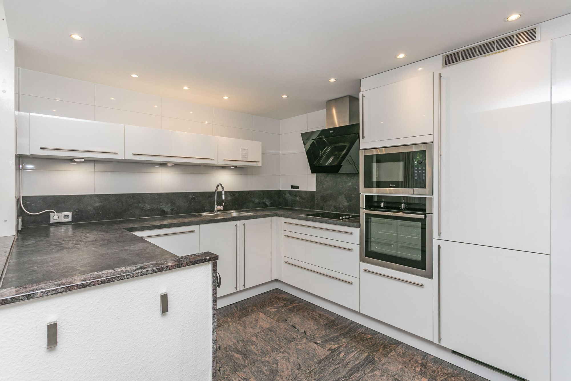 De keuken is stijlvol uitgevoerd met een granieten werkblad en bijpassende vloer en is voorzien van diverse inbouwapparatuur: vaatwasser, oven, magnetron, koelkast, 4-pits keramische kookplaat, afzuigkap en diepvries.