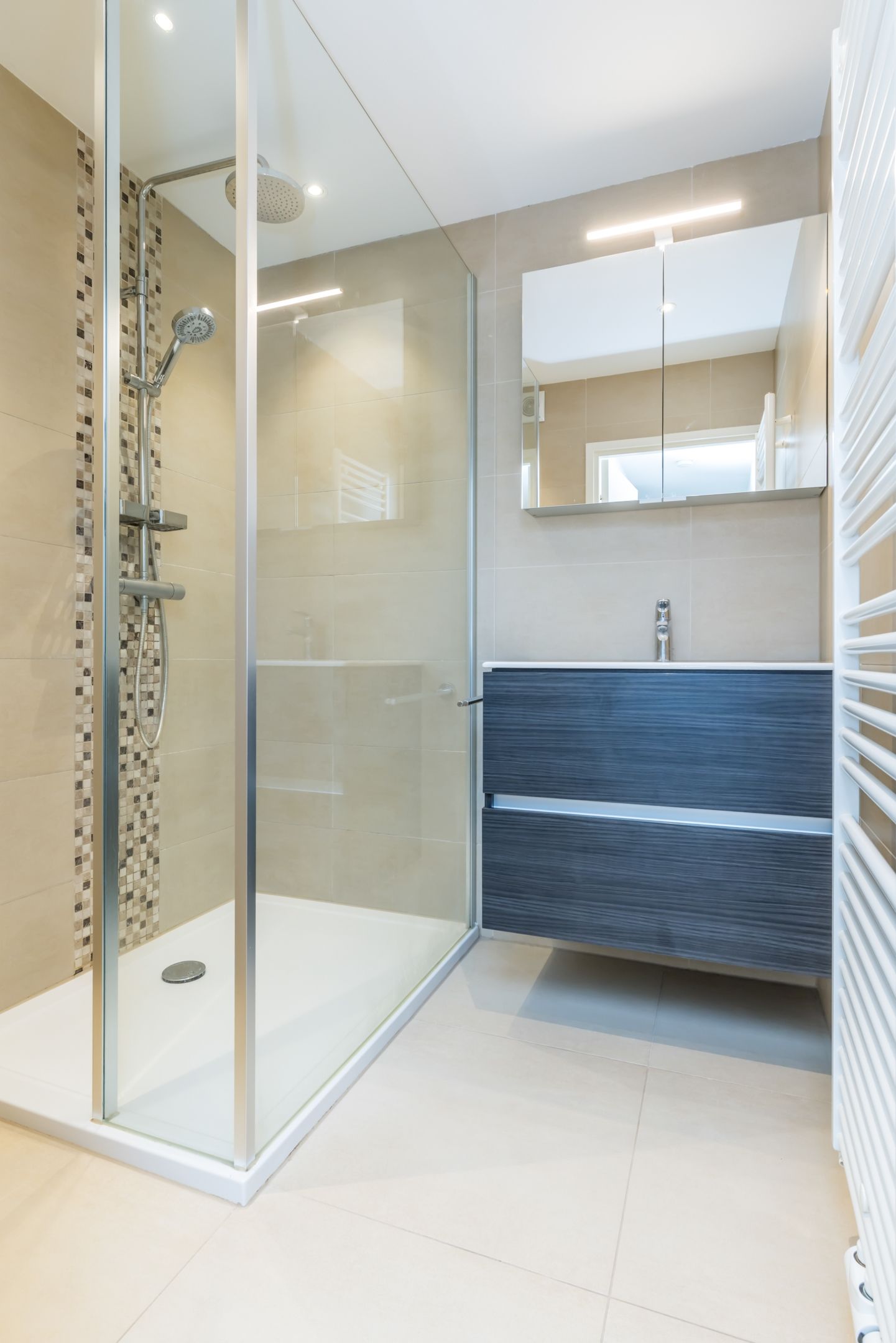 Vanuit de woonkamer en keuken heeft men toegang tot het balkon aan de achterzijde. Moderne badkamer 1.90/1.75, voorzien van een verlaagd plafond met inbouwspots en uitgerust met een inloopdouche, designradiator en een wastafel in een wandmeubel.