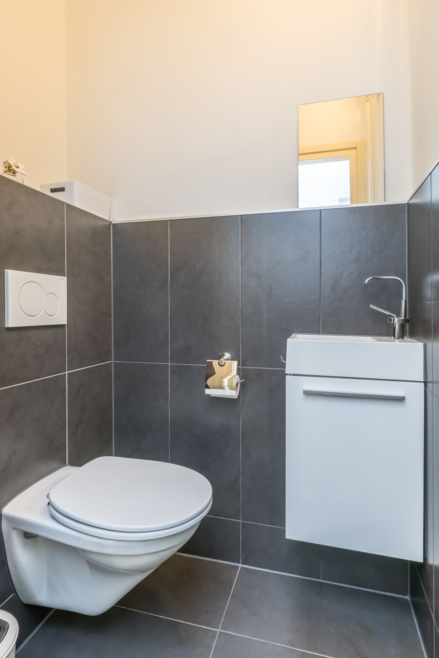 Entree- ruime hal met meterkast en moderne toiletruimte v.v. zwevend closet en fonteintje. Vanuit de hal heeft men toegang tot living, 2 slaapkamers en badkamer.