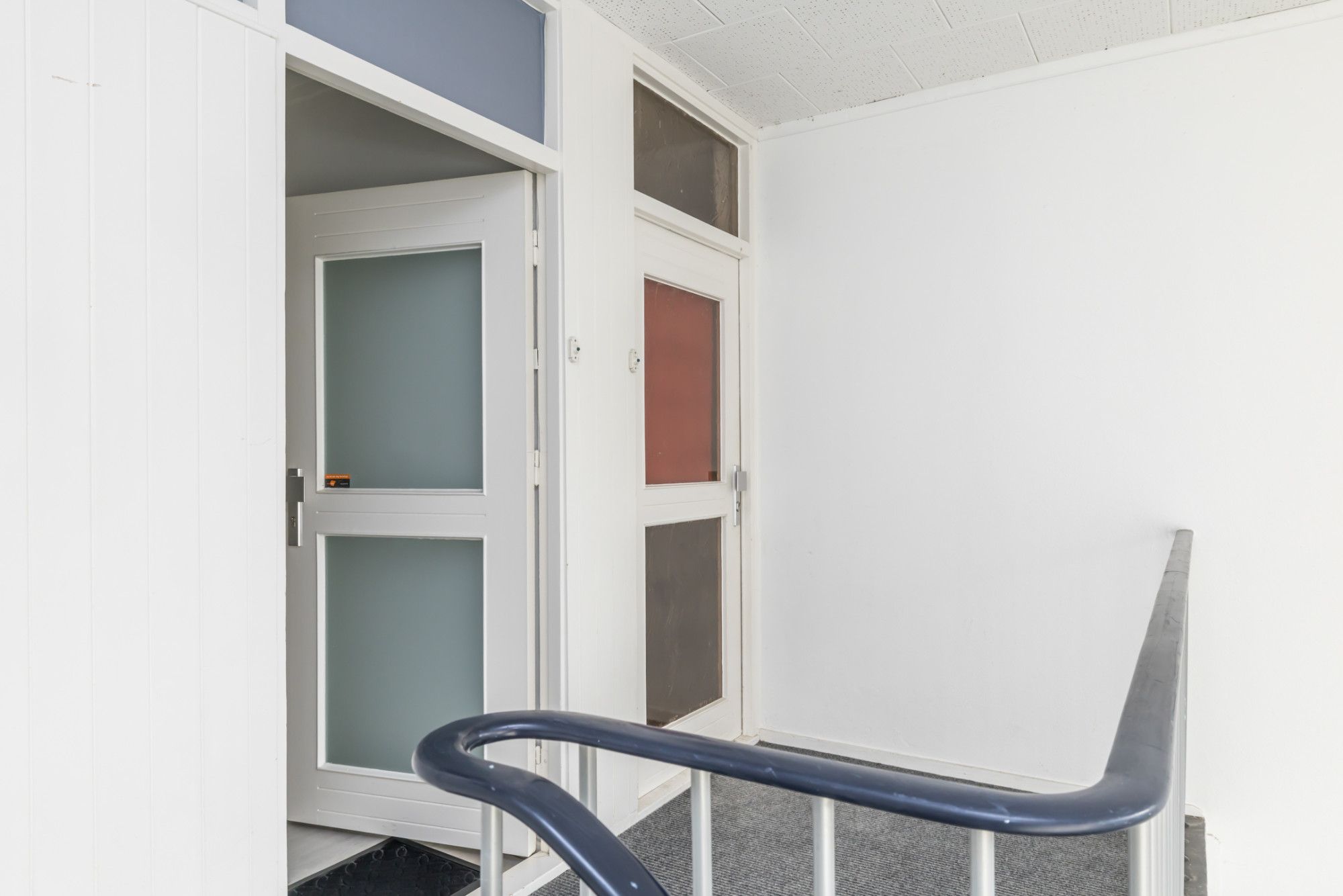 Gezamenlijke entree met bellentableau, brievenbussen en trappartij.