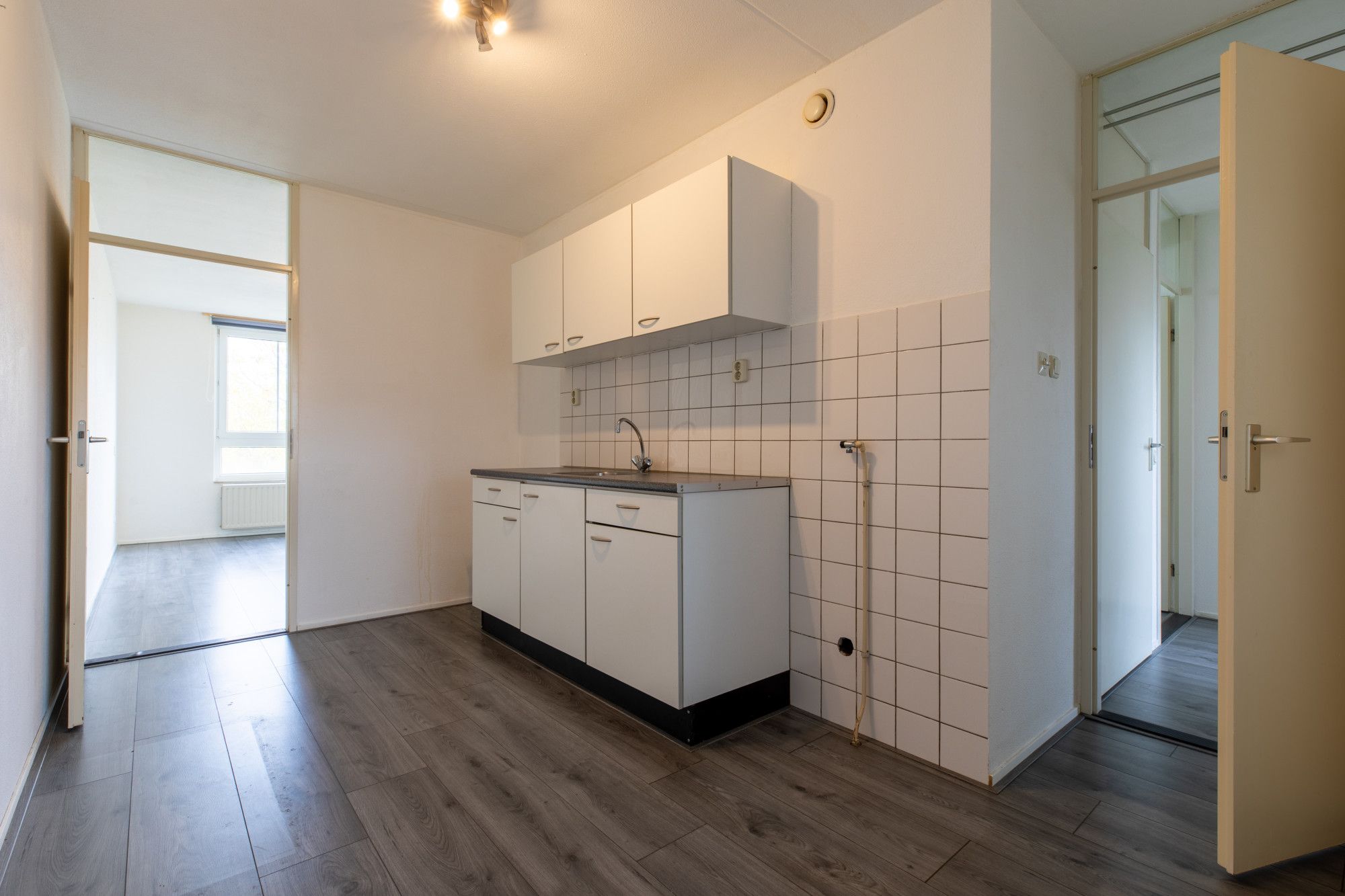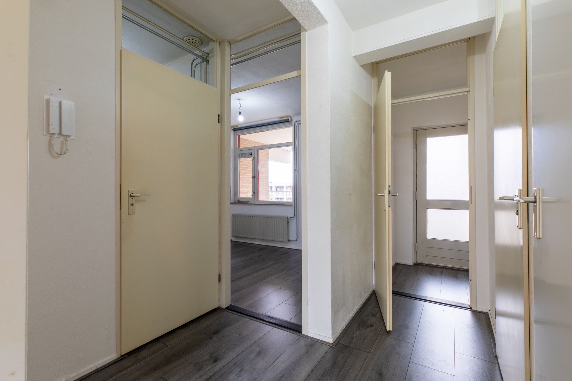 Via een galerij is het appartement te bereiken. Hal met doorloop naar de verschillende ruimten. Cv ruimte met Combi cv installatie (Nefit, eigendom). Separate keukenruimte voorzien van een eenvoudige keukeninstallatie. Woonkamer met toegang naar balkon. Badkamer met douche en wastafel. Inpandige berging. 2 slaapkamers