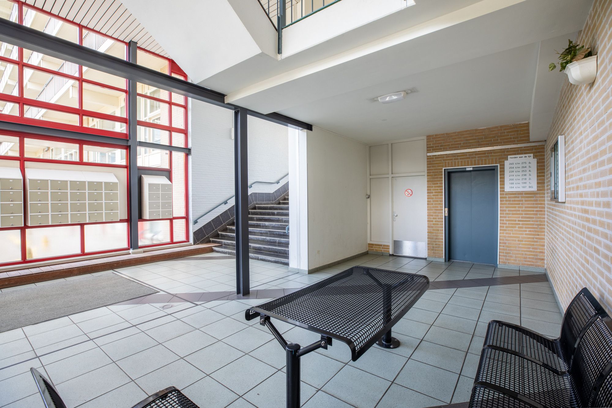 Prive berging. Centrale hal met bellentableau, intercom, trappenhuis en liftinstallatie.