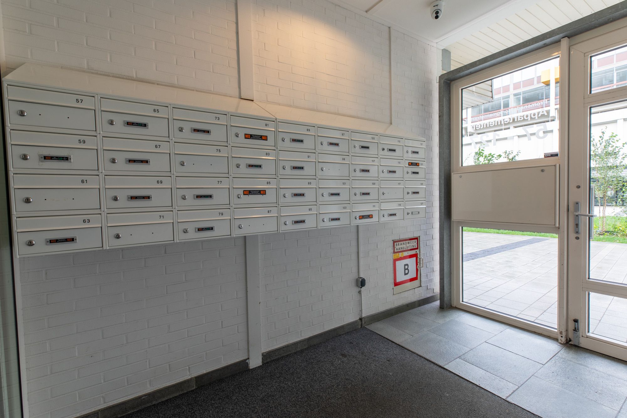 Centrale hal met brievenbussen, bellentableau, intercom, trappen en liftopgang.