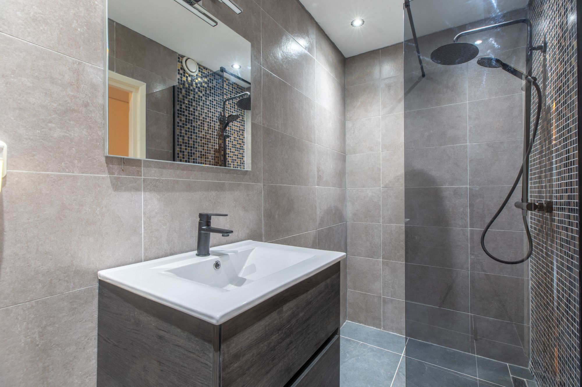 Badkamer (2.57 x 1.22 m) met inloopdouche, badmeubel met vaste wastafel en witgoedaansluting.