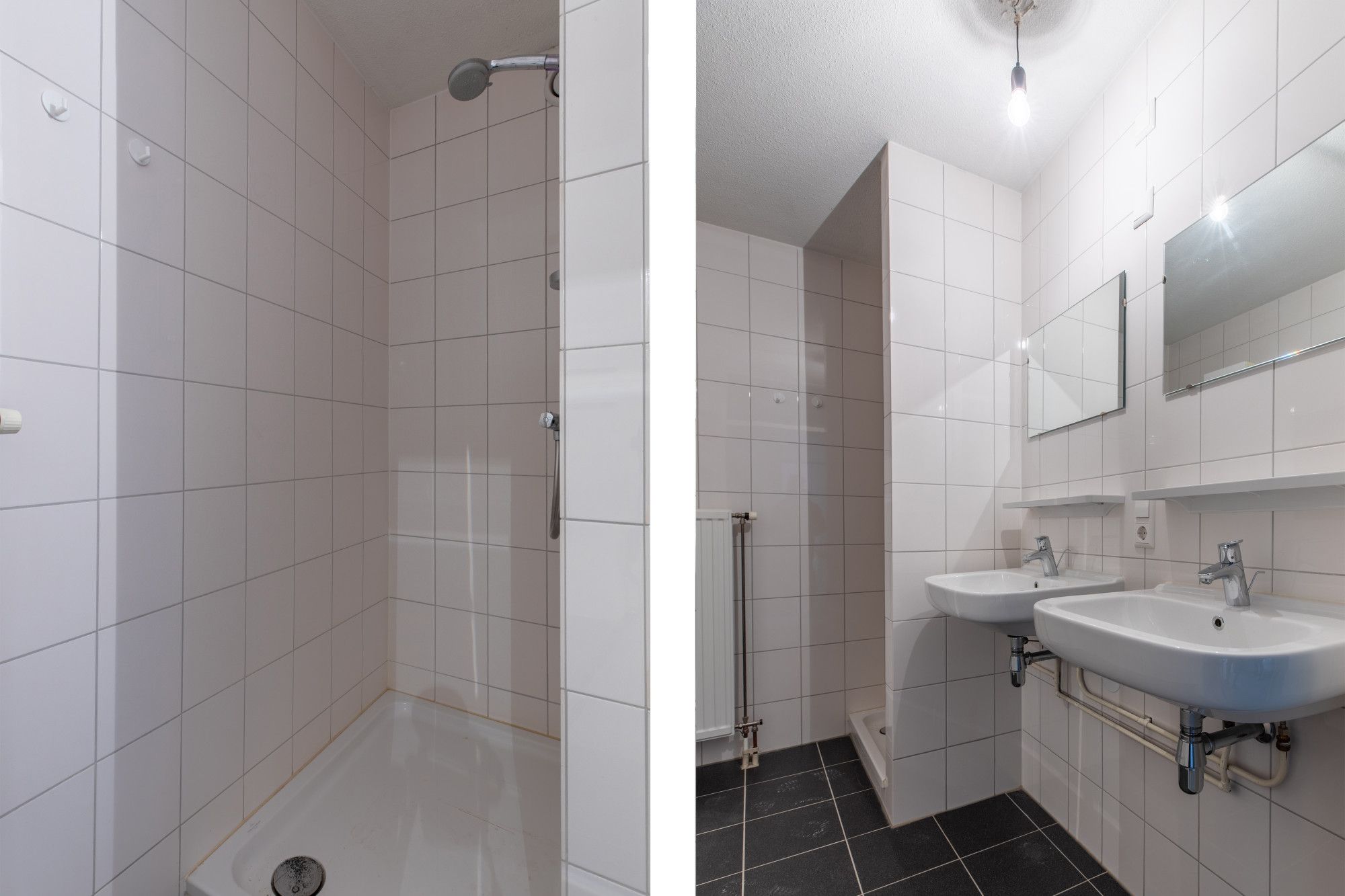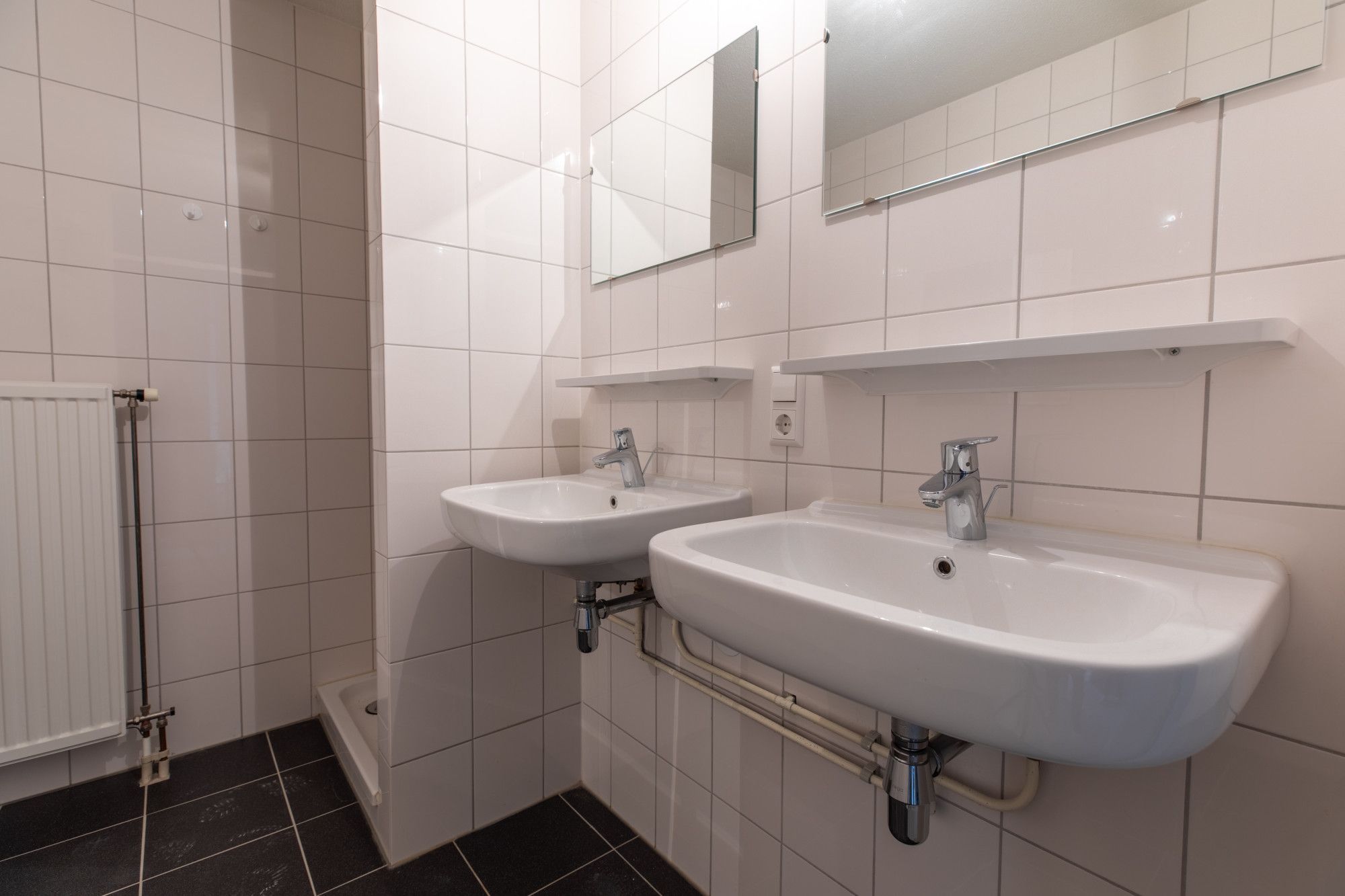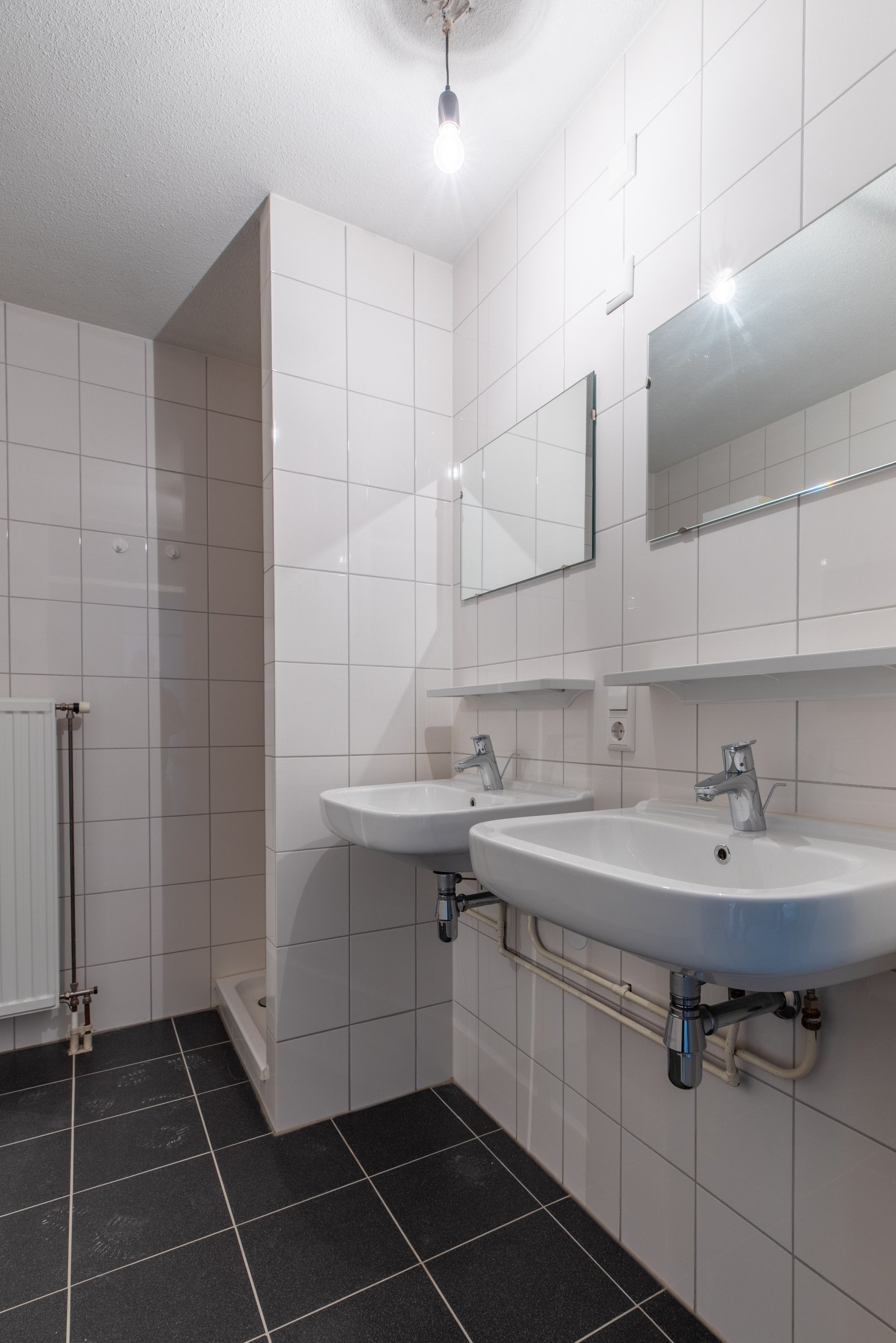 Geheel betegelde badkamer (2.32 x 1.71 m) met douche en dubbele vaste wastafel.
