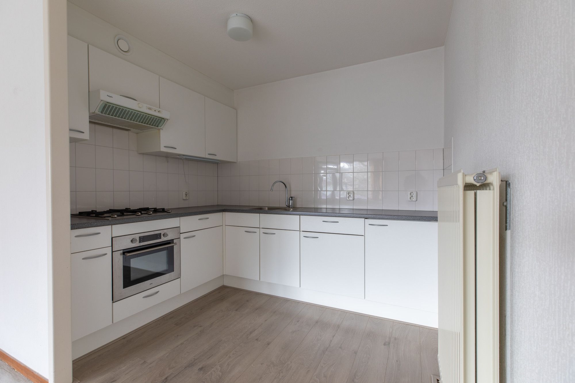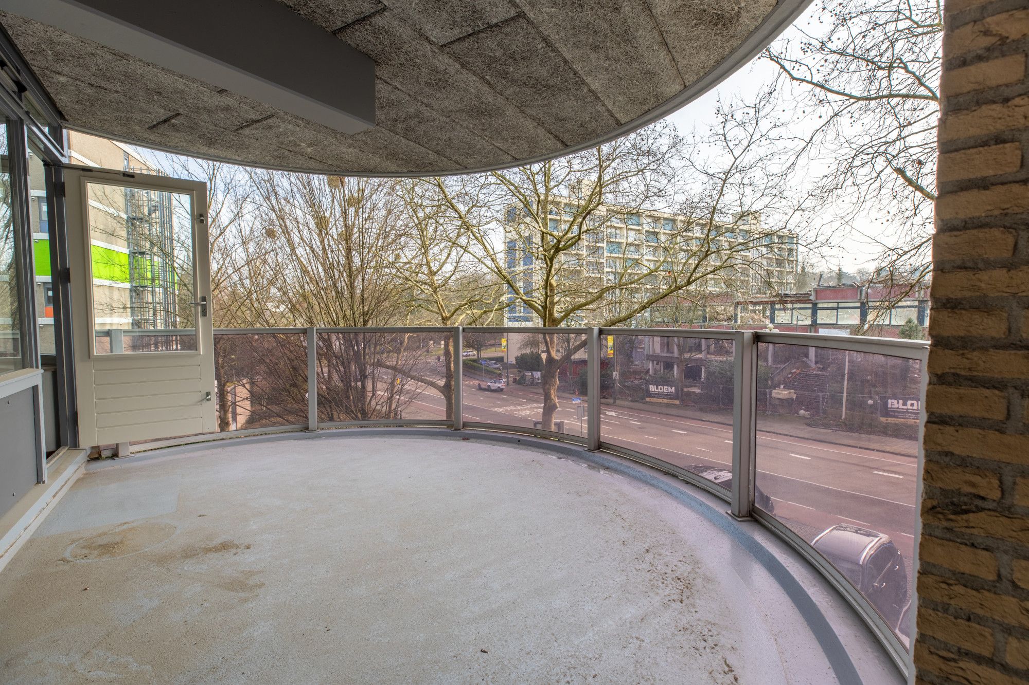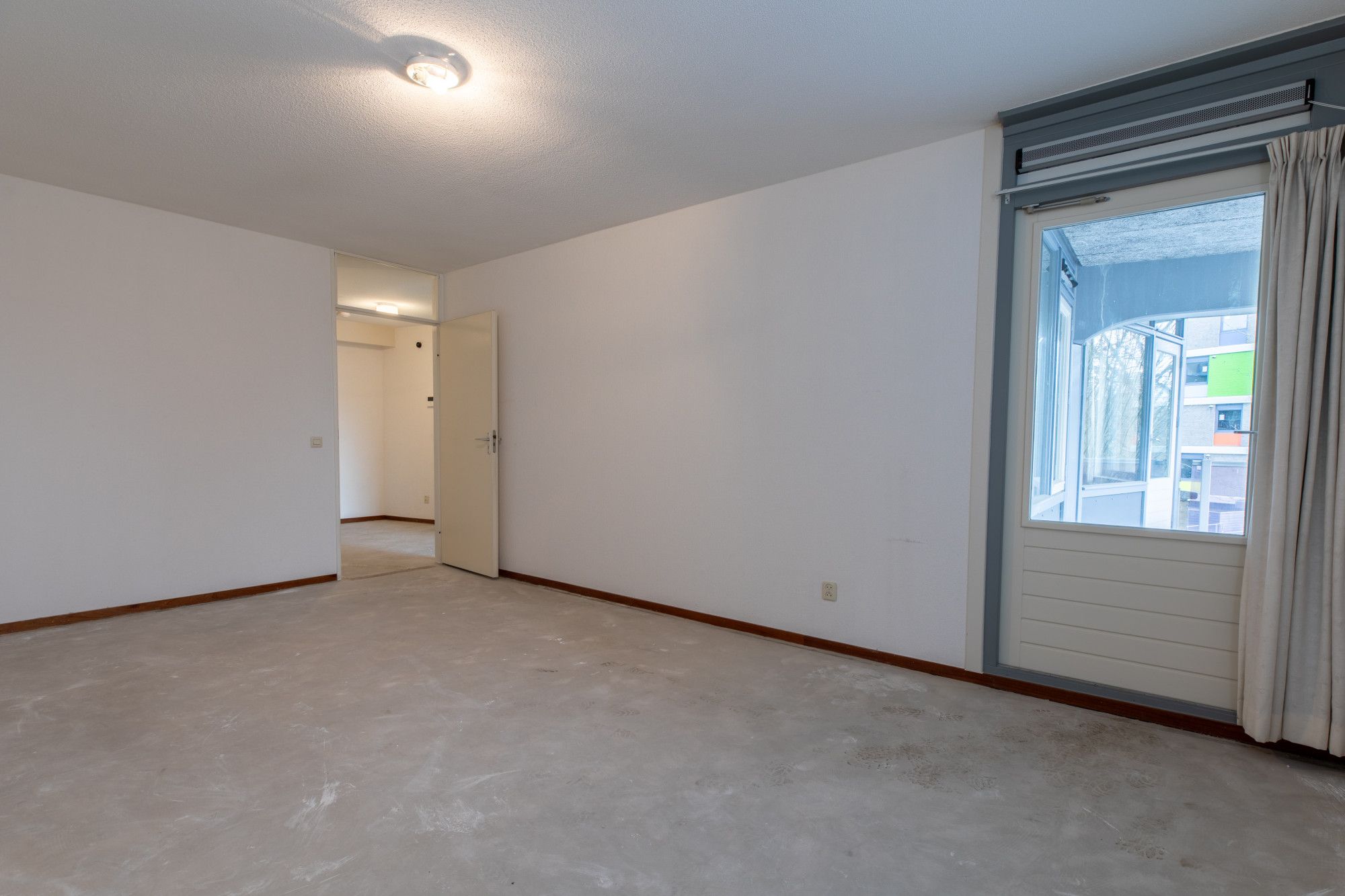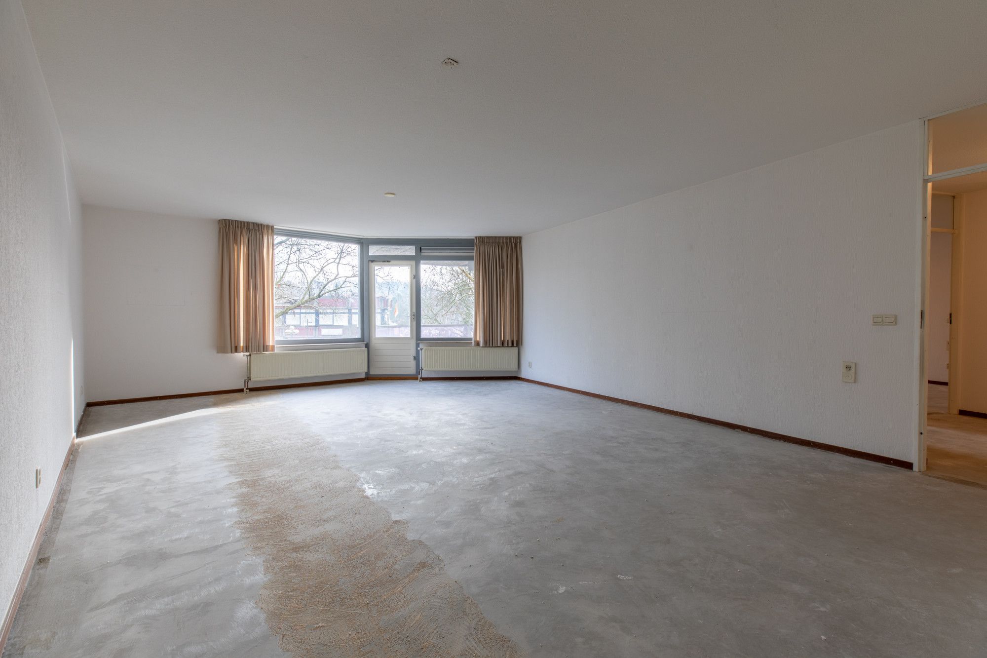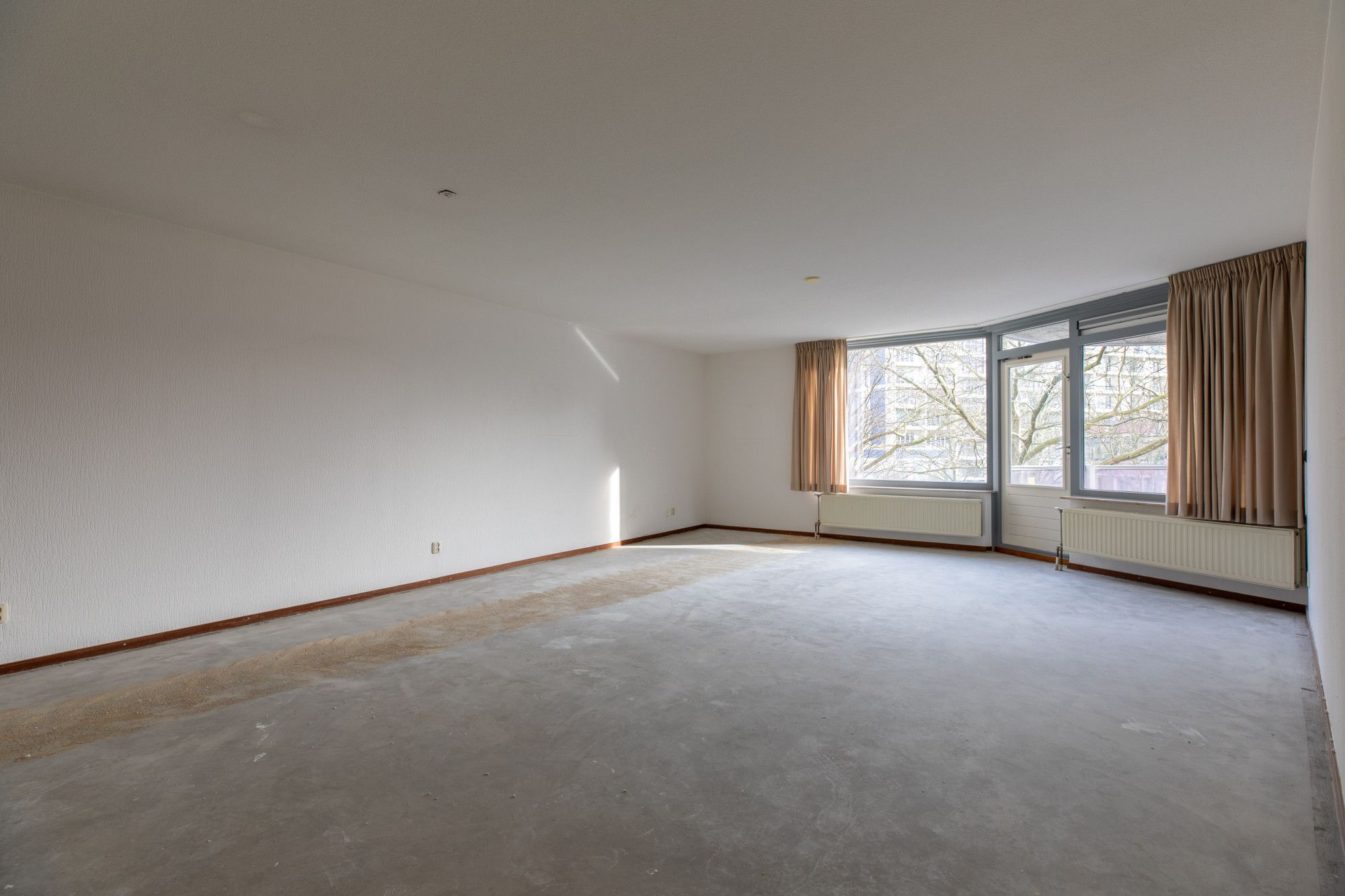 Riante woonkamer (9.86 x 4.58 m) met toegang naar de half-open keuken en voorzien van laminaatvloer. Tevens toegang naar het balkon (3.92 x 3.48 m) met zonnig uitzicht op de Putgraaf.