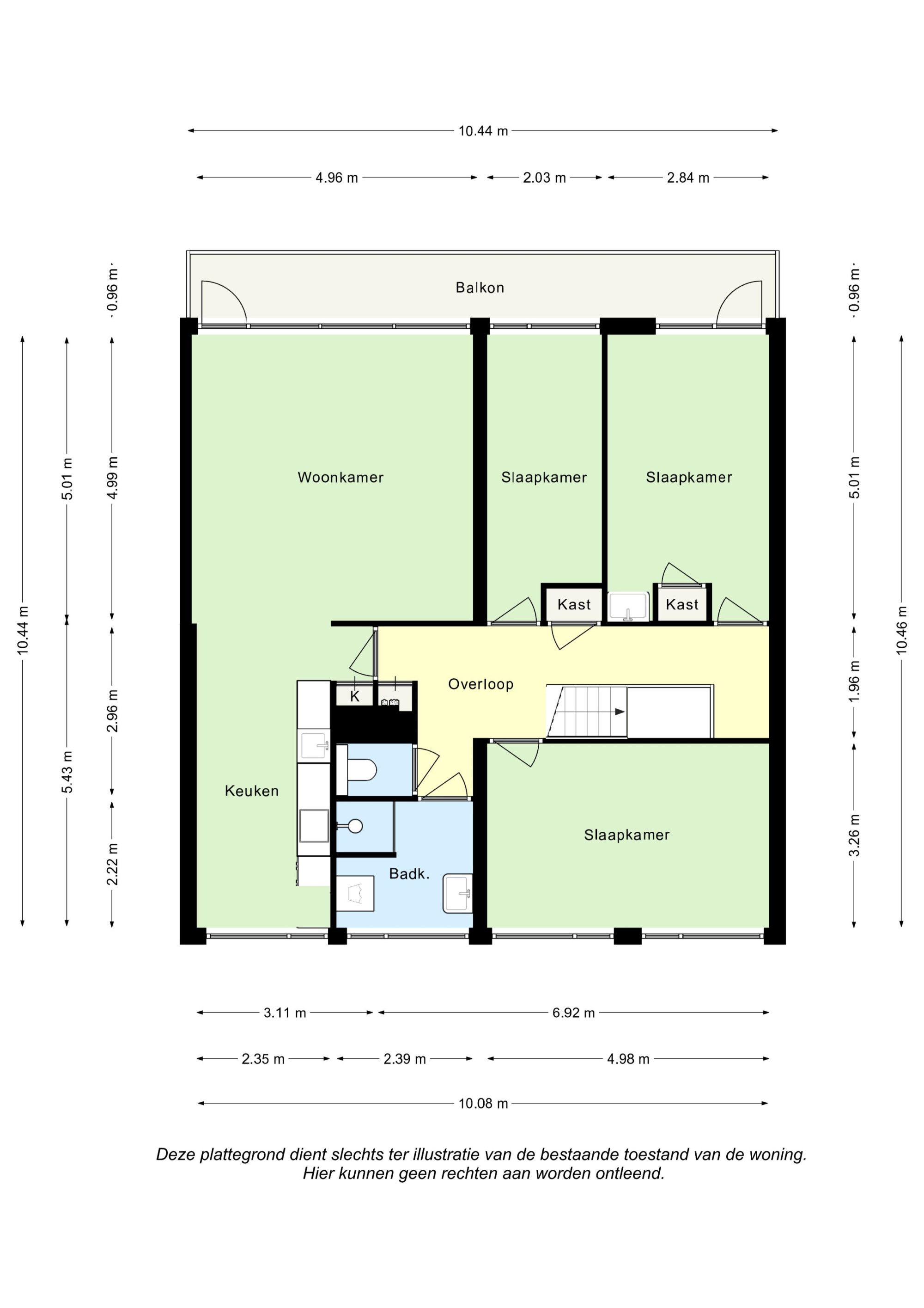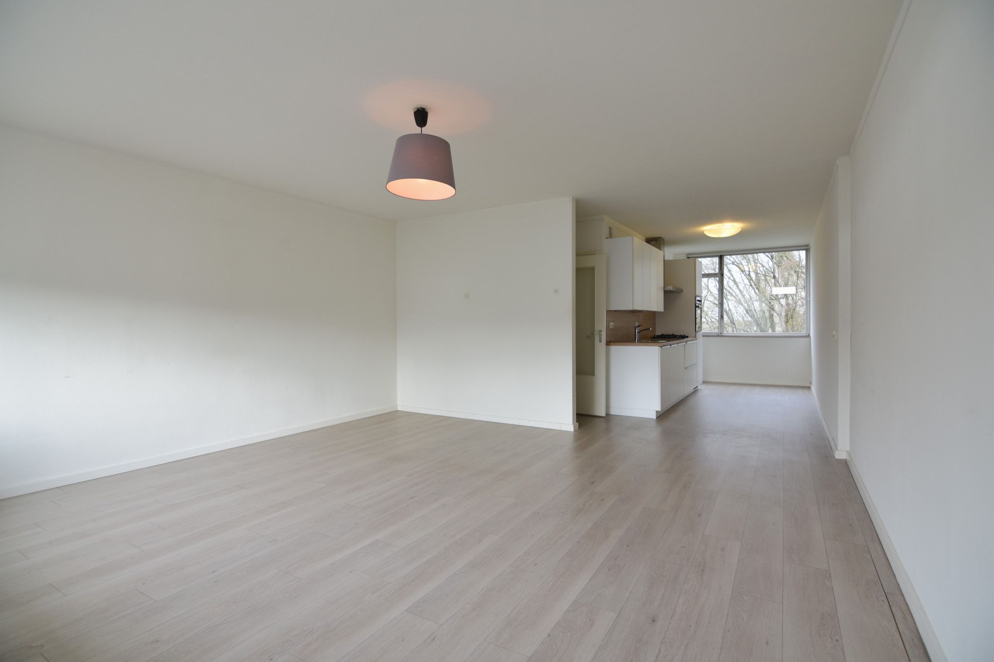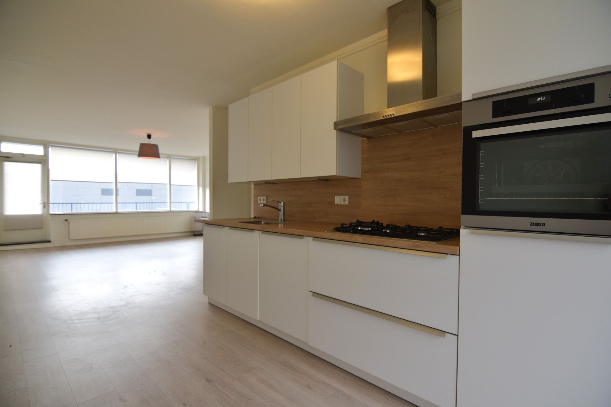 Living (4,99 m x 4,96 m) met toegang tot balkon over de gehele breedte (10,44 m x 0,96 m) heeft een open verbinding naar de keuken. De open keuken (5,43 m x 2,35 m) met installatie en apparatuur t.w.: vaatwasser, 4-gaskookplaat, afzuigkap, combi oven en koelkast.