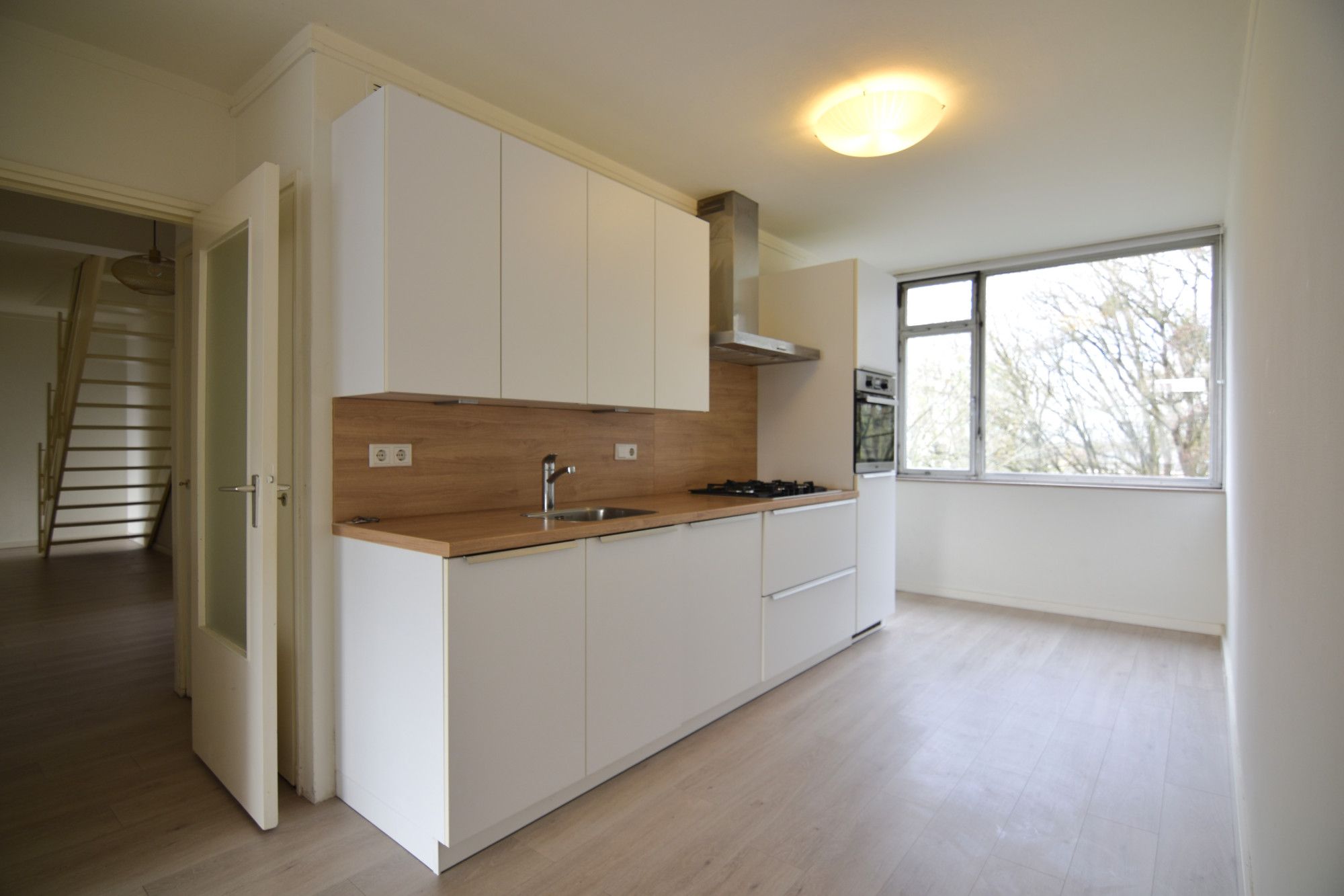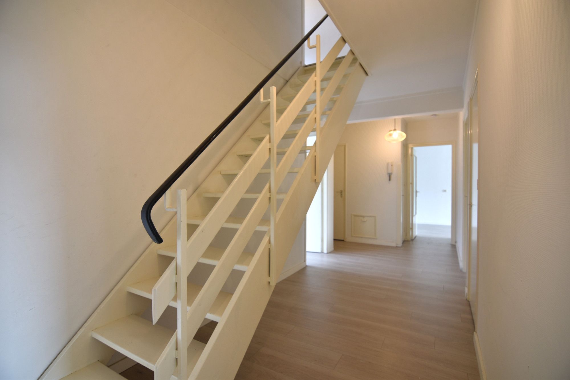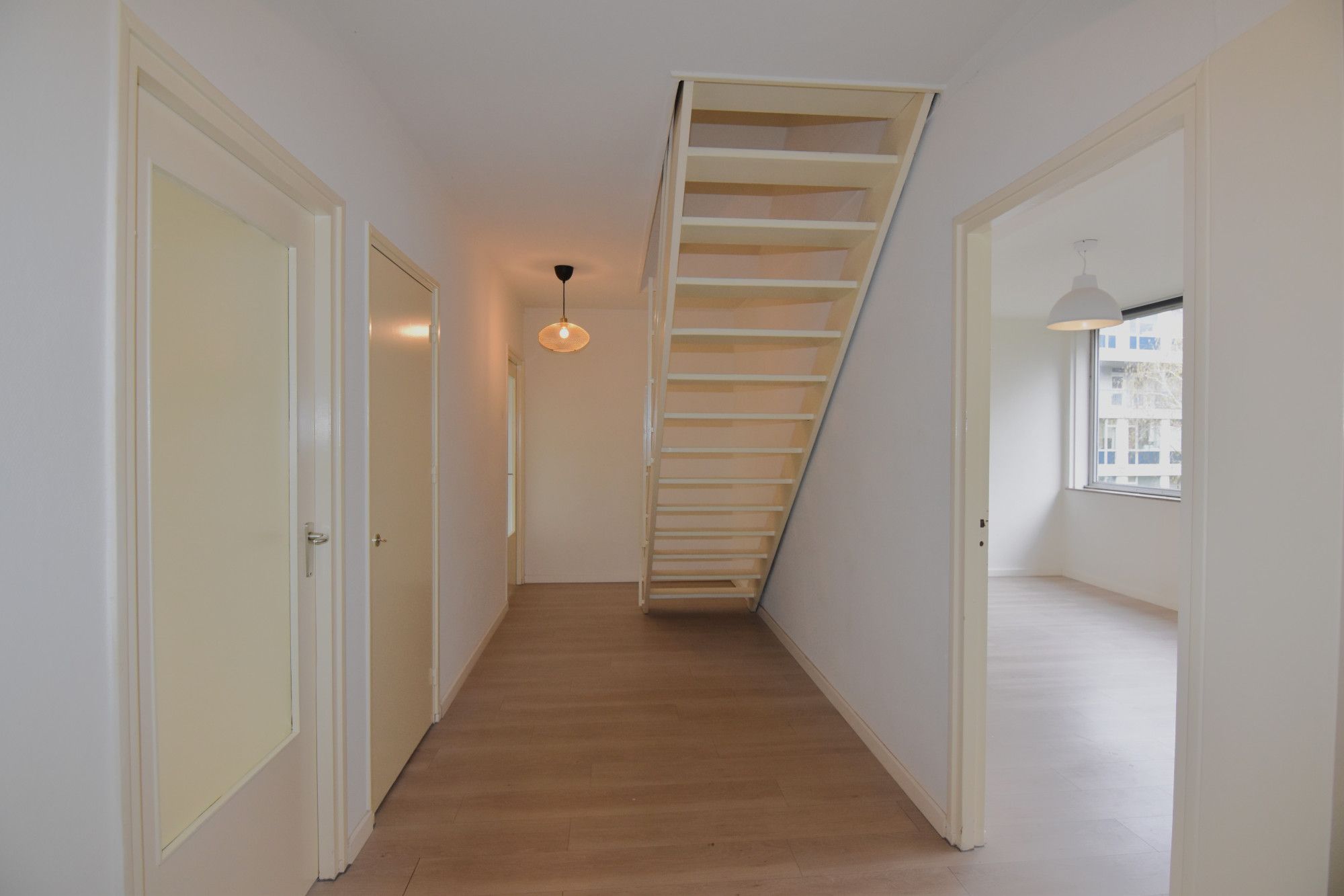 Middels de galerij bereikt men de entree van het appartement. Via een trap naar beneden wordt de woonverdieping bereikt. De overloop/ hal biedt toegang de 3 slaapkamers, badkamer, living en separaat toilet.