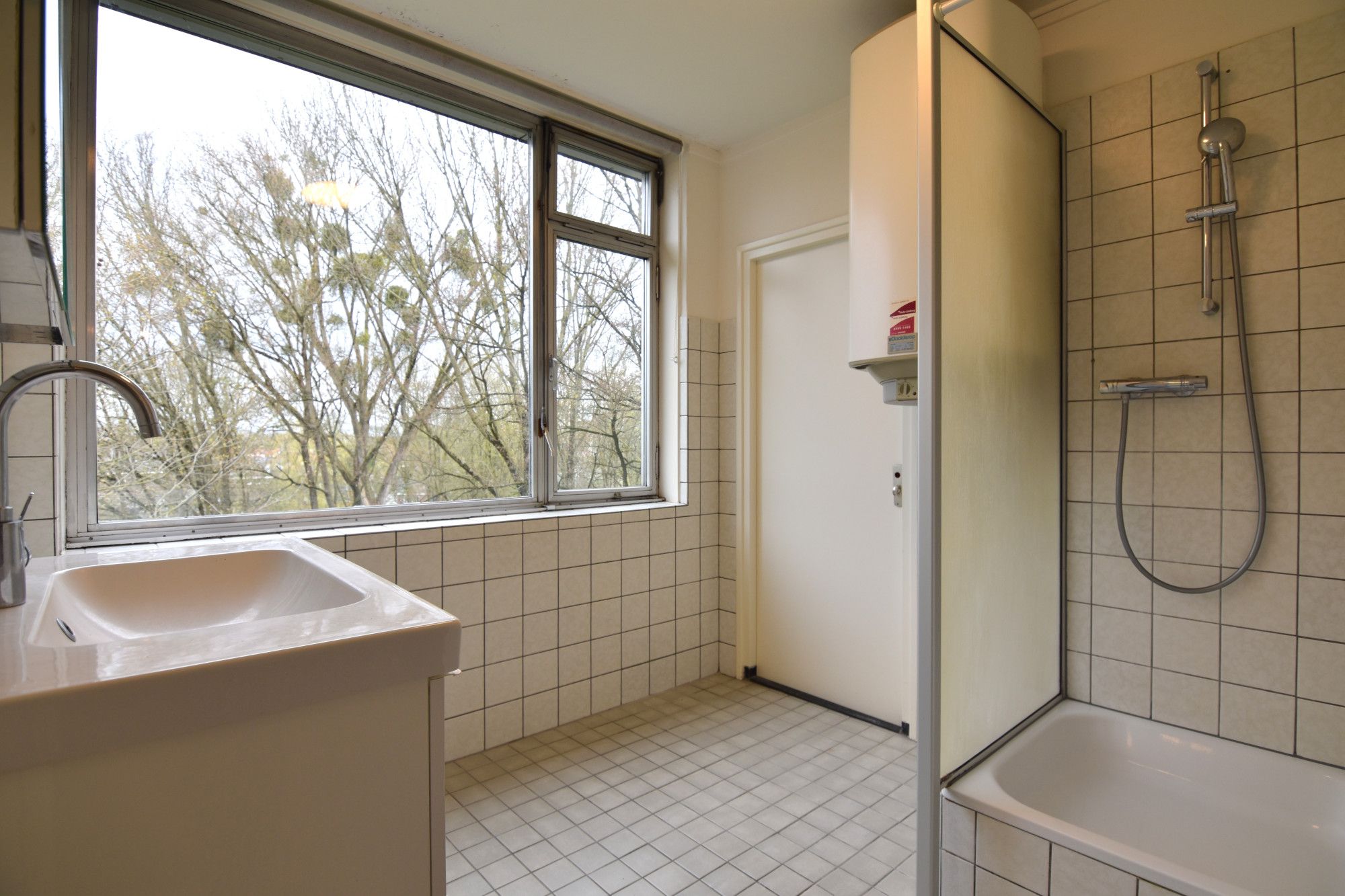 De badkamer (2,39 m x 2,32 m) v.v. douche en vaste wastafel, tevens heeft men aansluiting voor witgoedapparatuur.