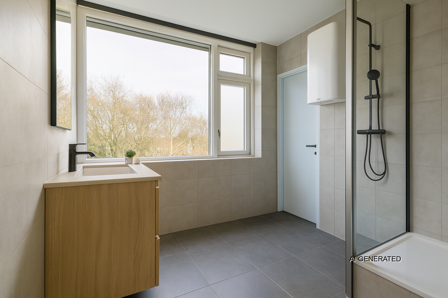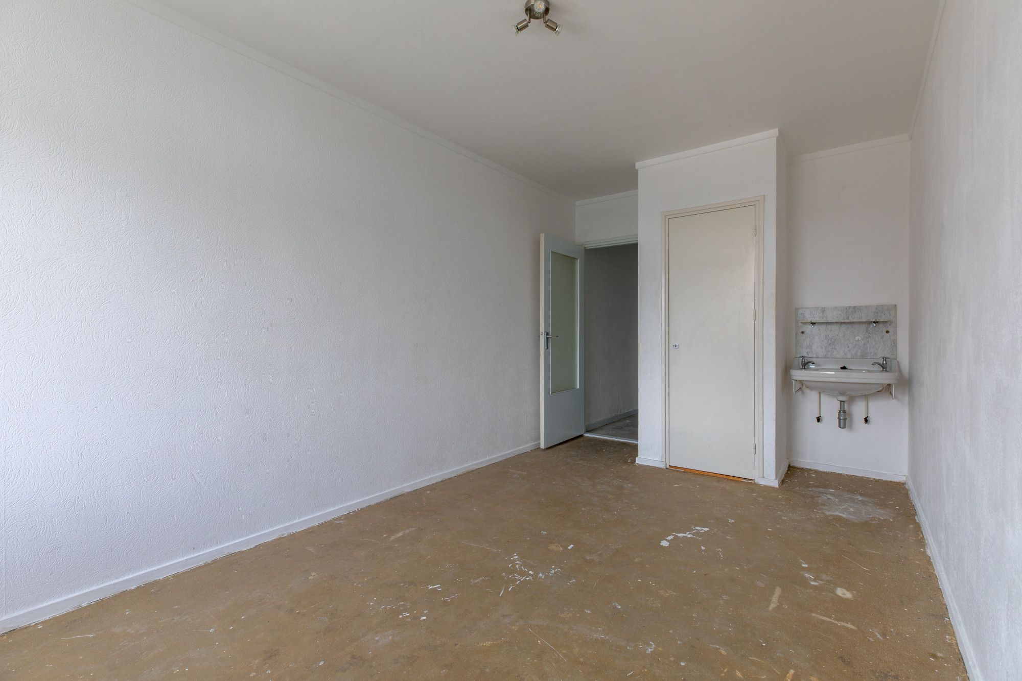 Badkamer met douche, vaste wastafel en de witgoed aansluitingen t.b.v. wasautomaat