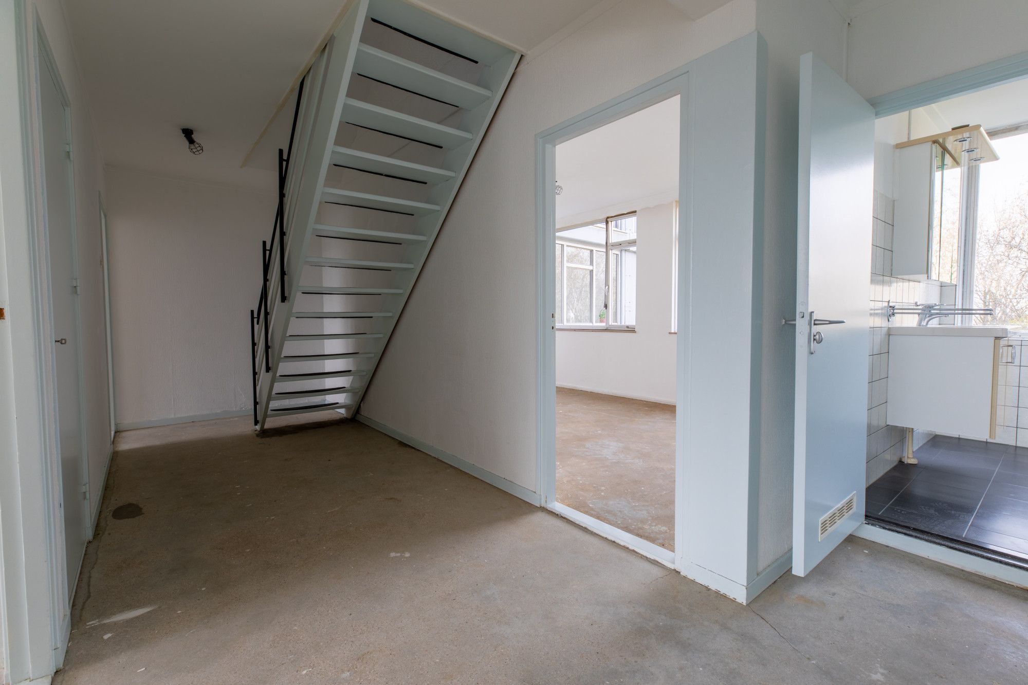 Entree, hal met trap naar beneden gelegen appartement met garderobenis.