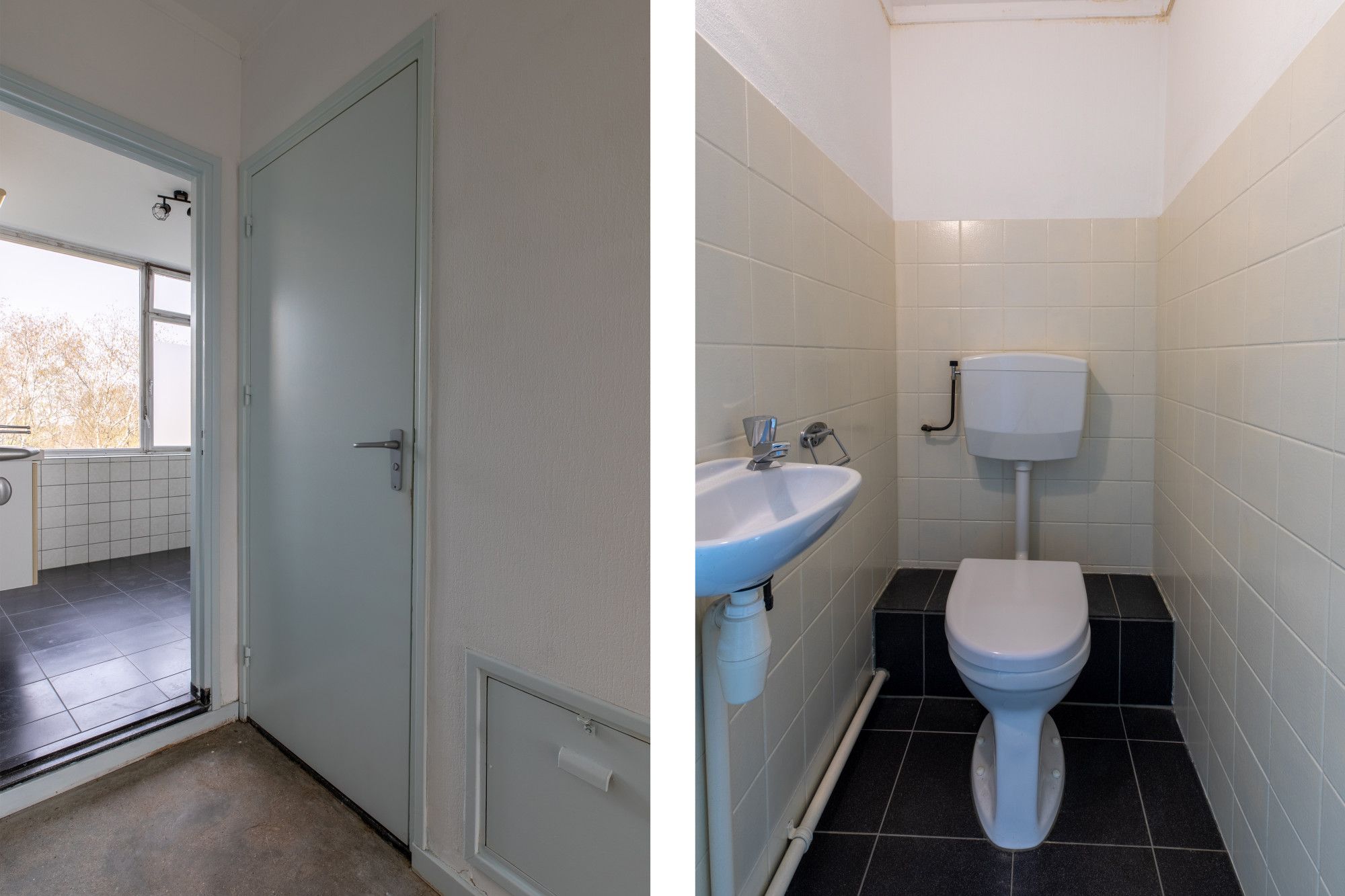 Deels betegelde toiletruimte voorzien van duo closet toilet en fonteintje.