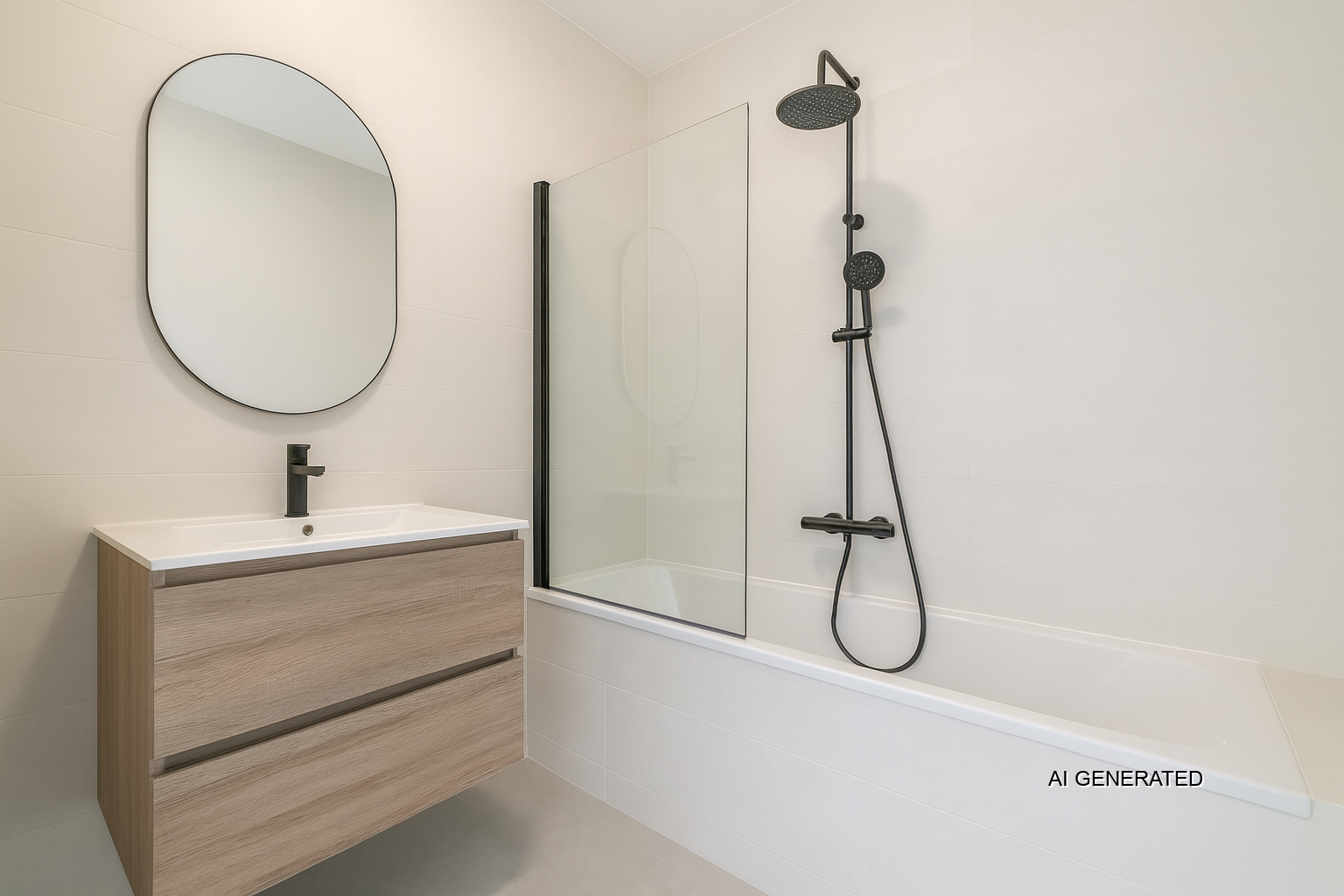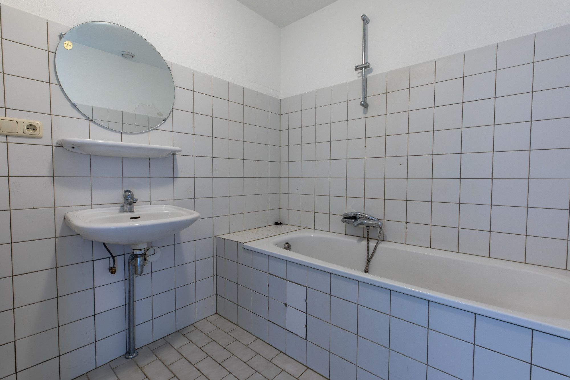 Geheel betegelede badkamer (2.04 x 1.92 m) met bad en vaste wastafel.