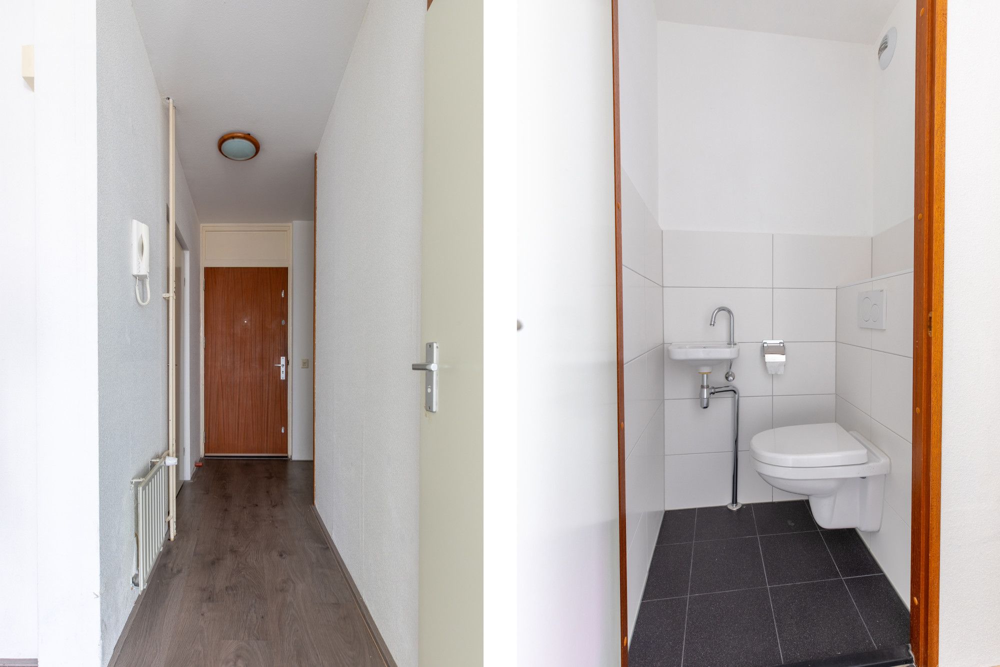 Ontvangsthal met deels betegelde toiletruimte met toilet en fonteintje.