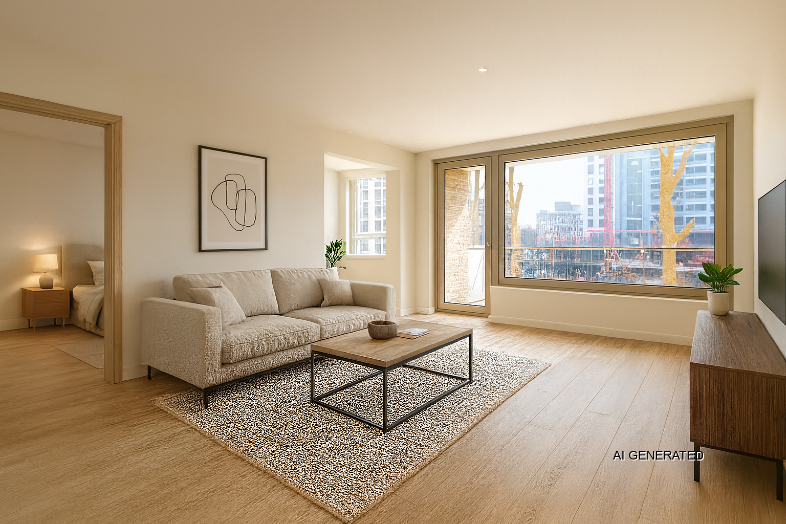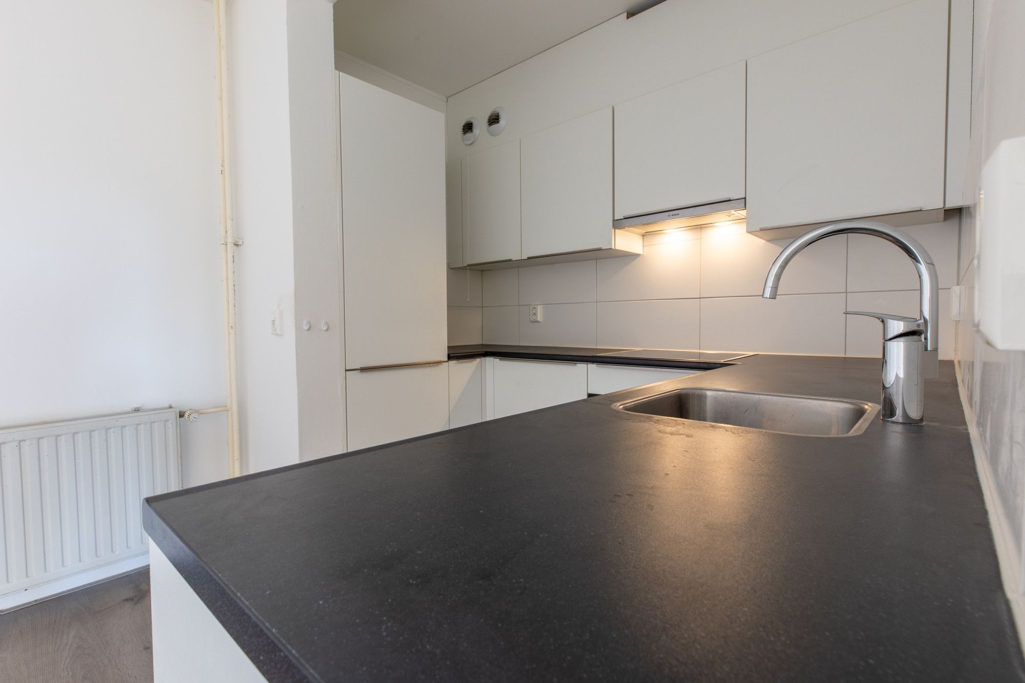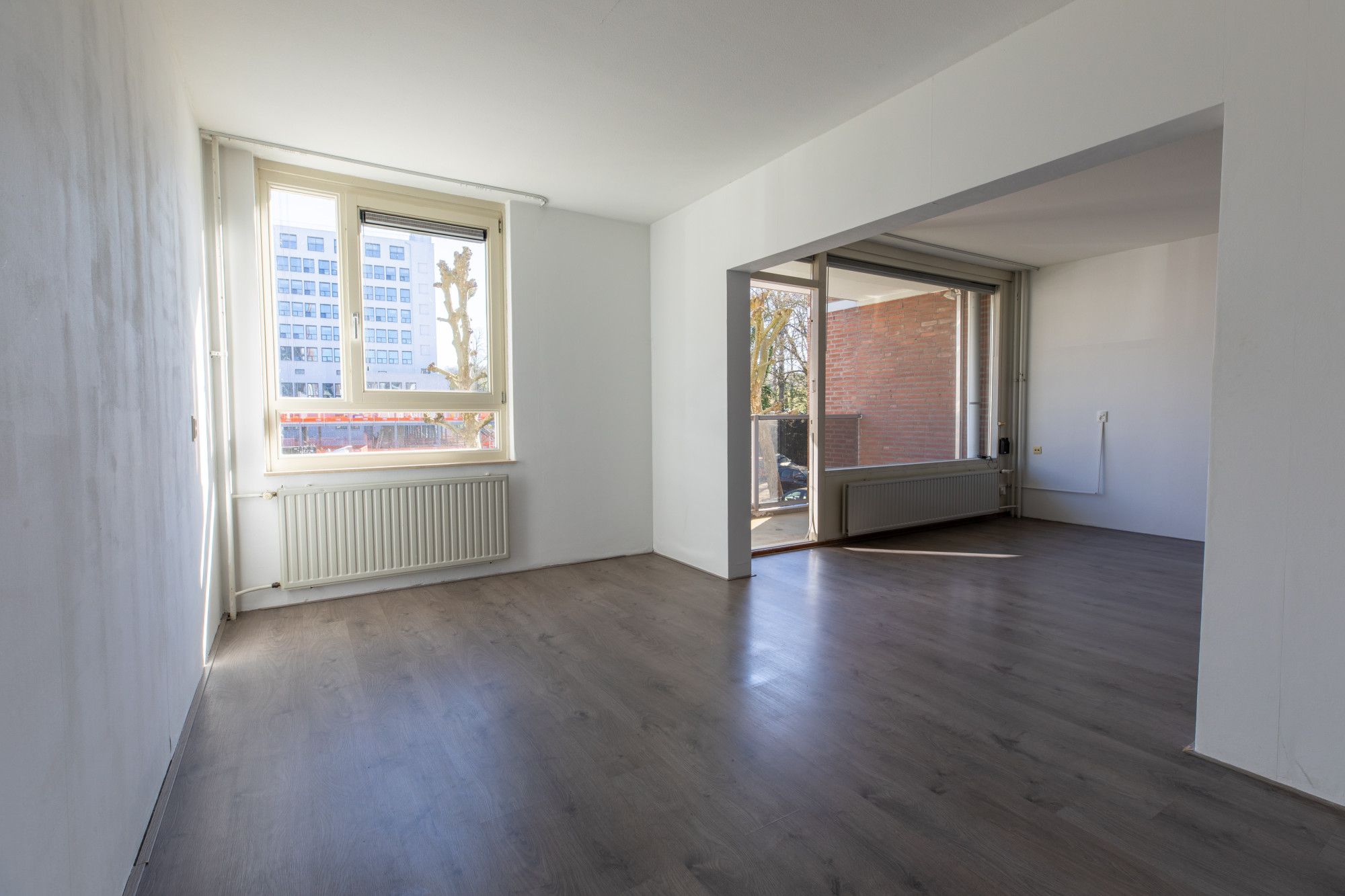 Ruime woonkamer met toegang naar balkon. Halfopen keuken voorzien van een moderne keukeninstallatie. Twee slaapkamers.