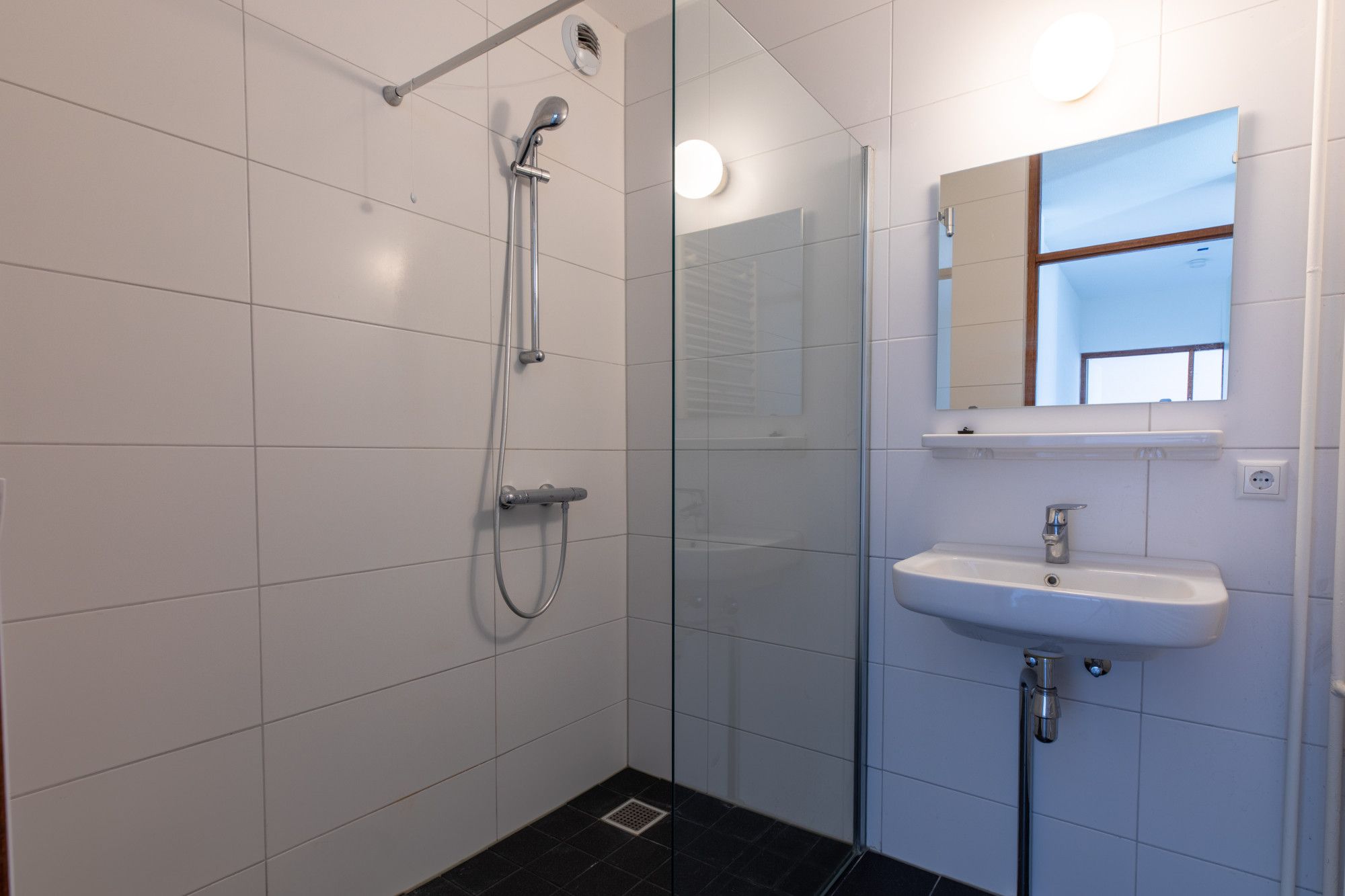 Badkamer met inloopdouche en vaste wastafel.