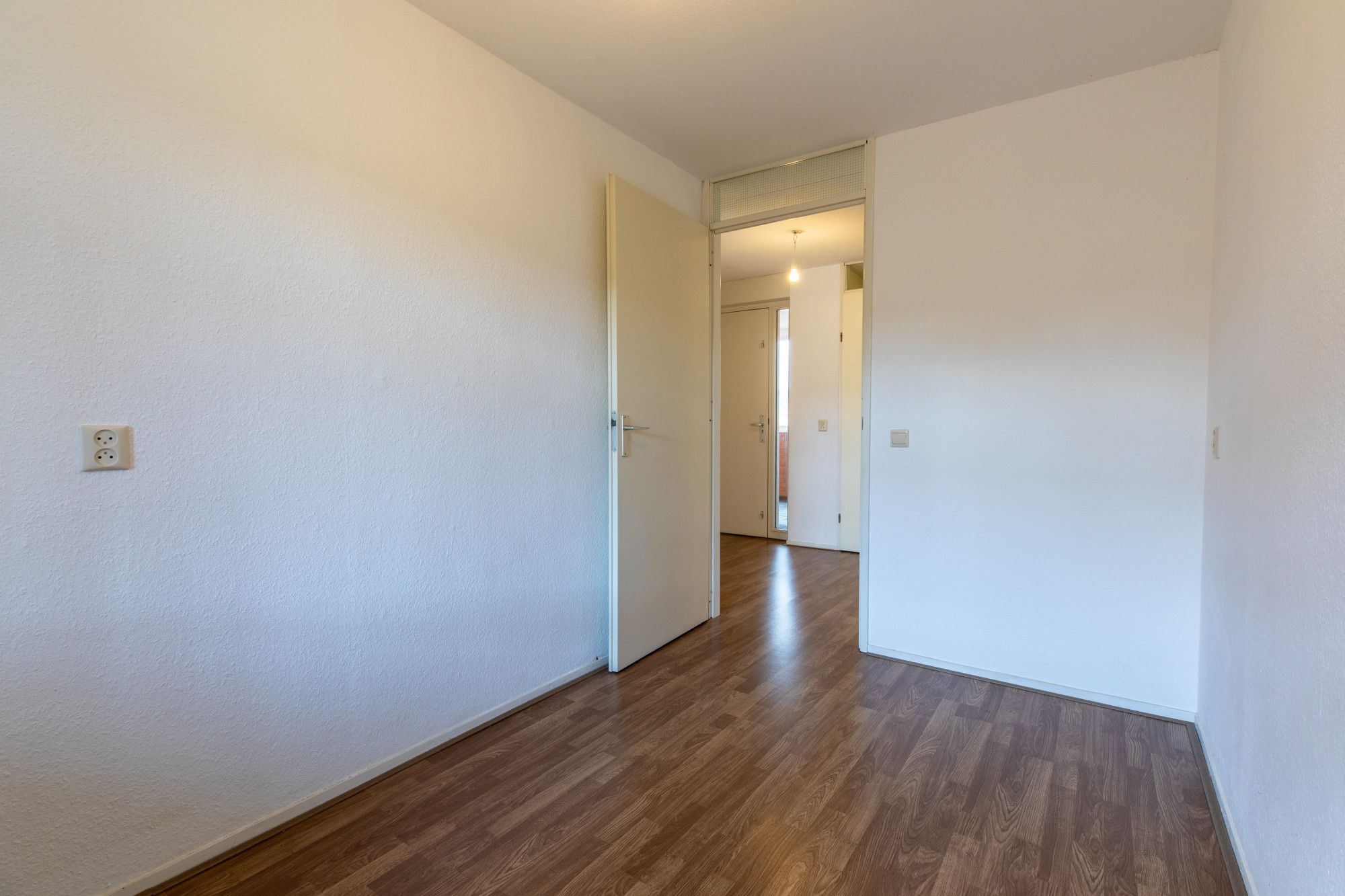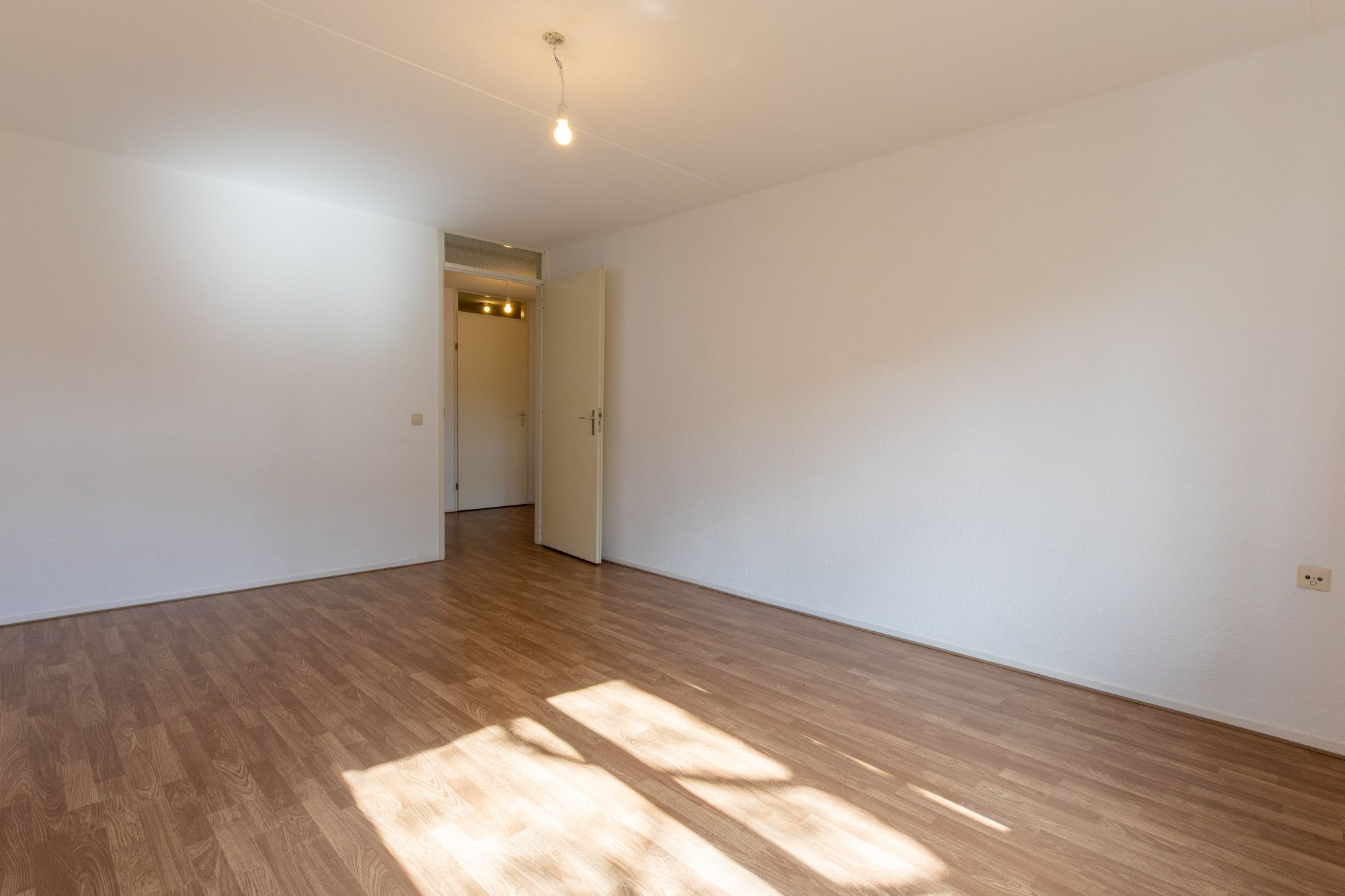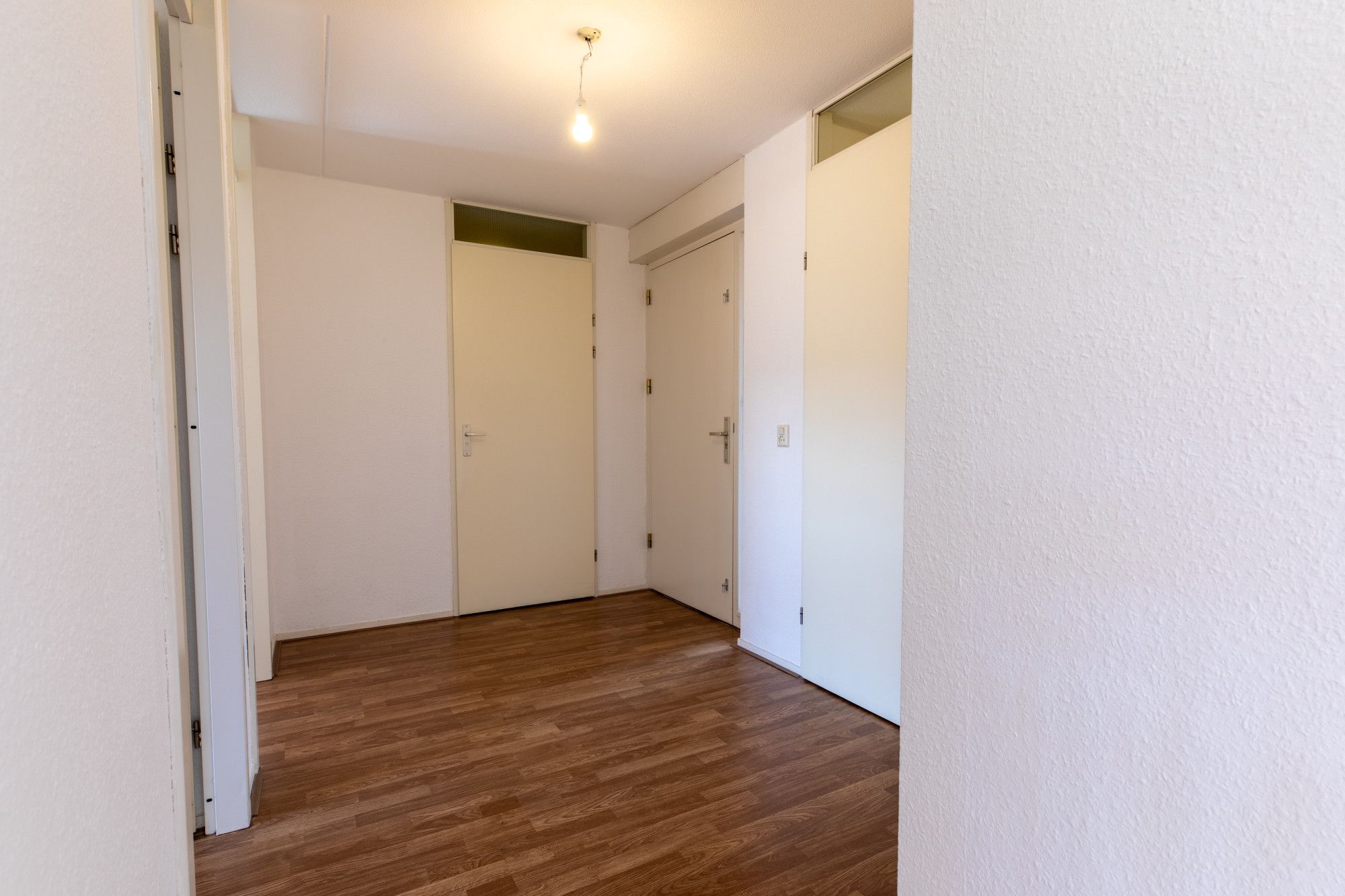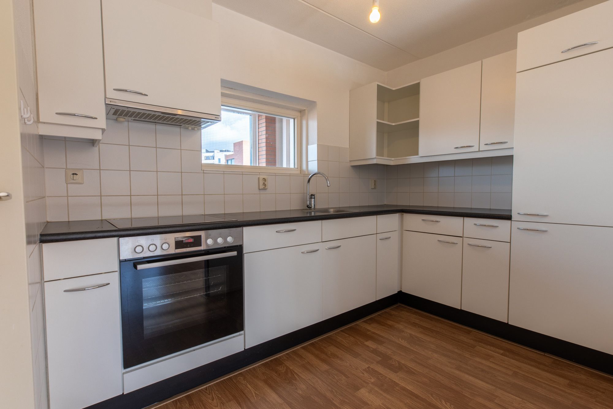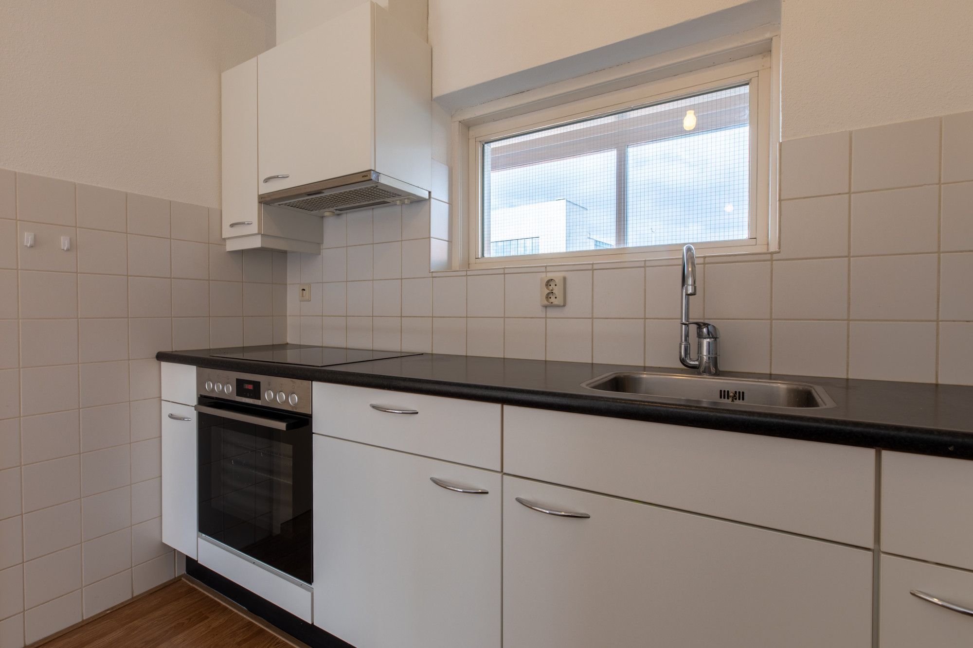 Entree met toegang tot de hal met doorlopende laminaatvloer en deels betegelde toiletruimte met duoblok en fonteintje. Ruime lichte woonkamer (6.17 x 4.75/4.11 m - totaal circa 27 m²) in open verbinding met de keuken (2.99 x 2.01 m) voorzien van keukeninstallatie in hoekopstelling met diverse onder- en bovenkasten, inbouwapparatuur te weten: 4-pits keramische kookplaat, afzuigkap, oven en koelkast. Bijkeuken/berging alwaar wasautomaat- en drogeraansluiting. Vanuit de kamer toegang tot het zonnig gelegen balkon (2.52 x 1.35 m).
