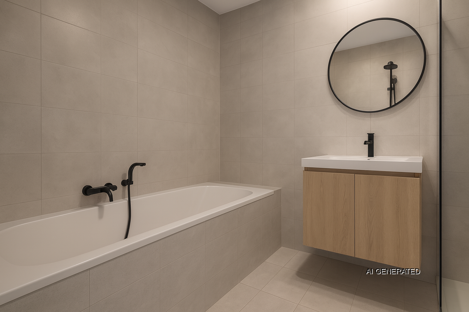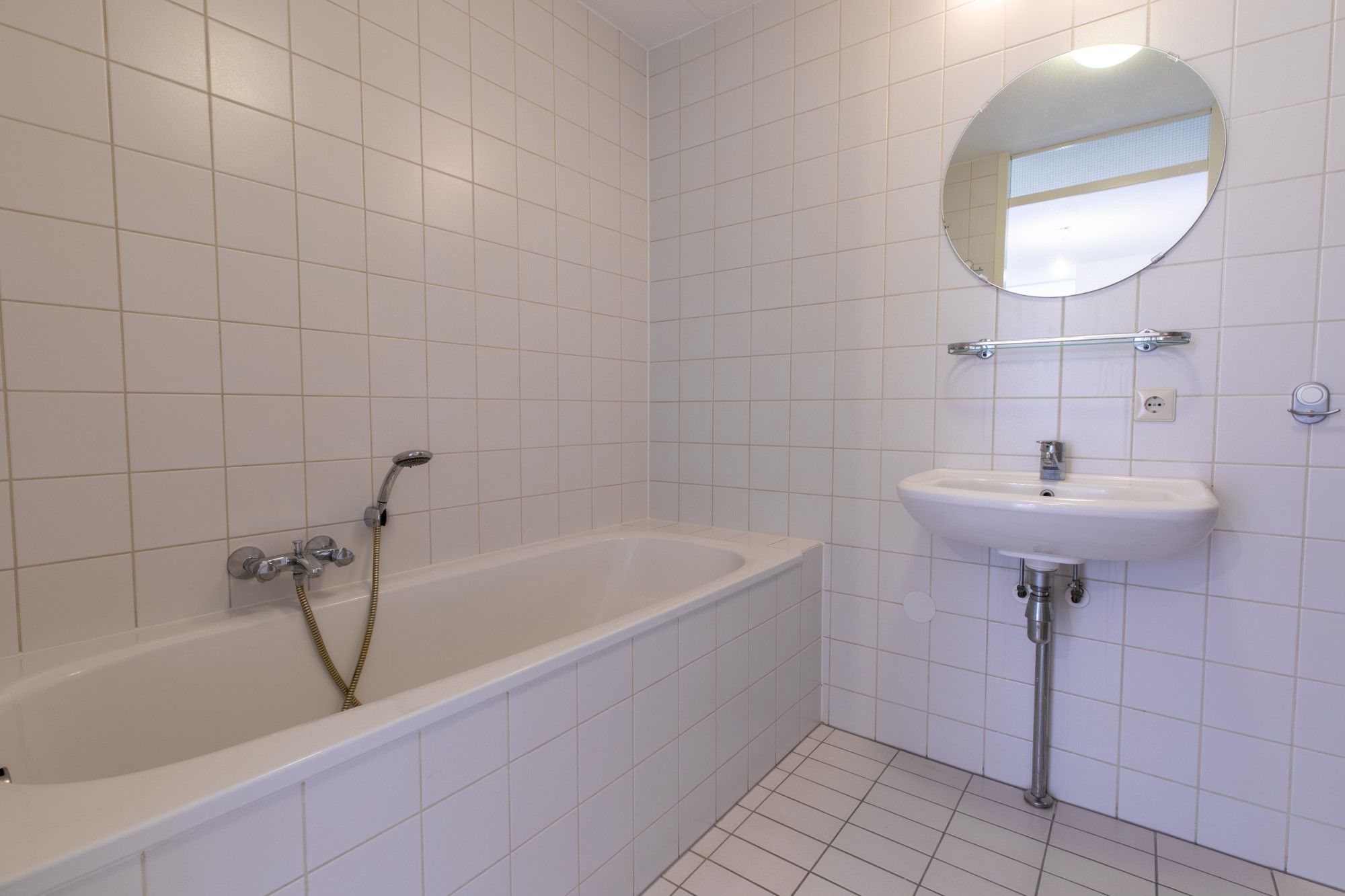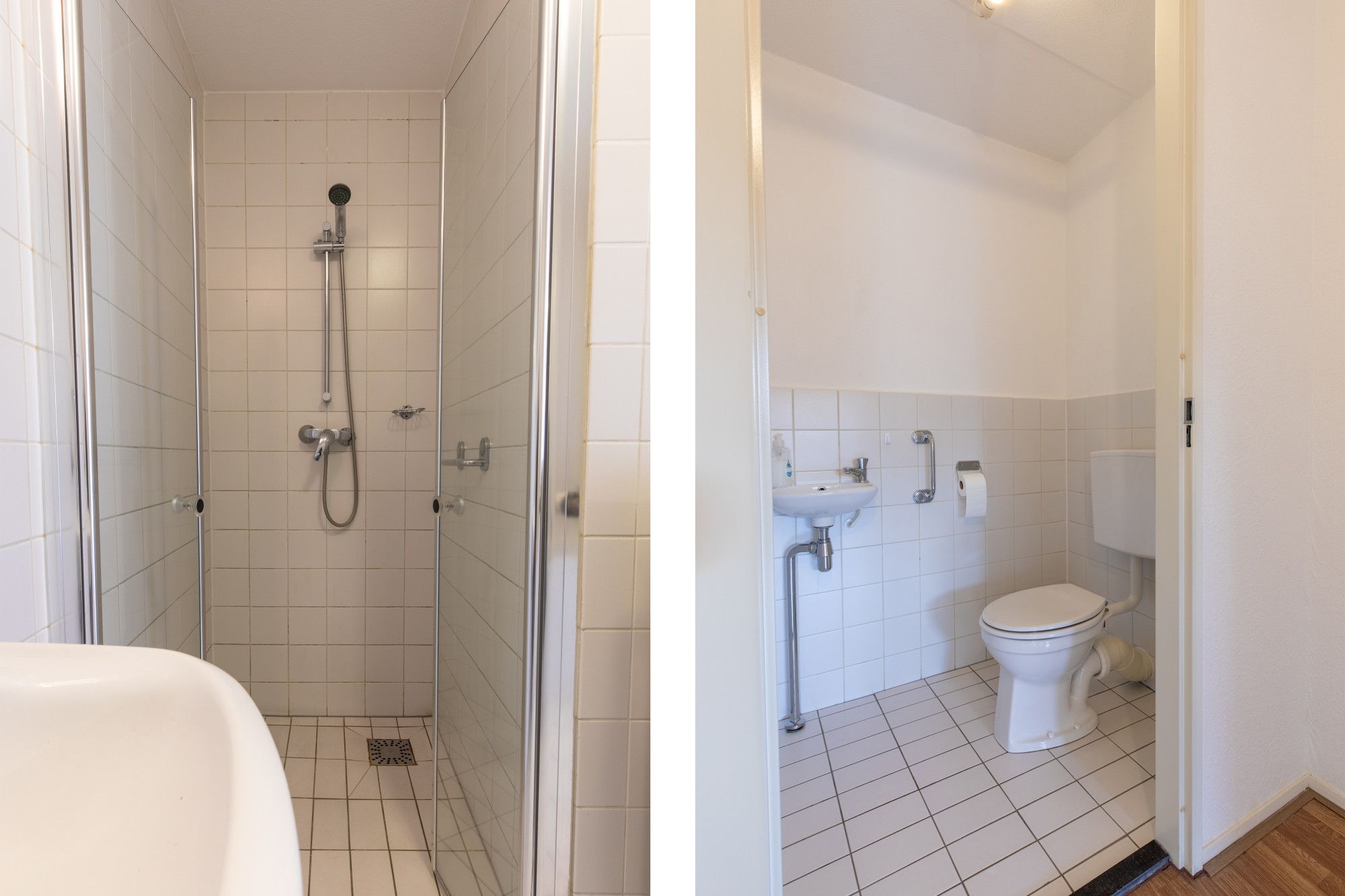 Geheel betegelde badkamer met bad, separate inloopdouche en vaste wastafel.