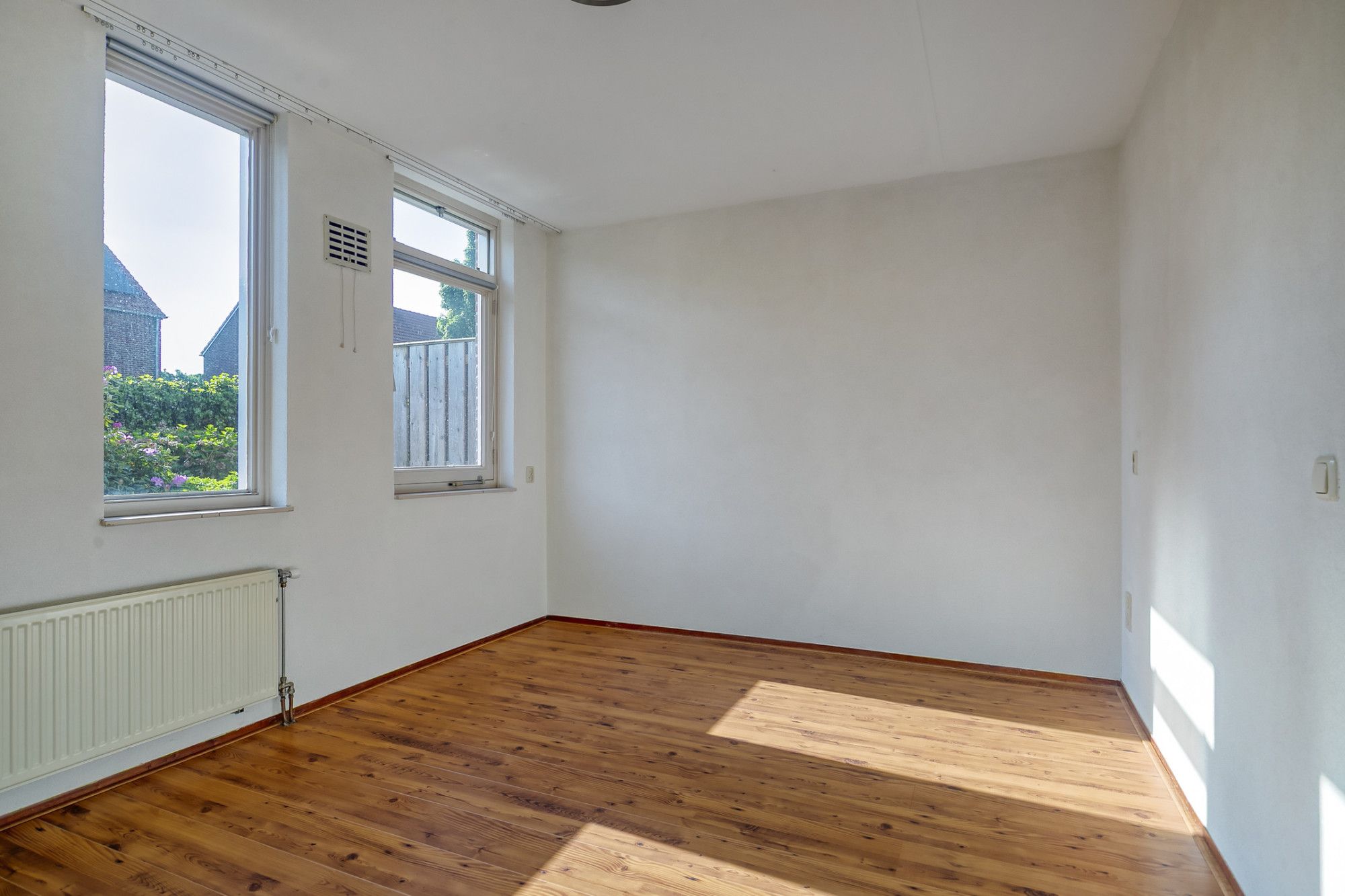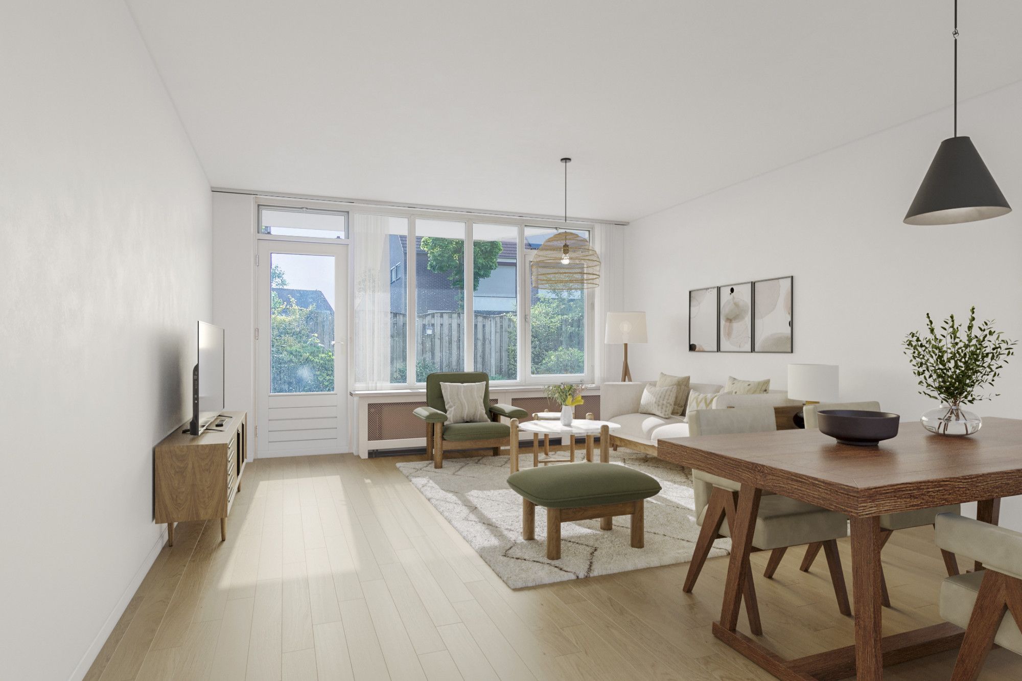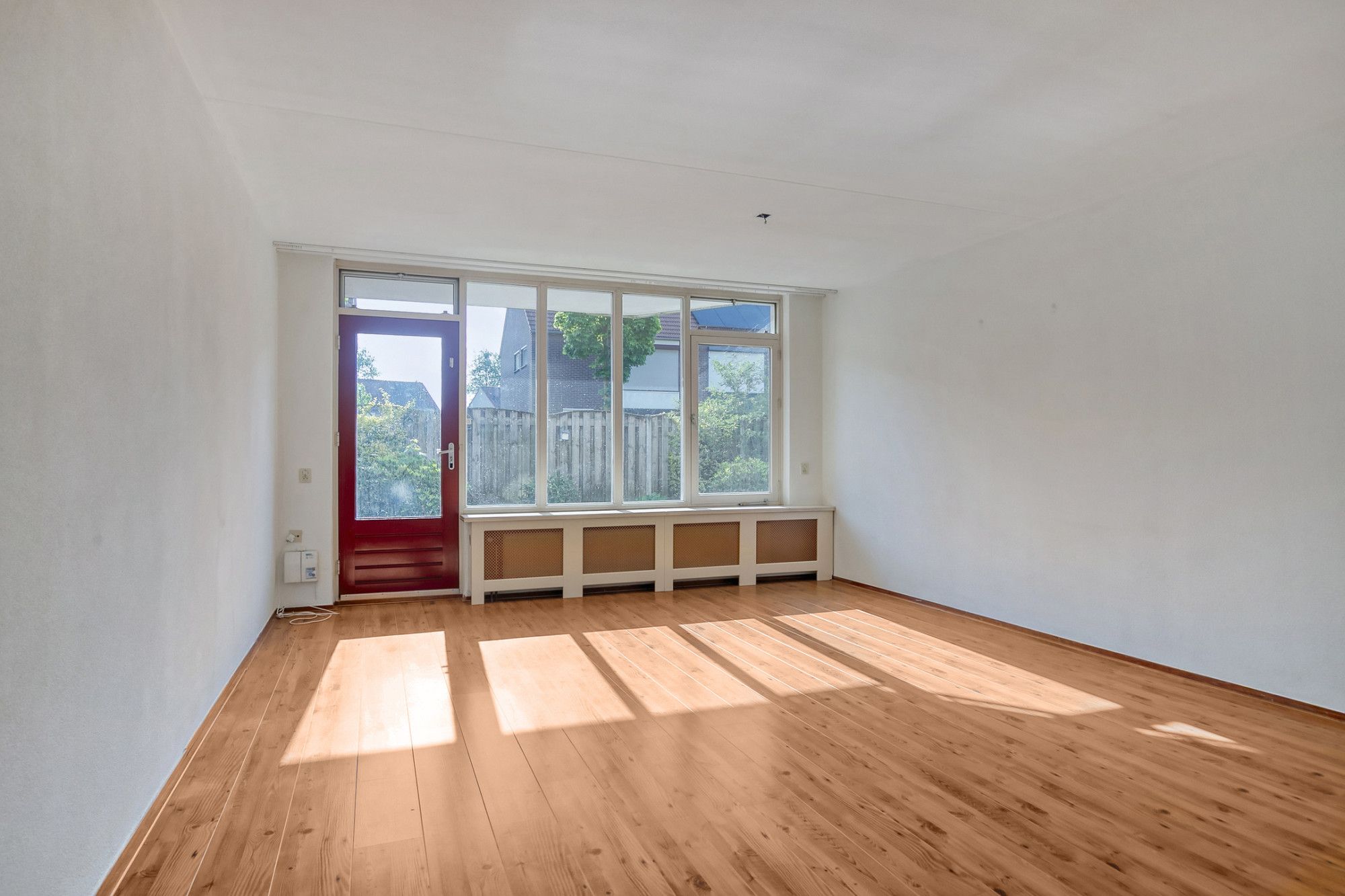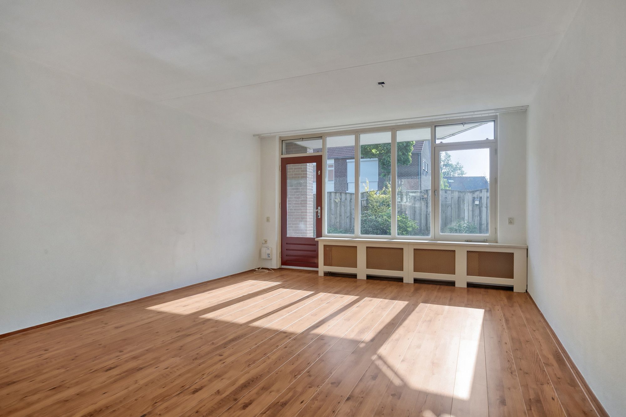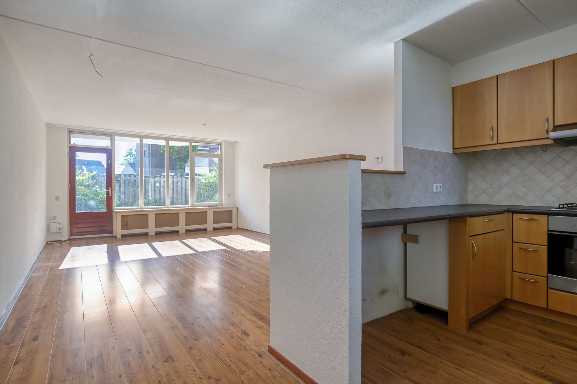 De woonkamer is ruim van afmeting en biedt voldoende ruimte voor zowel een zit- als eetgedeelte. Daarnaast heeft deze toegang tot de eigen privé tuin.