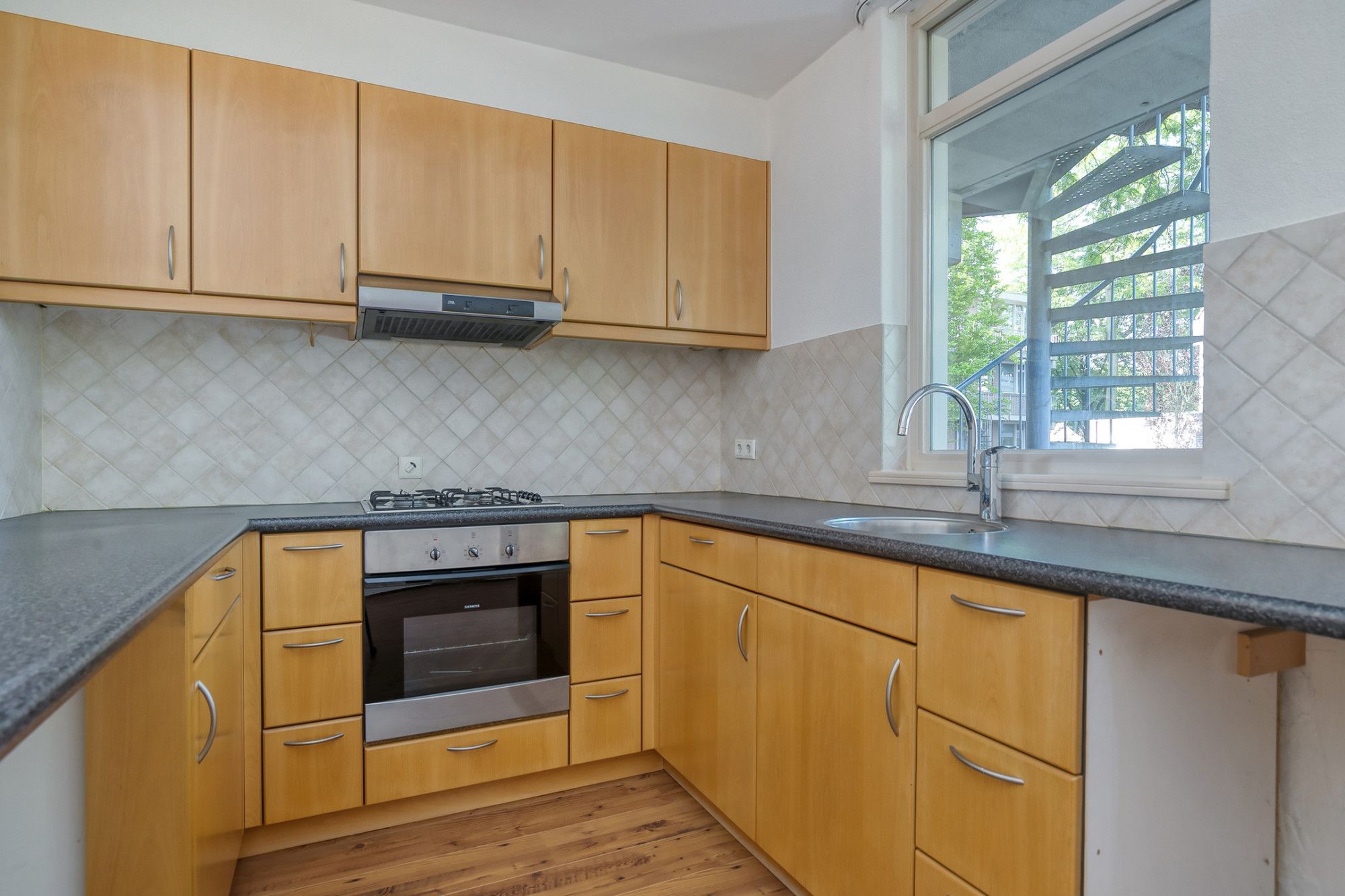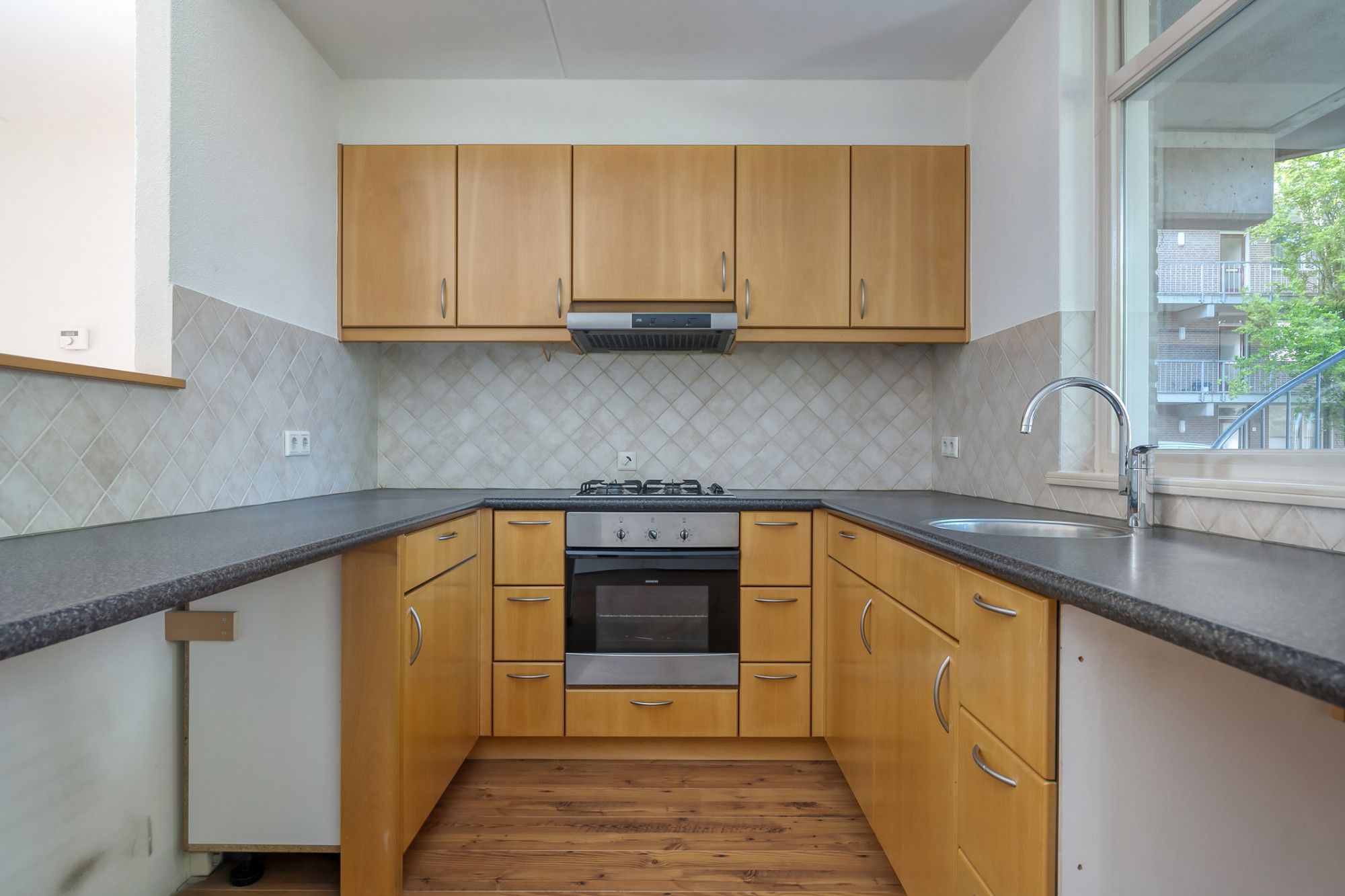 De keuken is voorzien van een kookplaat, afzuigkap en inbouw oven.