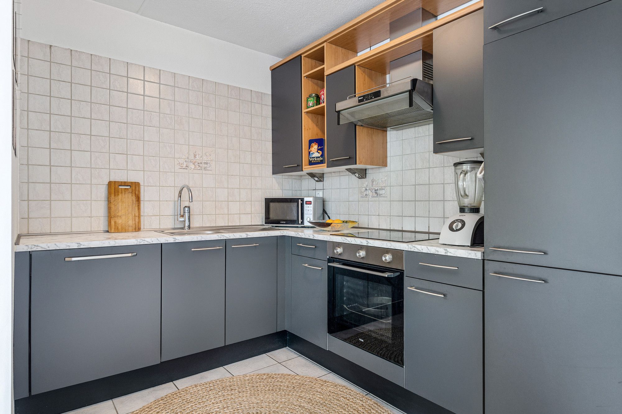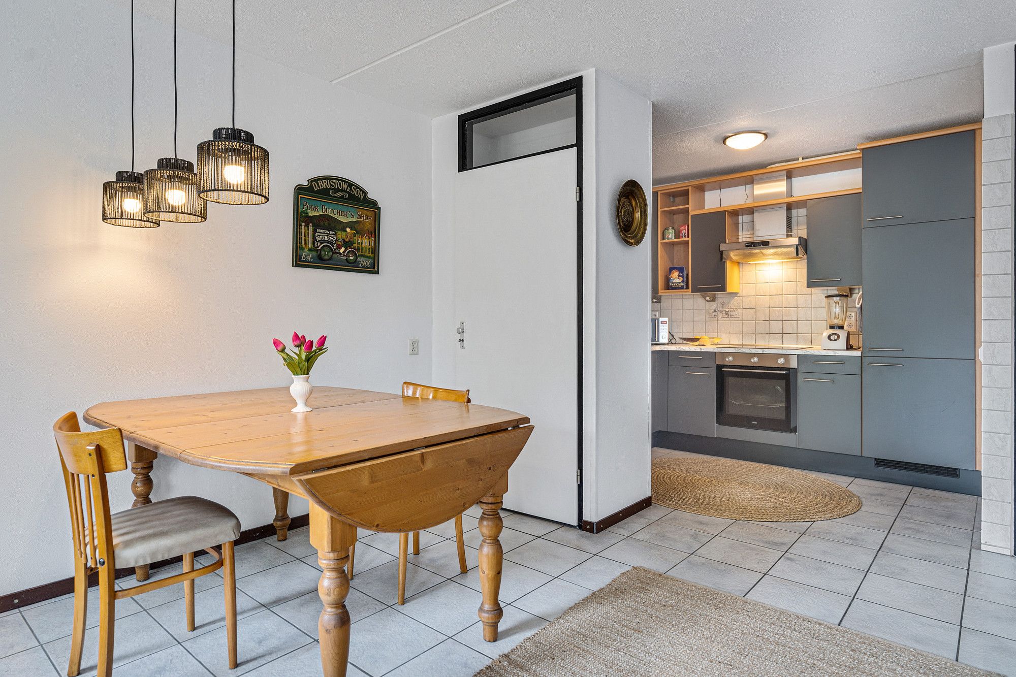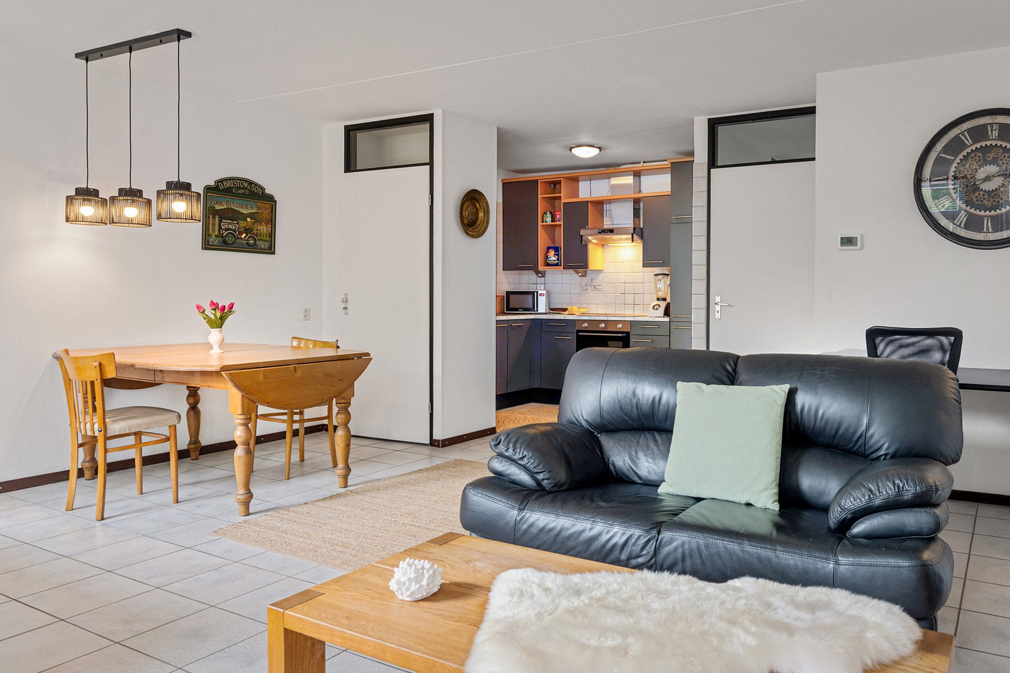 De lichte woonkamer met tegelvloer heeft een fijne indeling en staat in verbinding met de halfopen keuken, die is ingericht met een keurige keukeninstallatie inclusief inbouwapparatuur zoals koelkast en aparte diepvrieskast, 4-pits inductiekookplaat, combi oven-magnetron, afzuigkap en de spoelbak. Vanuit de woonkamer stap je zo het balkon op: een heerlijke plek met vrij uitzicht over de groene omgeving.