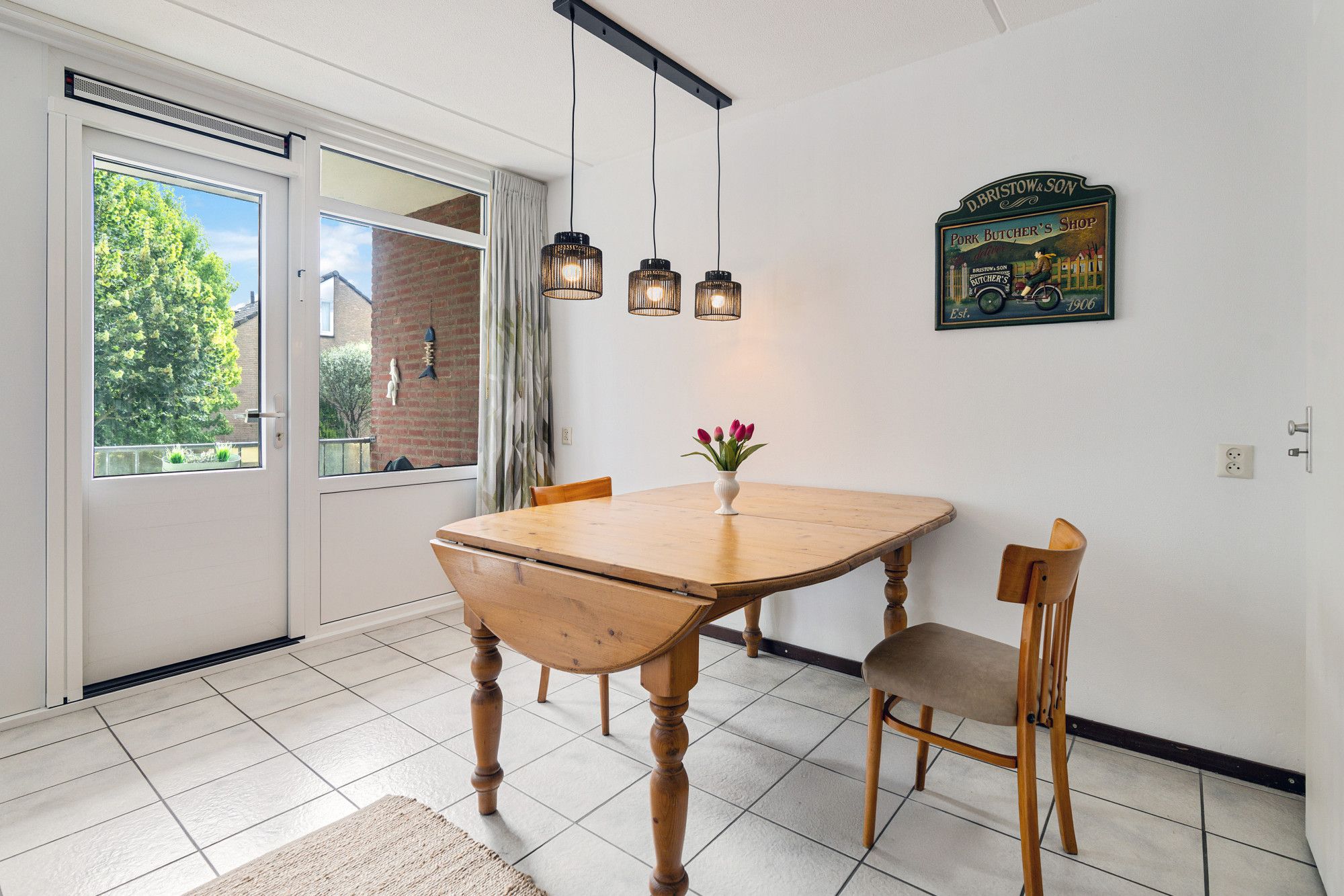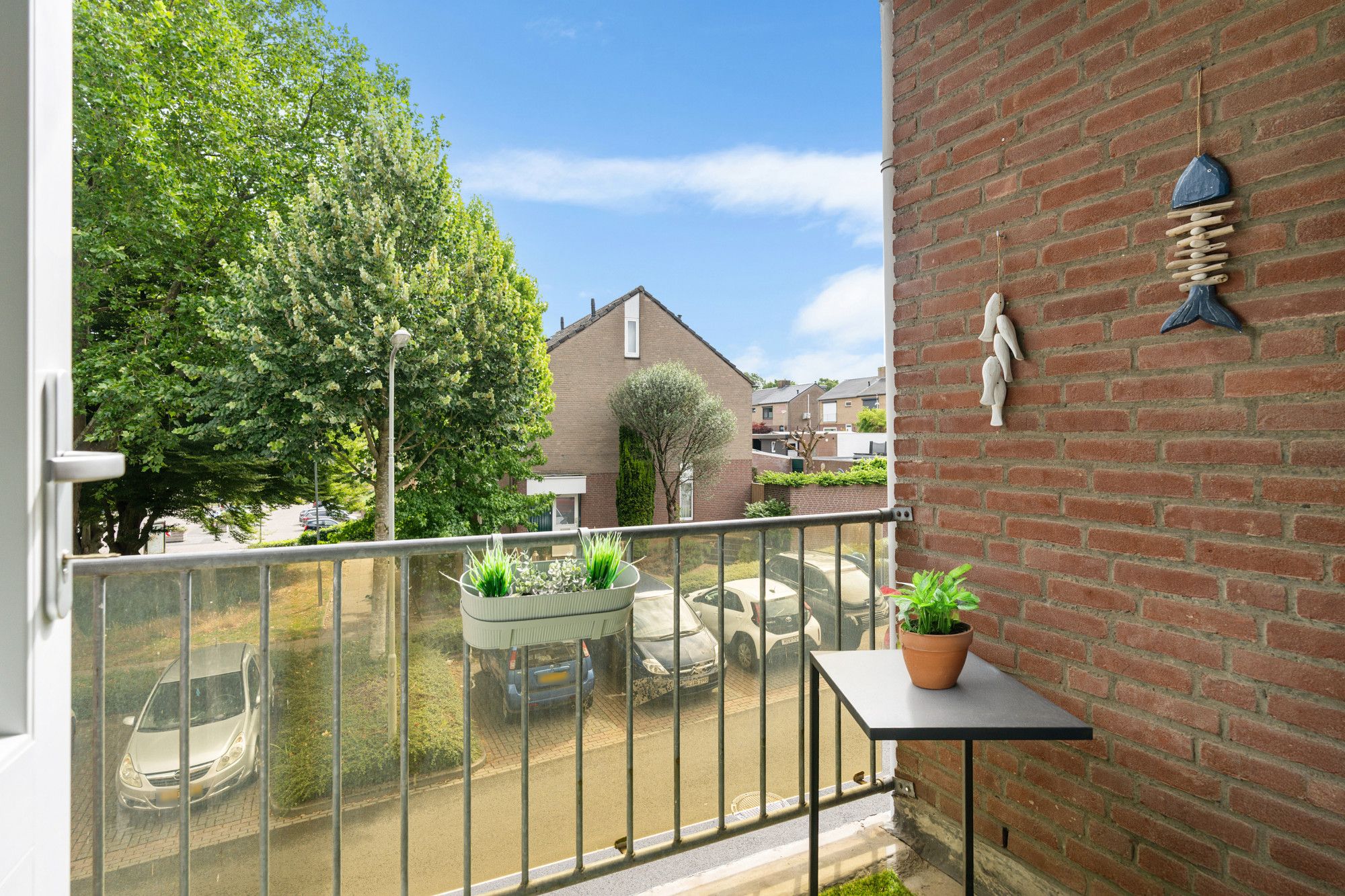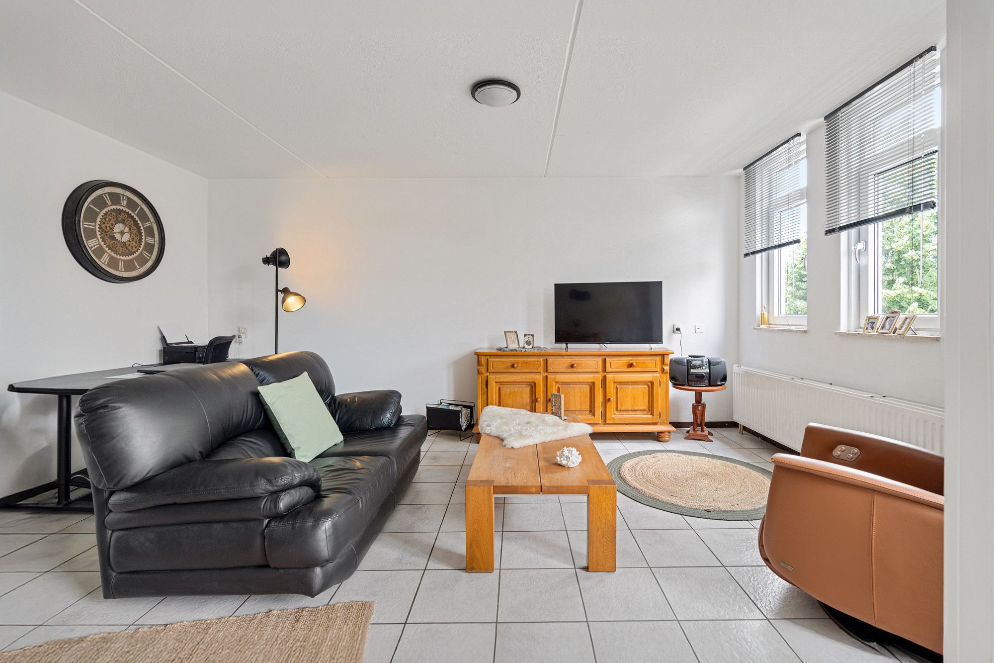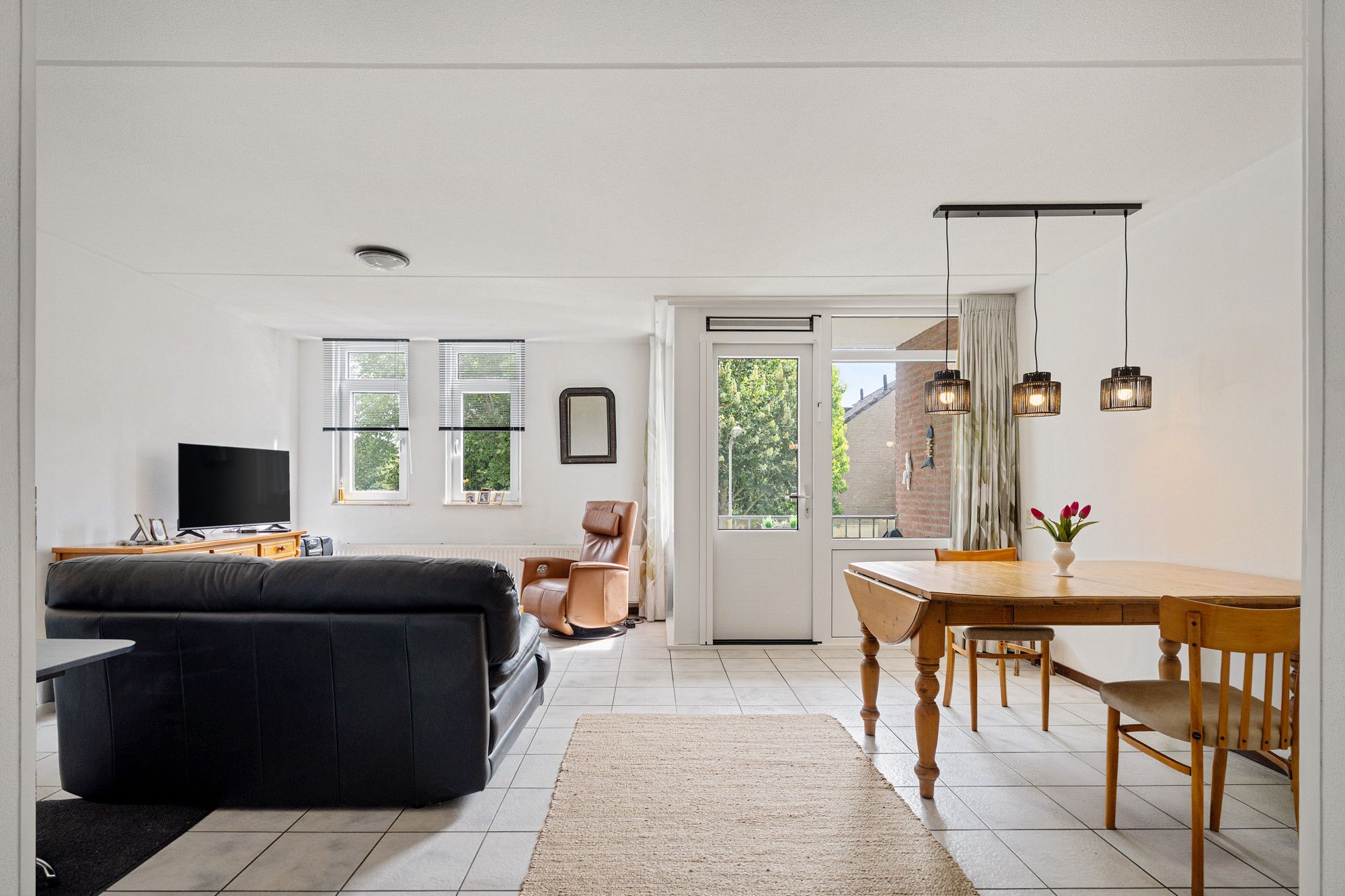 De lichte woonkamer met tegelvloer heeft een fijne indeling en staat in verbinding met de halfopen keuken, die is ingericht met een keurige keukeninstallatie inclusief inbouwapparatuur zoals koelkast en aparte diepvrieskast, 4-pits inductiekookplaat, combi oven-magnetron, afzuigkap en de spoelbak. Vanuit de woonkamer stap je zo het balkon op: een heerlijke plek met vrij uitzicht over de groene omgeving.