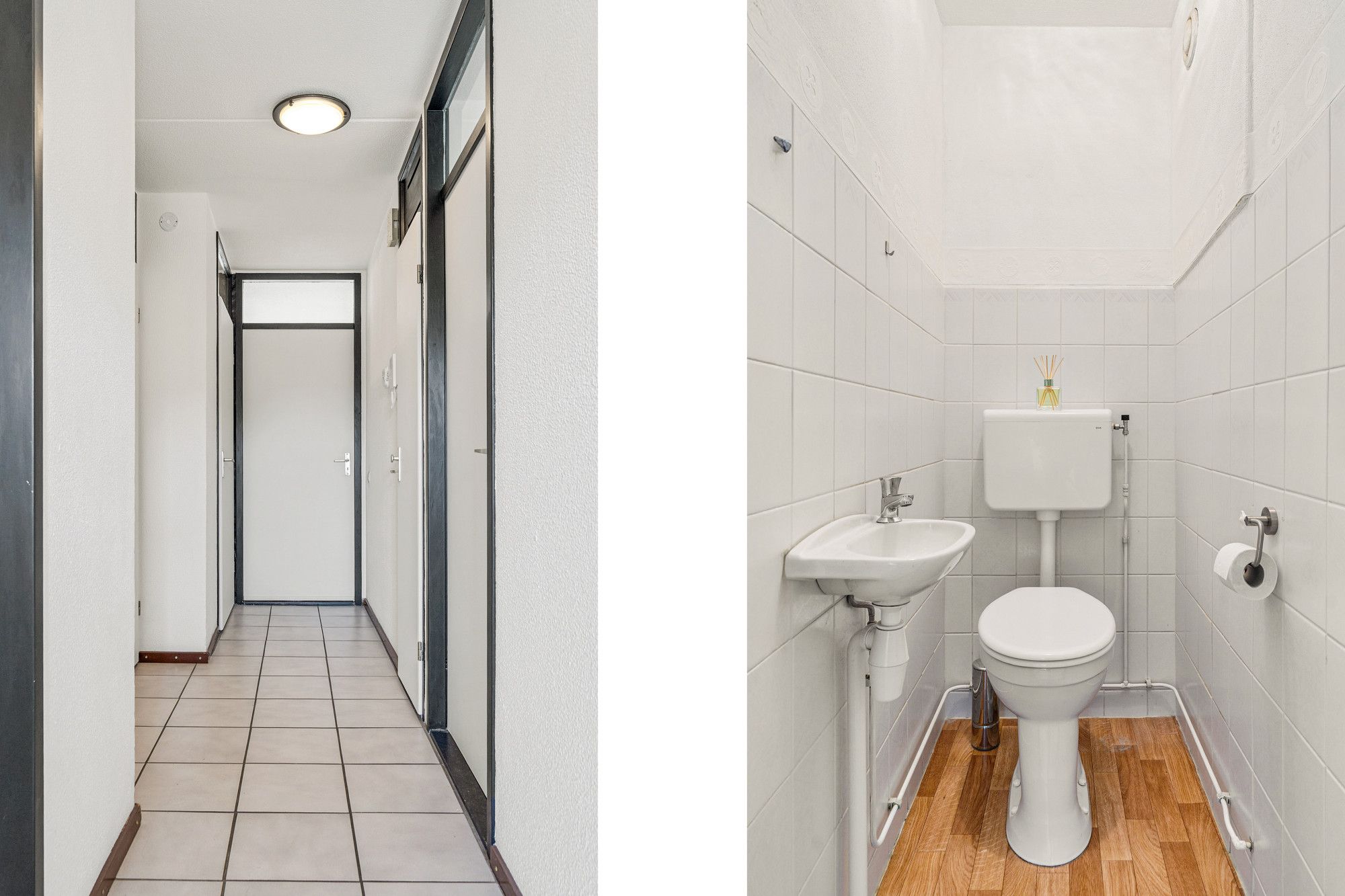 Bij binnenkomst stap je in de centrale hal met intercominstallatie en meterkast. Vanuit hier heb je toegang tot alle vertrekken. Het toilet met fonteintje, welke netjes is afgewerkt. Er zijn twee fijne slaapkamers, waarvan één met een praktische vaste kast – perfect als kledingruimte of extra opbergruimte. Beide slaapkamers zijn voorzien van novilonvloer en rolluiken, wat extra comfort en privacy biedt.
