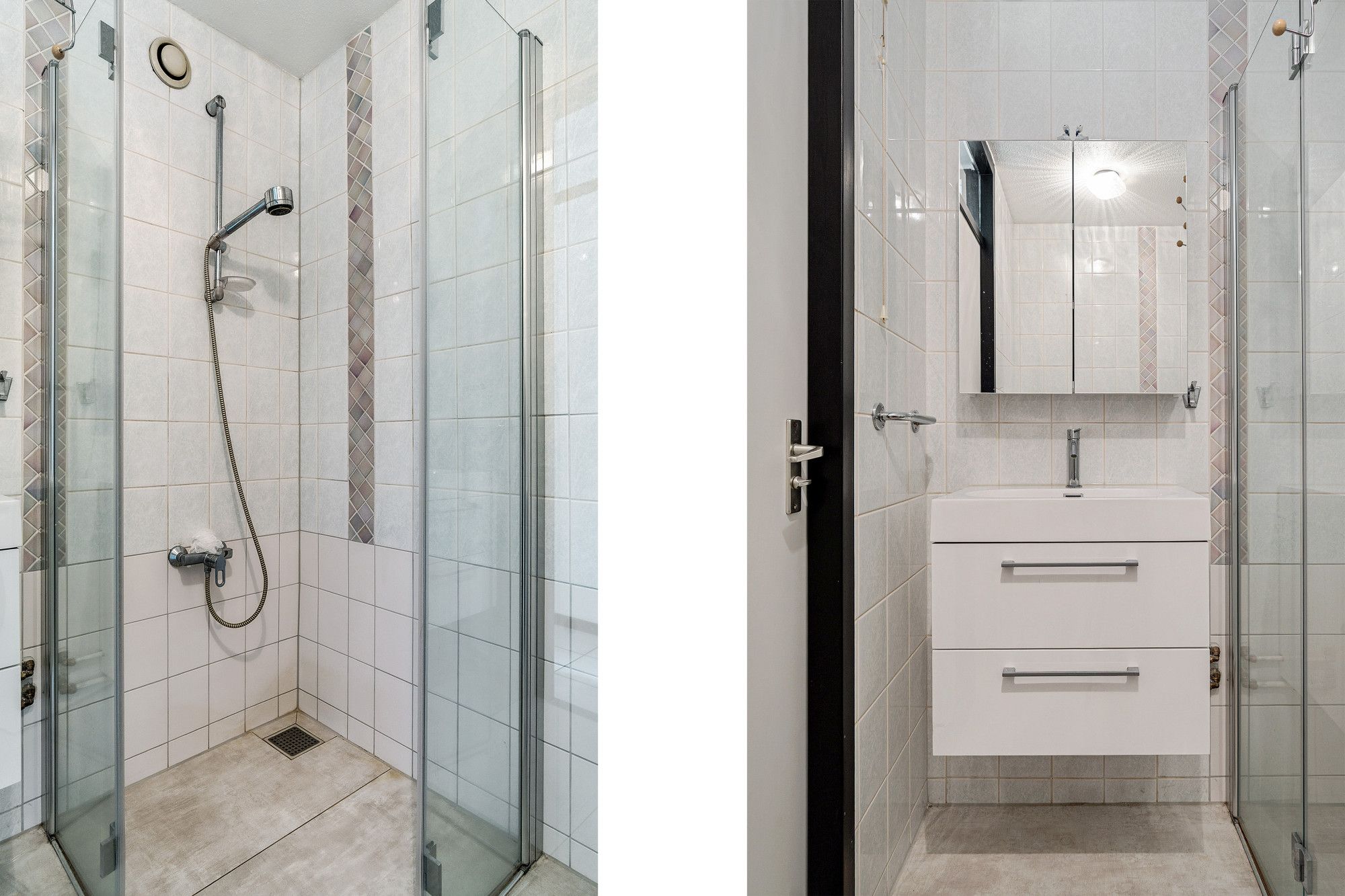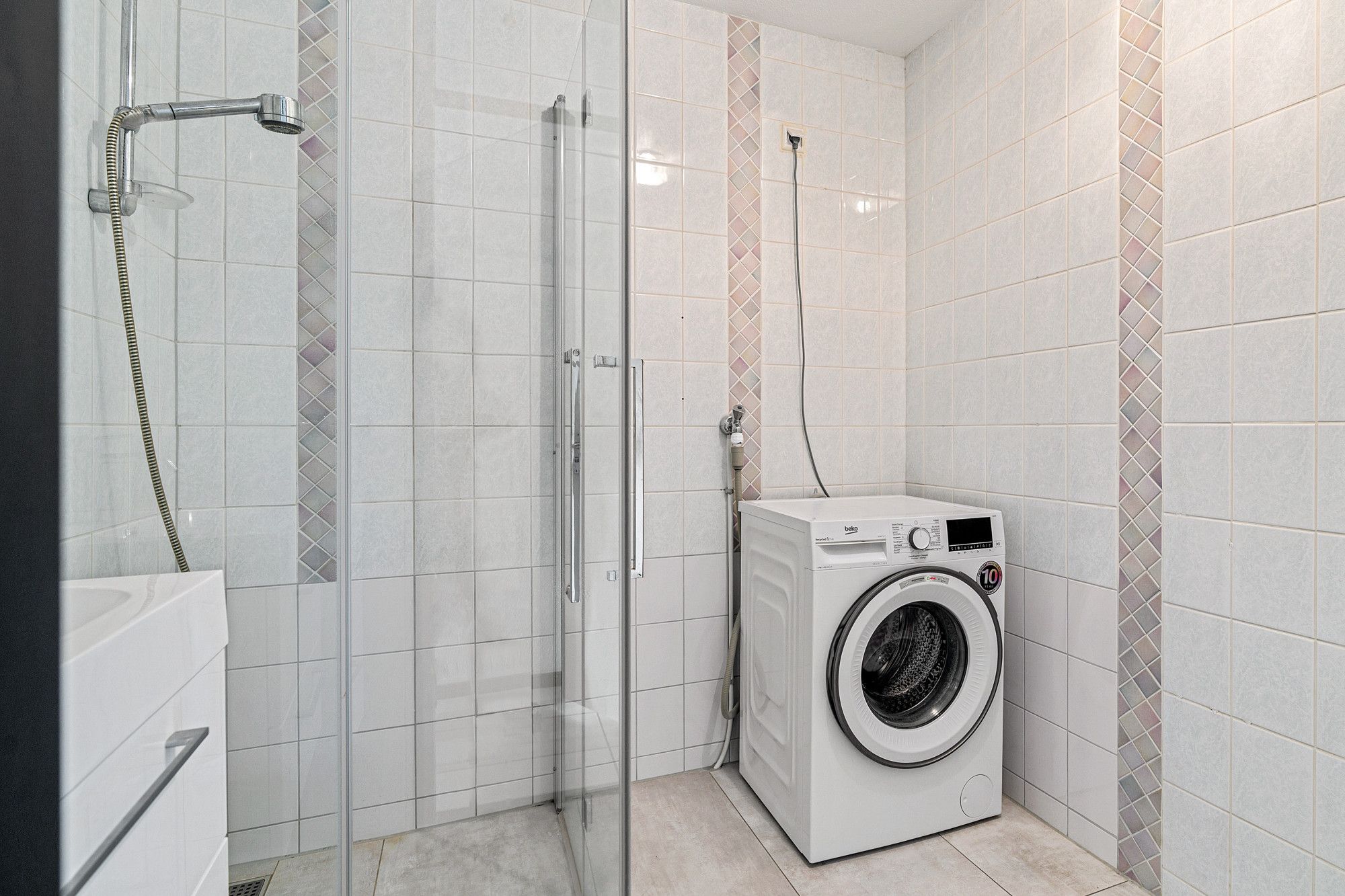 De geheel betegelde badkamer is modern en voorzien van een inloopdouche, een vaste wastafel en een aansluiting voor de wasmachine.