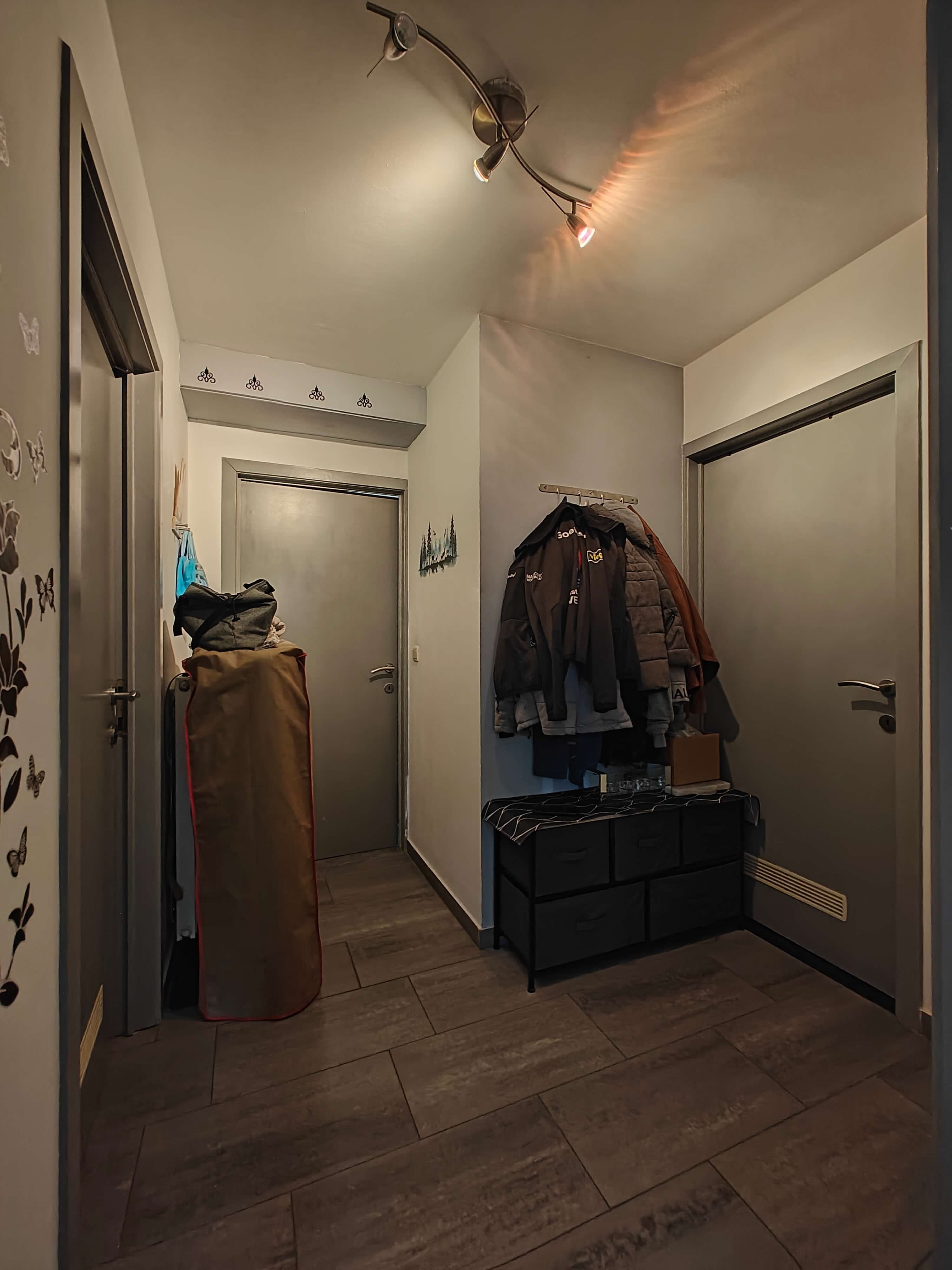 Bij het betreden van het appartement bevindt u zich op de eerste verdieping in de inkomhal, die toegang geeft tot alle vertrekken. Aan de voorzijde vindt u een ruime slaapkamer, ideaal voor een dubbel bed en kleerkast. De badkamer is uitgerust met een douche, toilet en wasmeubel. Er is tevens een aparte berging/wasruimte voorzien.