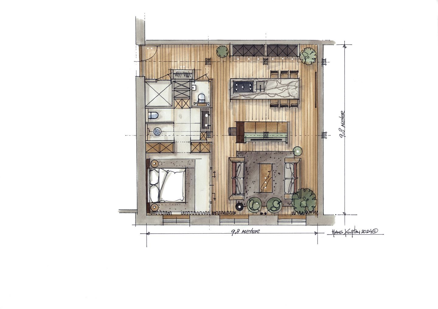 Het hart van dit appartement wordt gevormd door de grote, open leefkeuken met een flink kookeiland dat aan een zijde ruimte biedt voor een eetbar. De lekker royale woonkamer is groot genoeg voor een gezellige eethoek en een plek om lekker languit op de bank te ontspannen. Direct aan deze ruimte grenst de ca. 12 m2 grote slaapkamer waar genereus invulling wordt gegeven aan de belofte van luxe en comfort. Er is voldoende ruimte voor een lekker groot bed, daarnaast bevindt zich de badkamer en suite met twee wastafels, een douche en toilet. Achter de leefkeuken is aan de ene kant een ruimte gecre.erd voor een rustige werkplek. Aan de andere kant is een berging gemaakt die goed dienst kan doen als bijkeuken of, voor de liefhebbers, een wijnopslag. In de hal bevinden zich een separaat toilet en een garderobe.