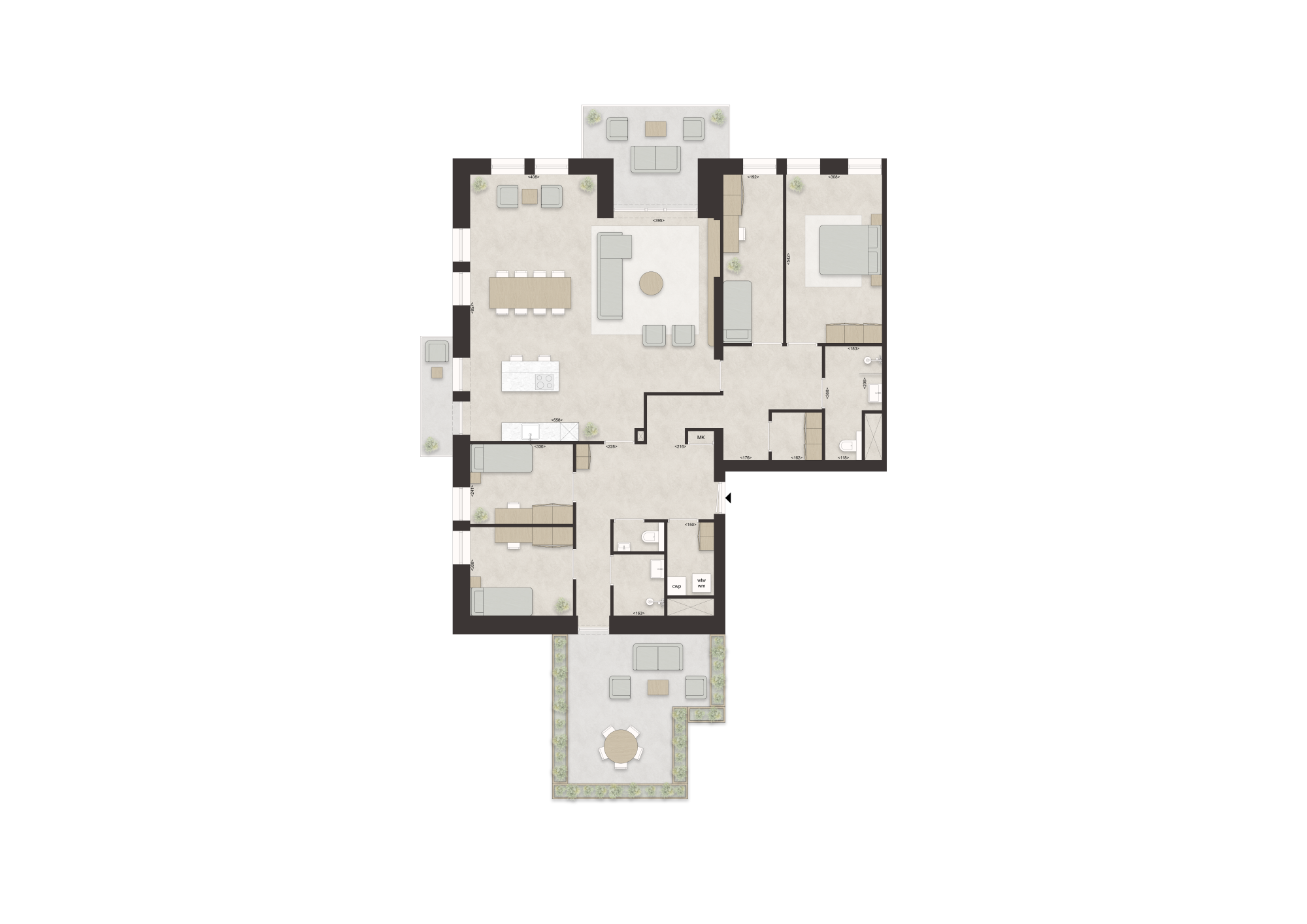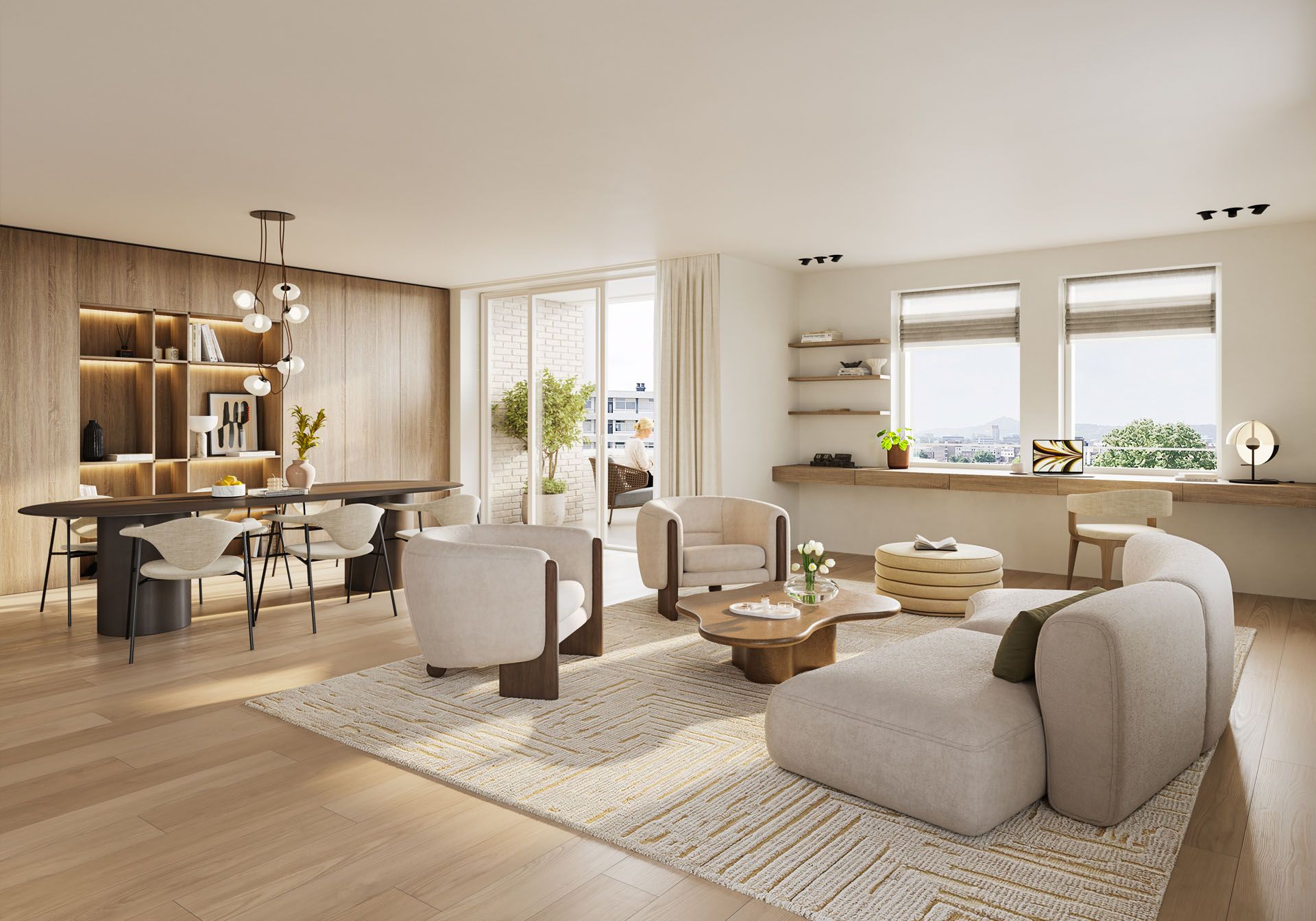 Op de vijfde verdieping van COUR vind je twee penthouses waar alles samenkomt. Riante appartementen met slaapkamers op de hoeken, eerdere badkamers en een weids uitzicht. Grote raampartijen laten het daglicht overvloedig binnen, terwijl het zonnige dakterras uitnodigt tot lange avonden buiten.