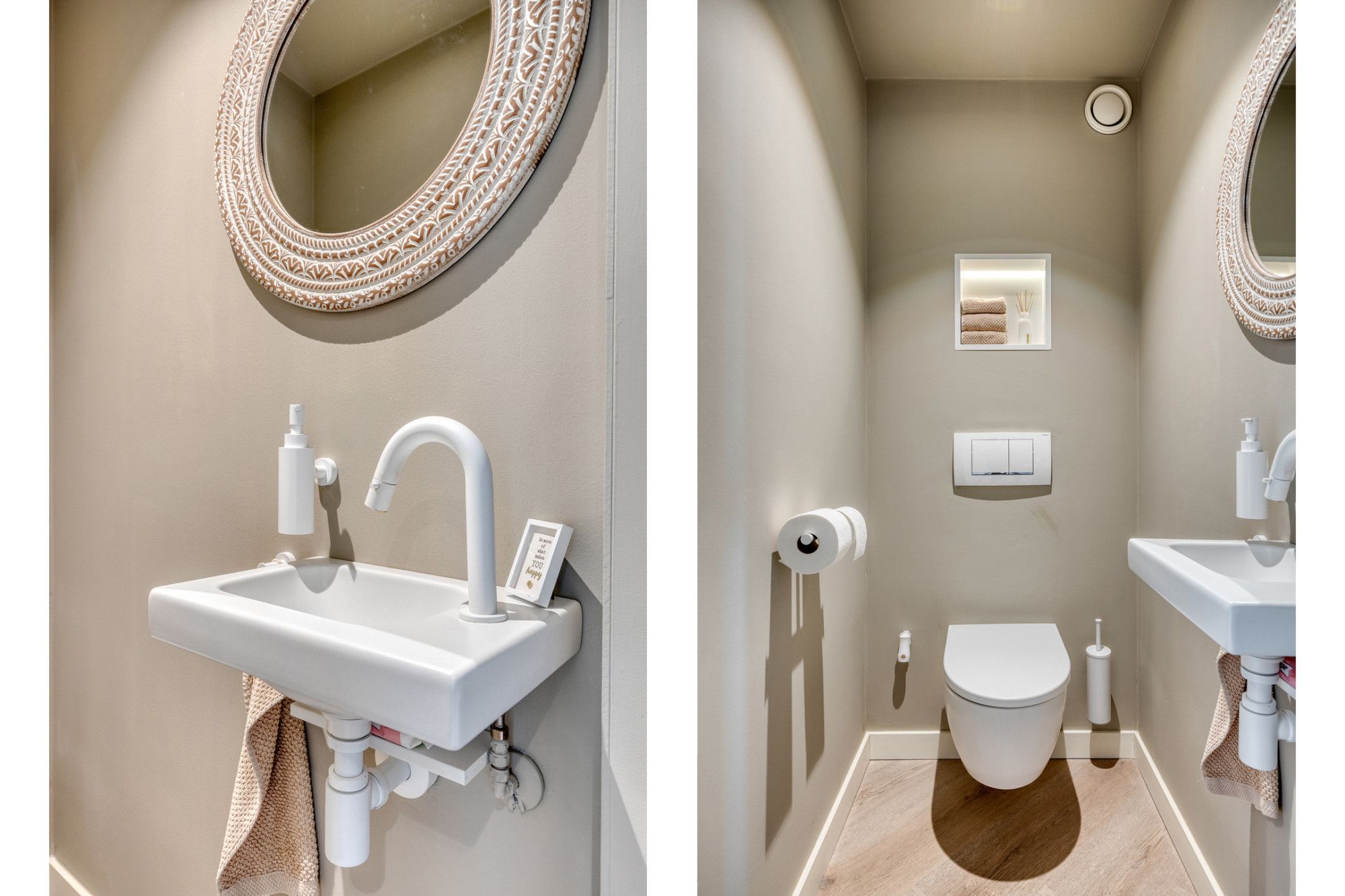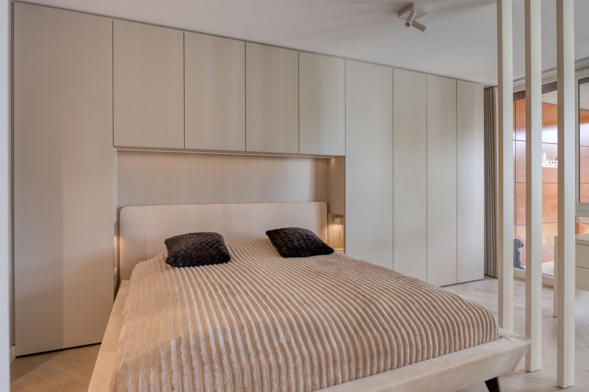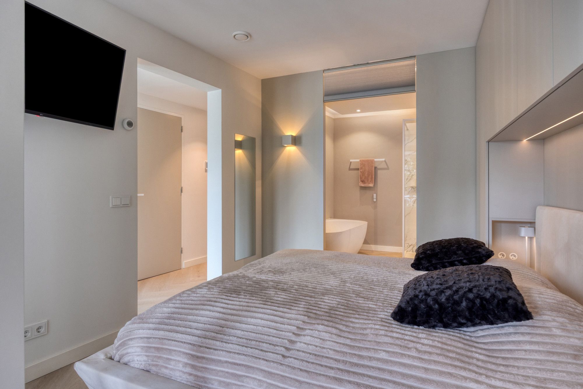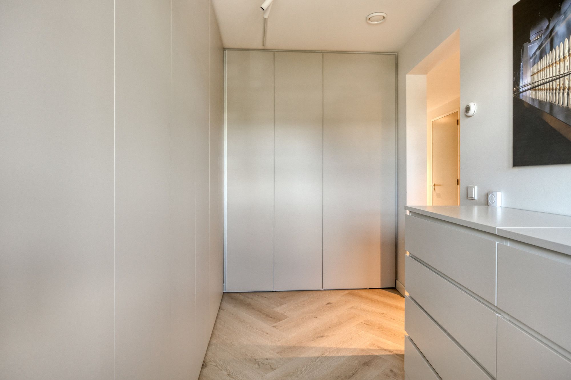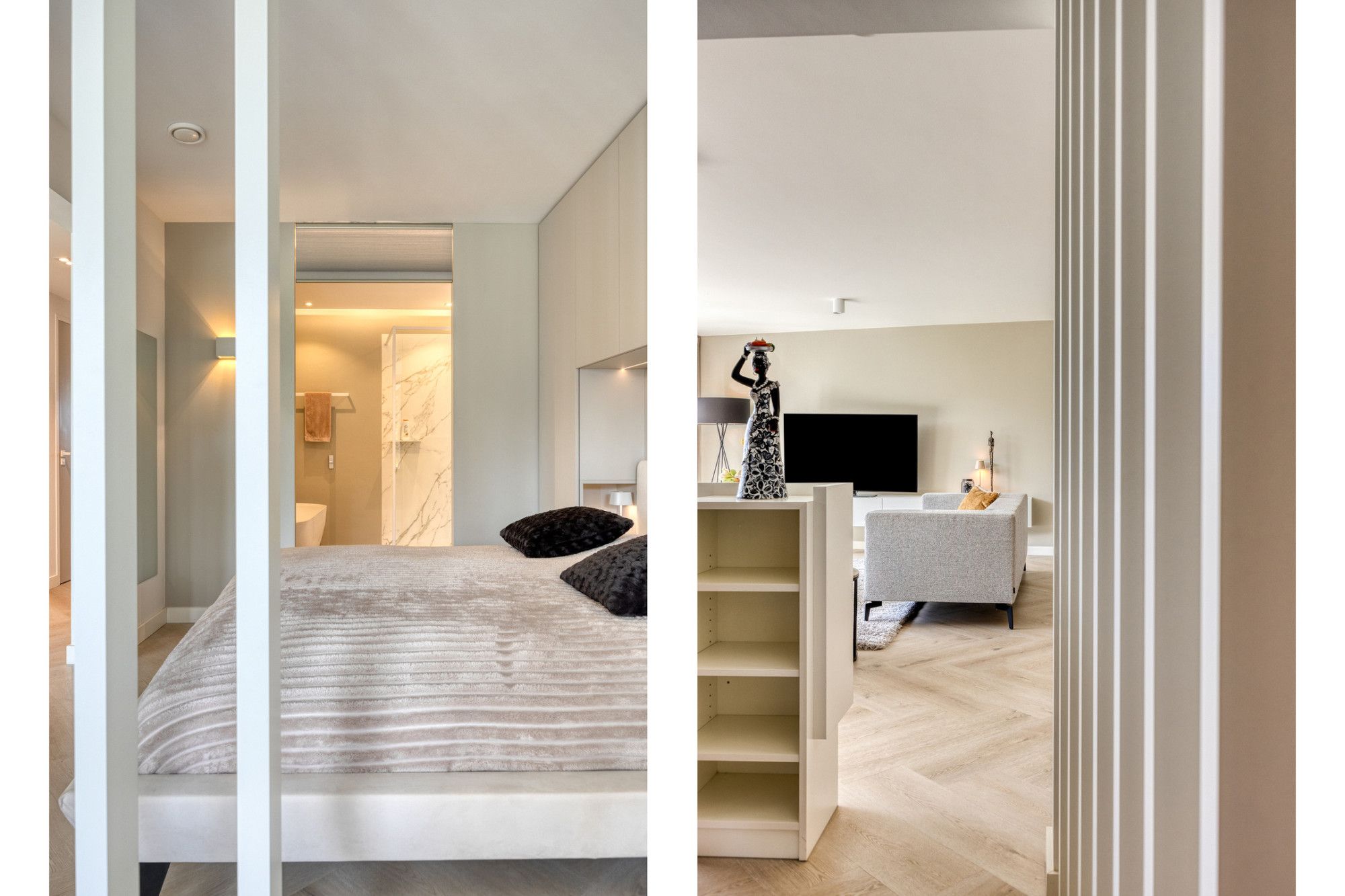 - Vanuit de woonkamer loop je de slaapkamer, met kastenwand op maat, in met aansluitend de moderne