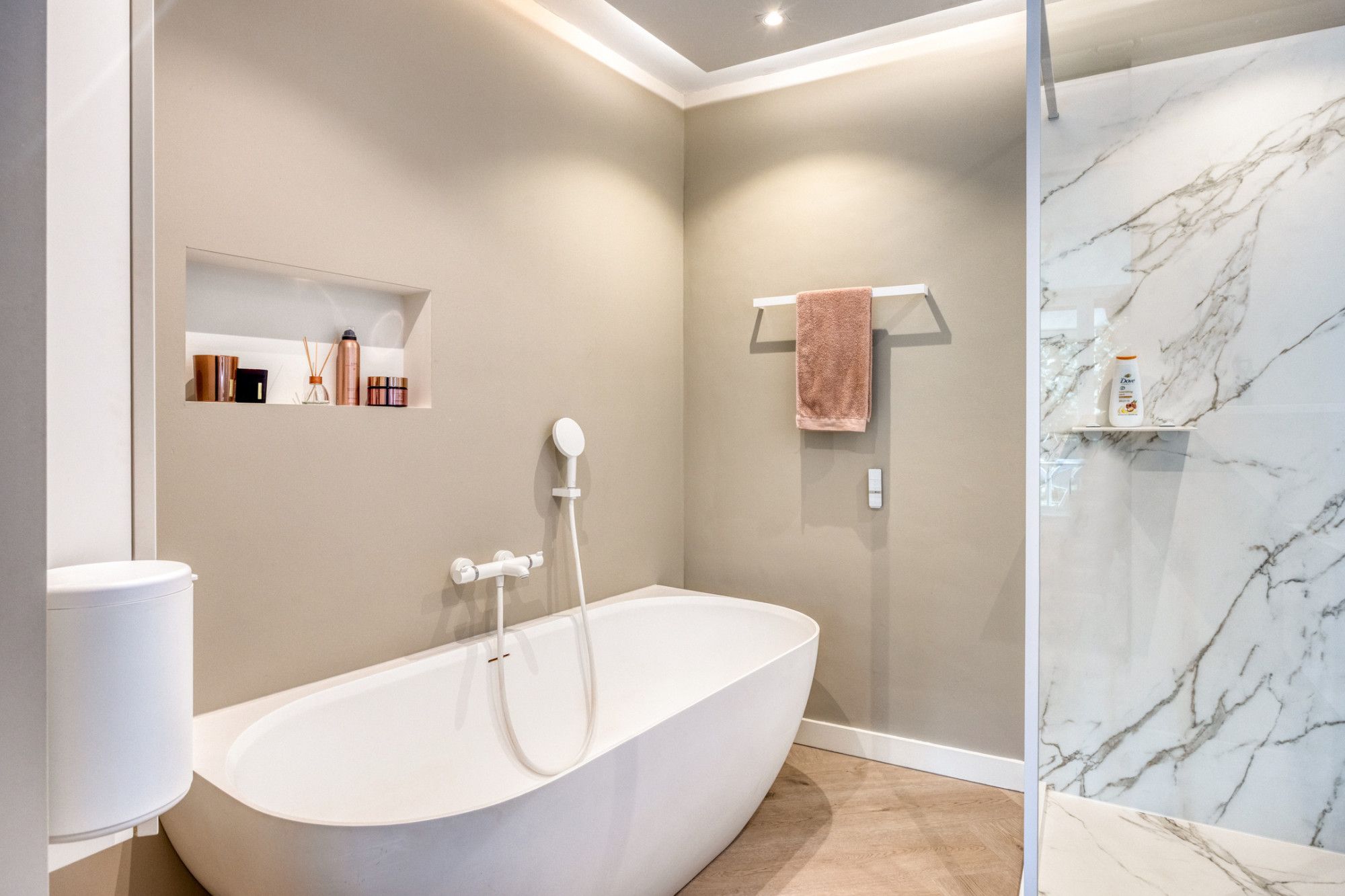badkamer voorzien van ligbad, inloopdouche, en wastafelmeubel. Het slaapkamerraam is ook voorzien