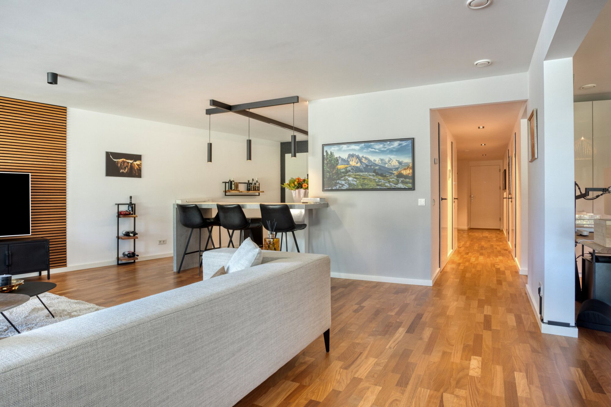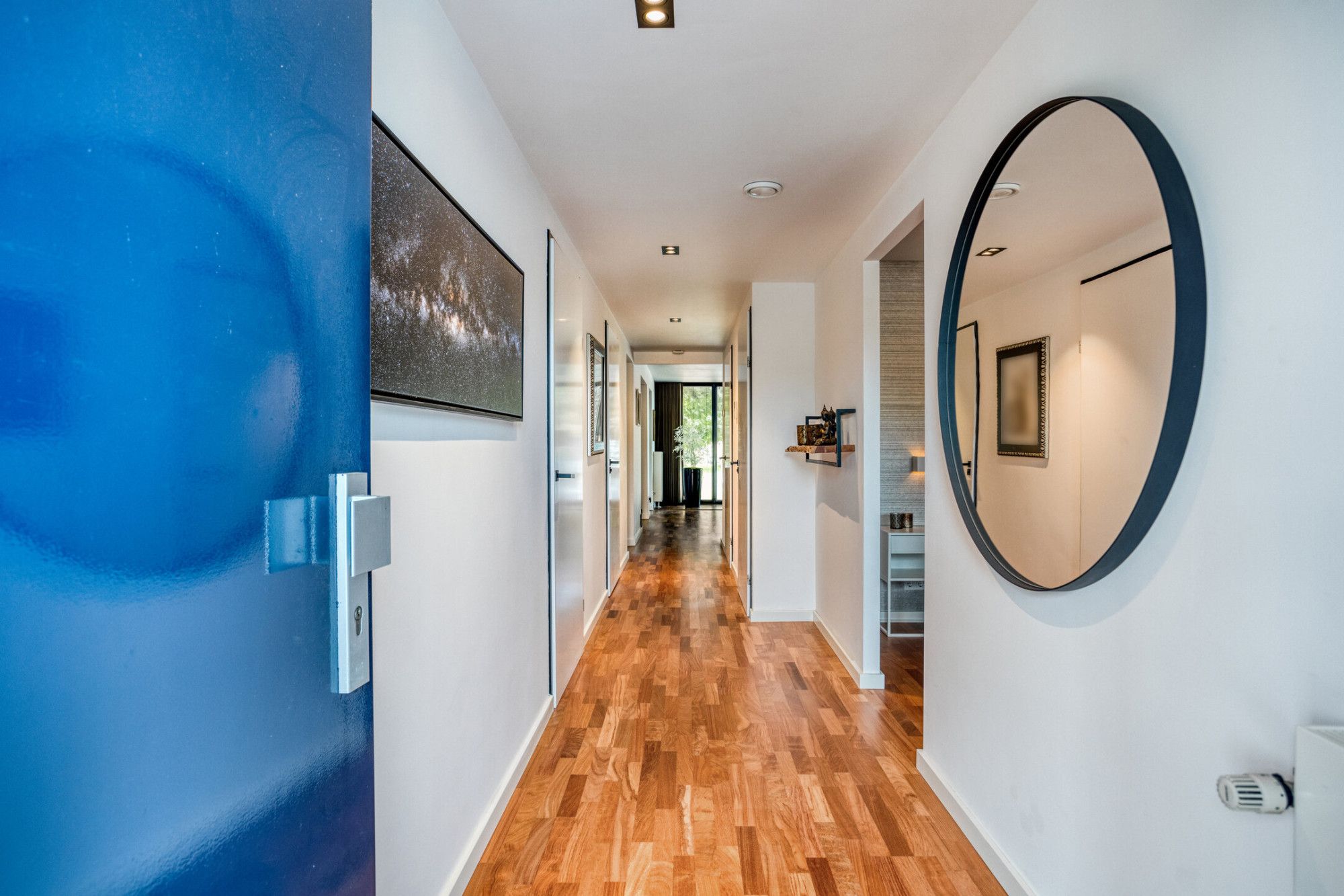 Gang. Ruime en door de grote raampartijen lichte woonkamer met toegang tot de open keuken, loggia en slaap-/werkkamer.