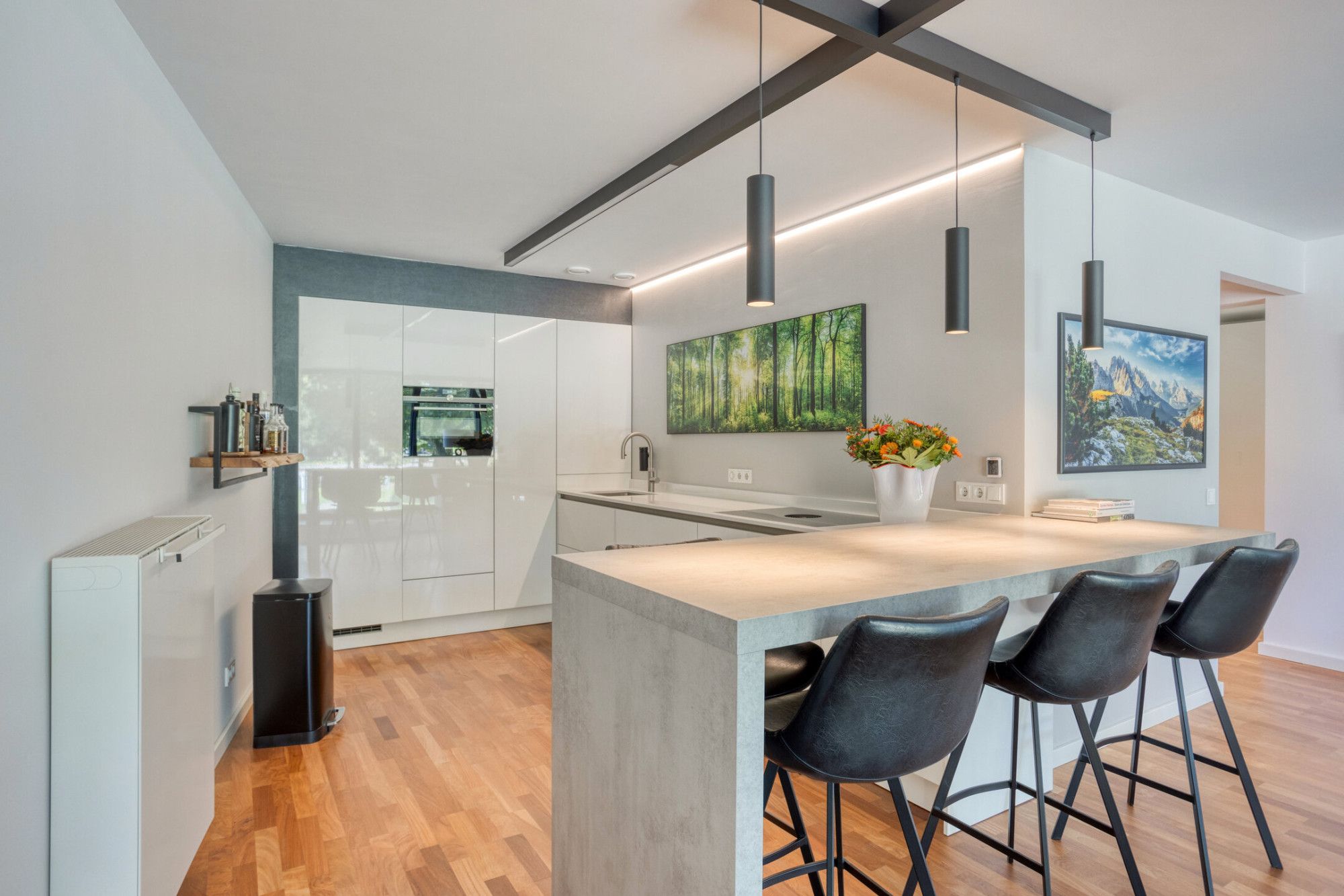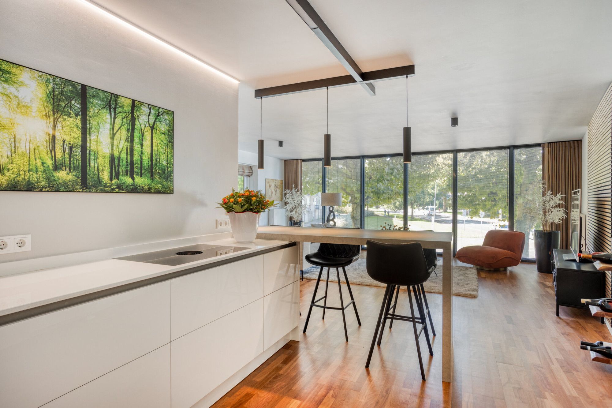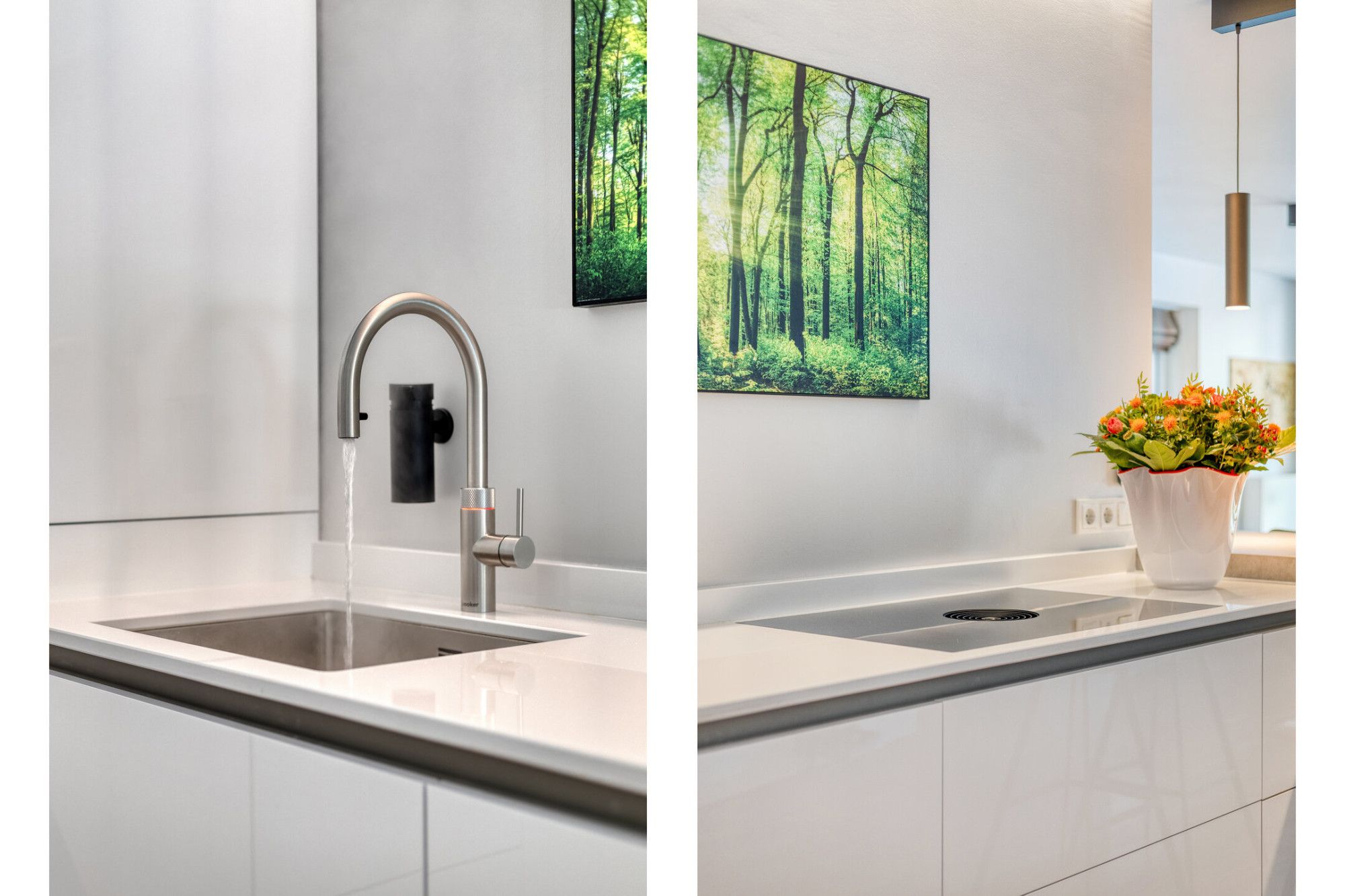 De moderne keuken is voorzien van een moderne U-vormige inrichting voorzien de volgende ingebouwde apparatuur: BORA kookplaat, Quooker (kokend en bruis, gefilterd water), vaatwasser, combi-oven en grote koelkast.
