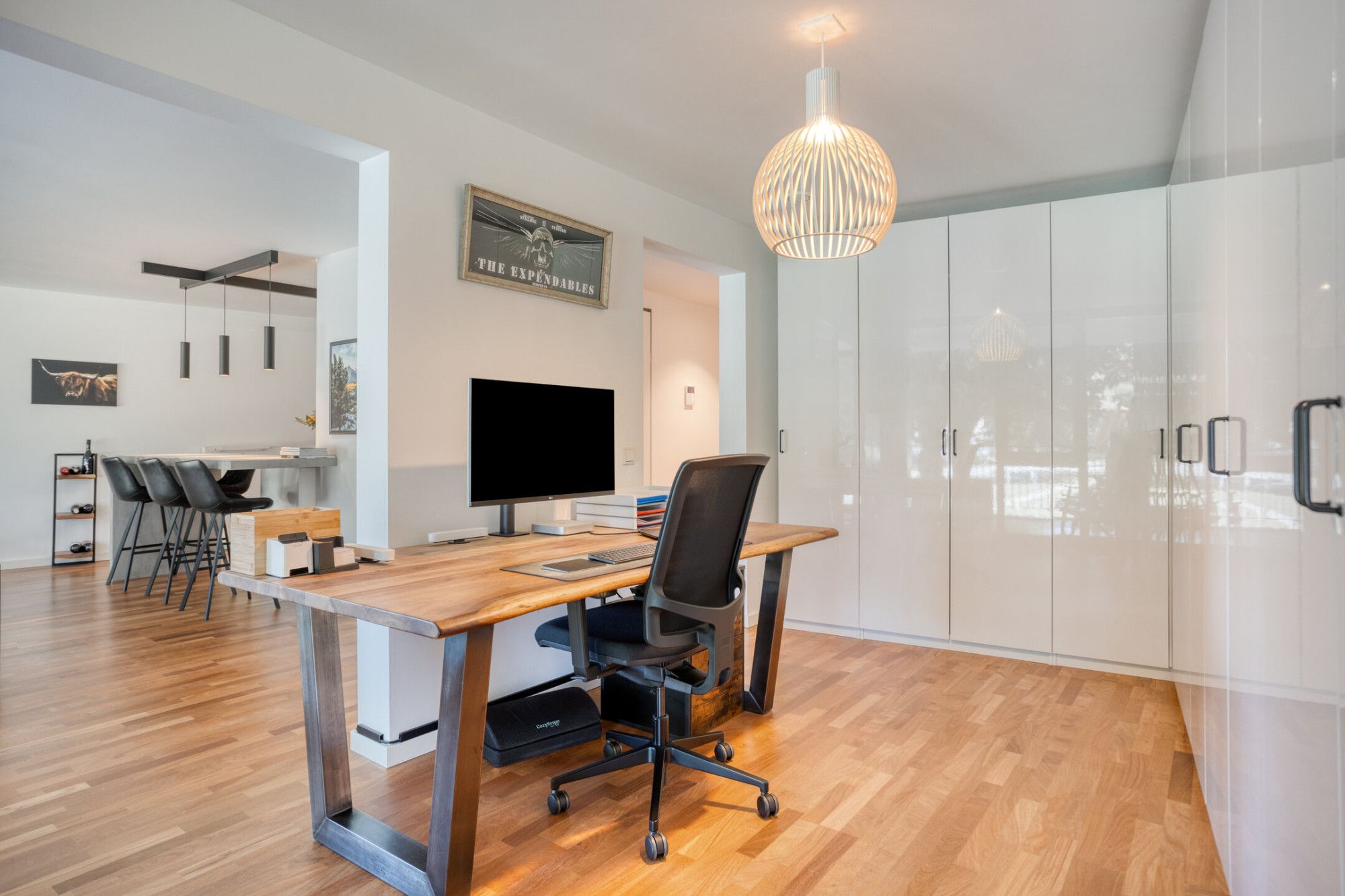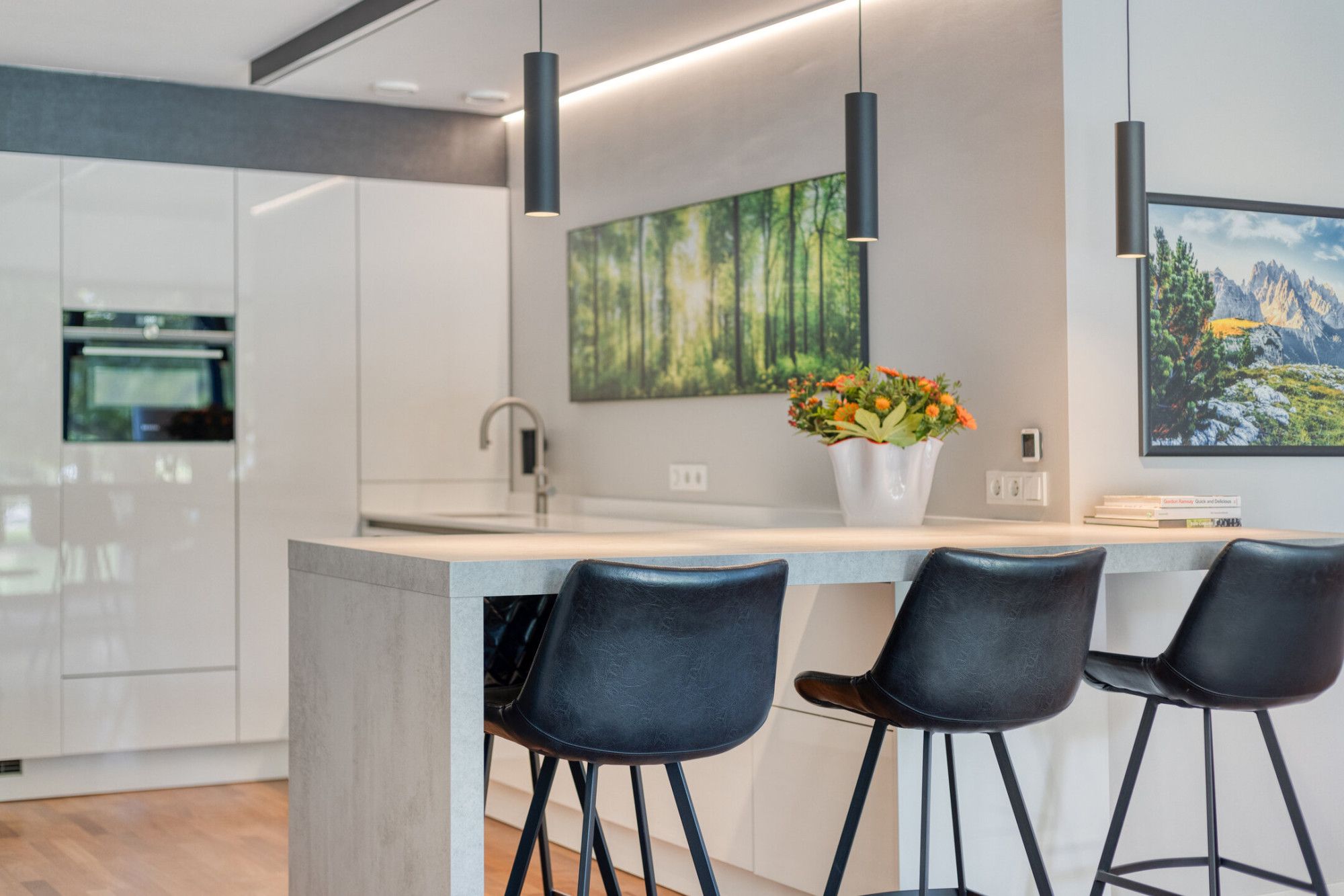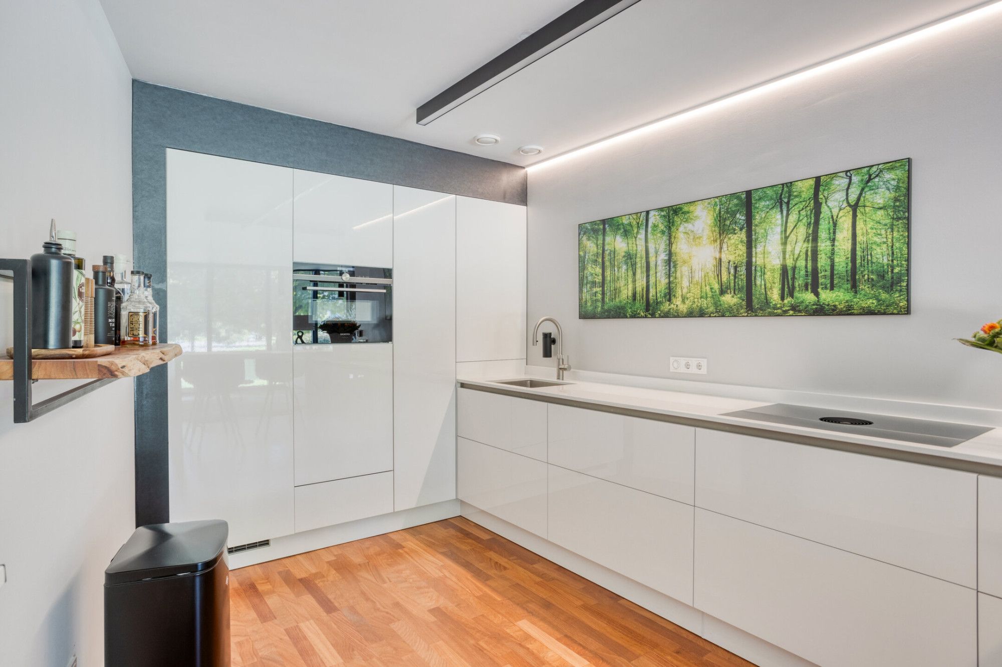 De moderne keuken is voorzien van een moderne U-vormige inrichting voorzien de volgende ingebouwde apparatuur: BORA kookplaat, Quooker (kokend en bruis, gefilterd water), vaatwasser, combi-oven en grote koelkast.