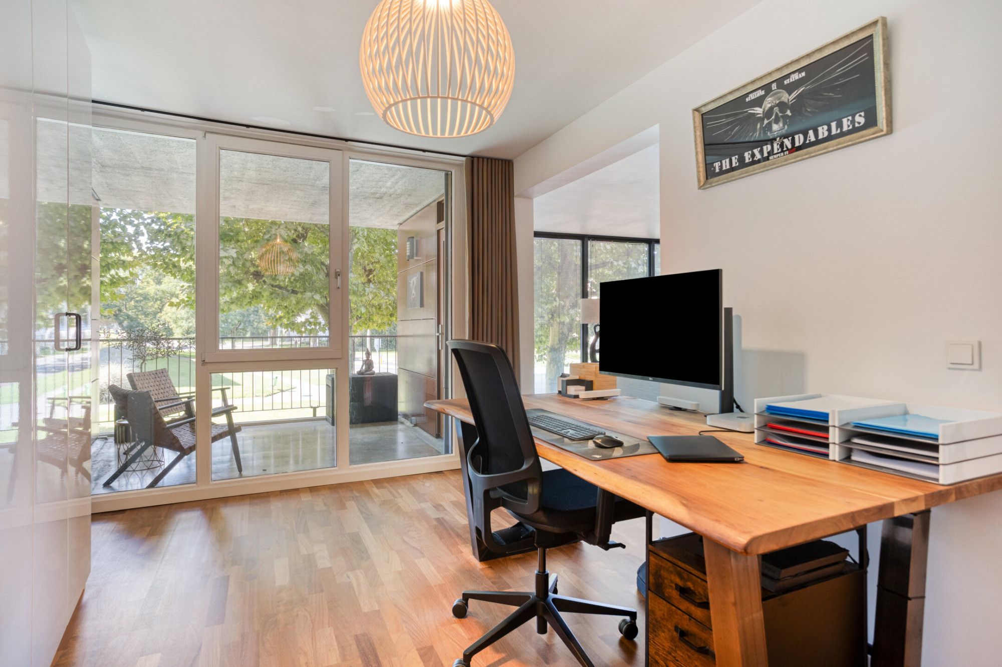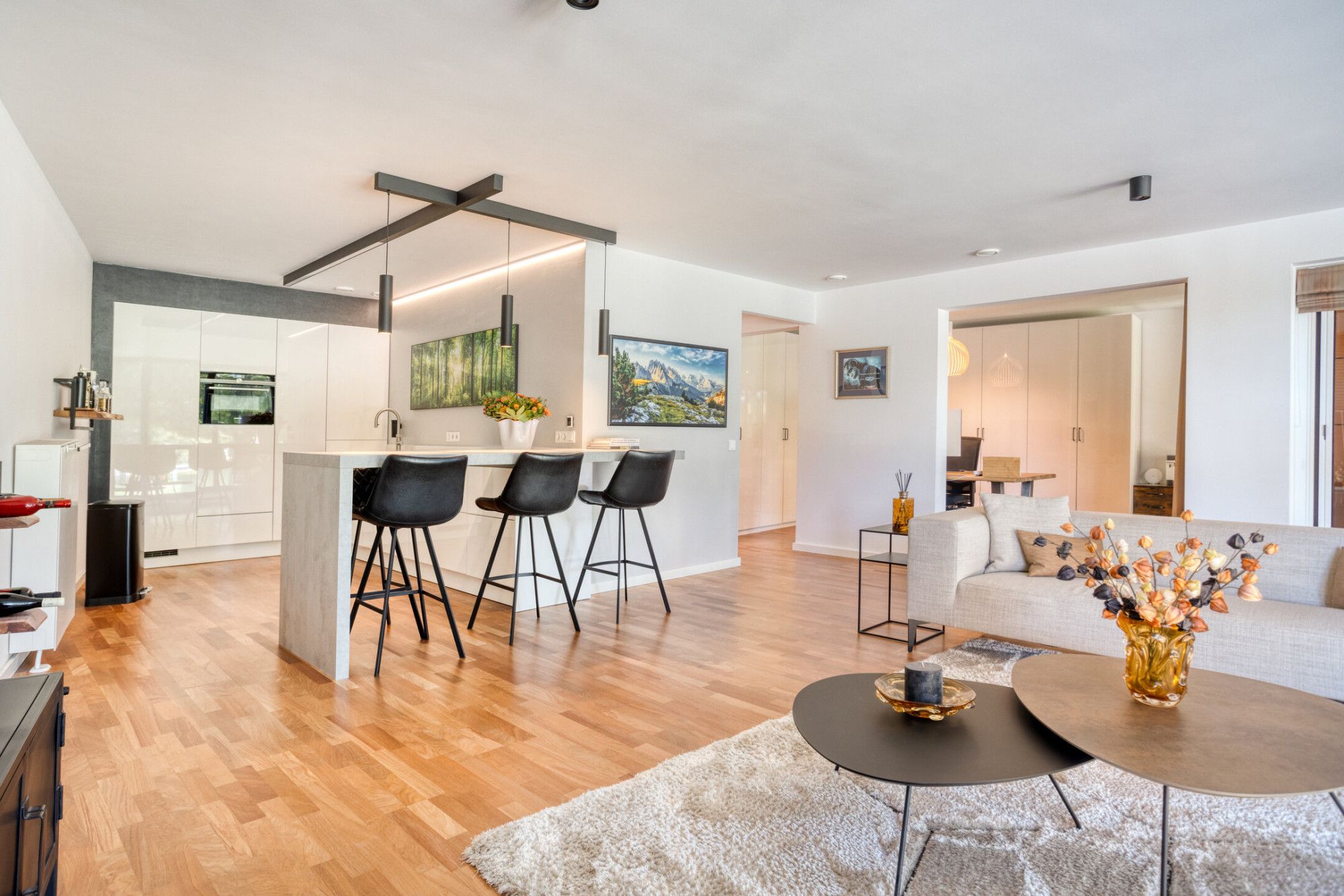 Ruime lichte woonkamer met open keuken met moderne inrichting, moderne badkamer, werk-/slaapkamer grenzend aan de loggia en tweede slaapkamer aan entreezijde.