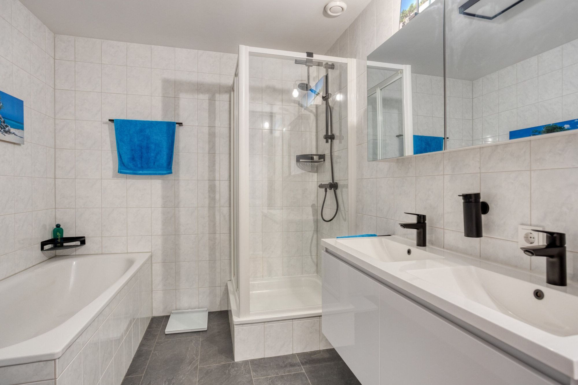 Badkamer voorzien van ligbad, douchecabine en meubel met dubbele wastafel.