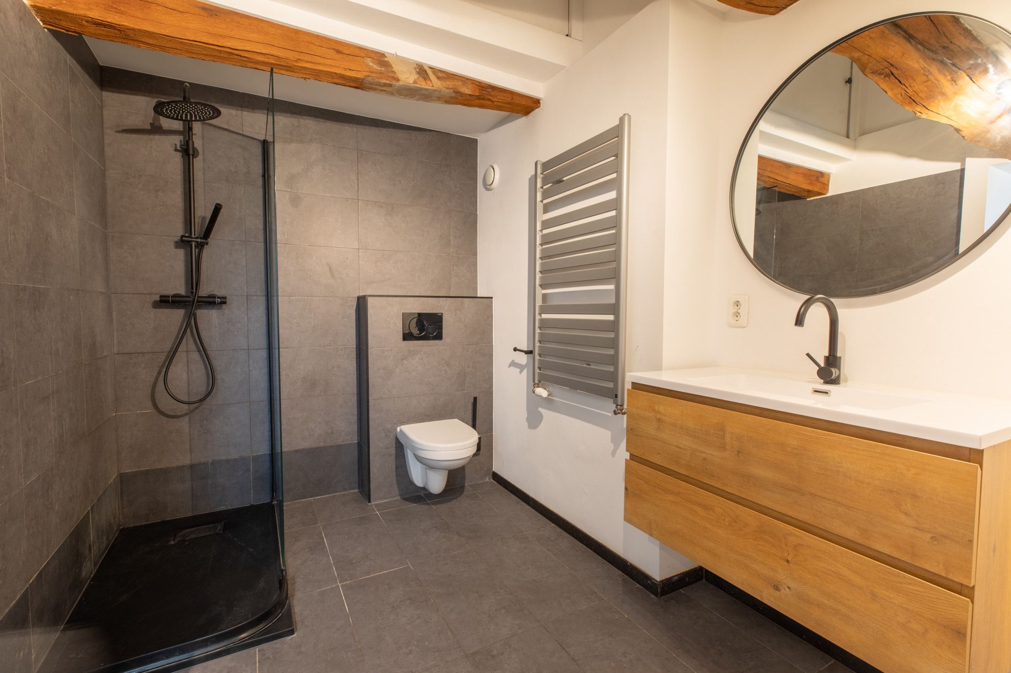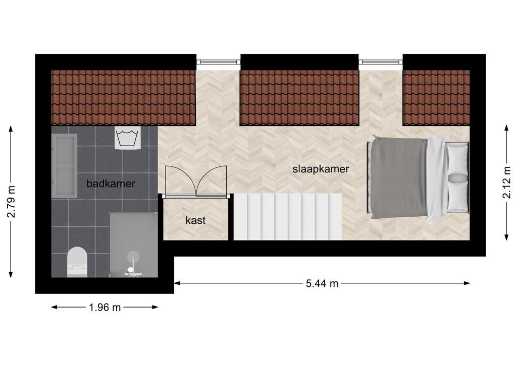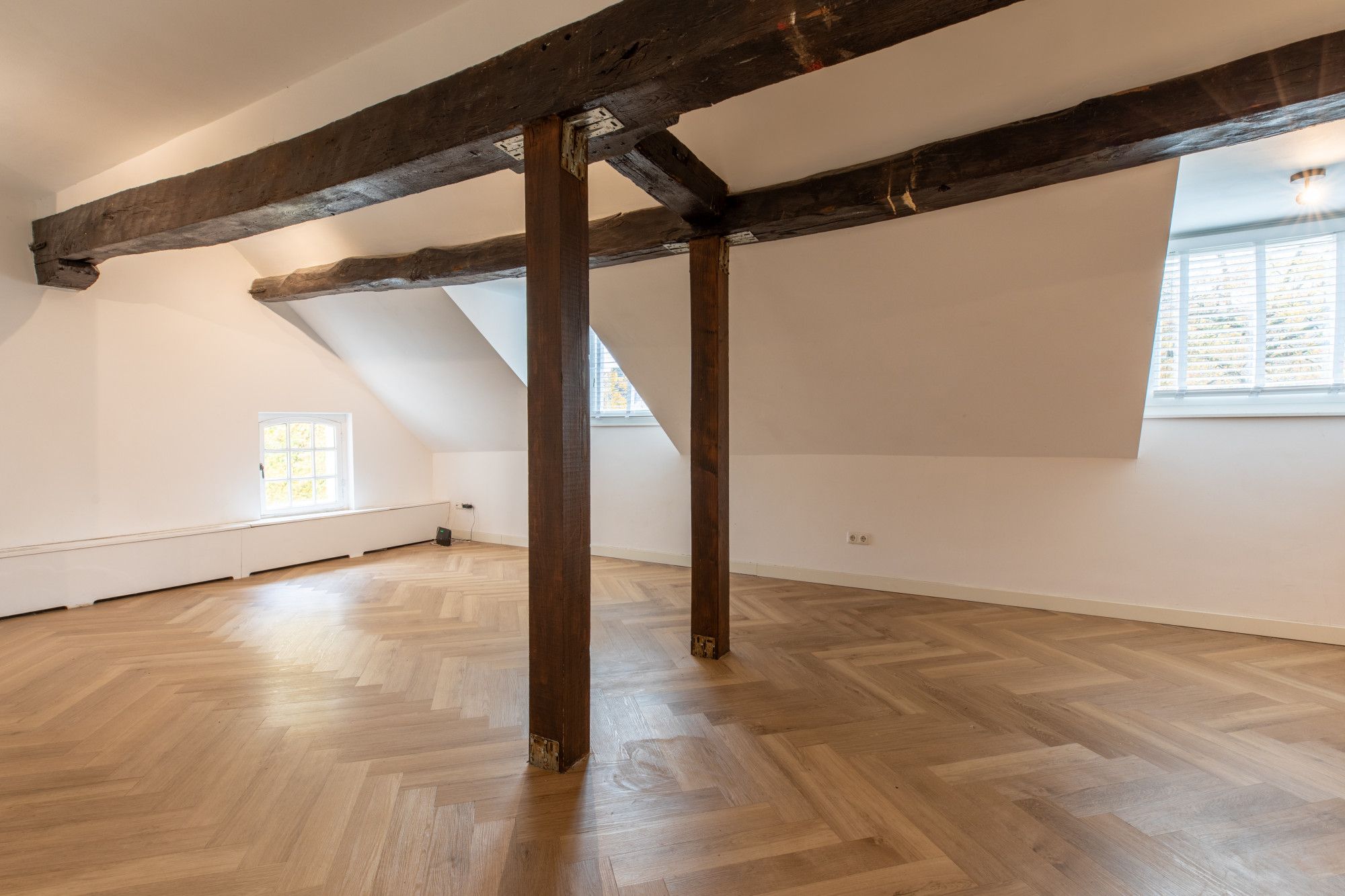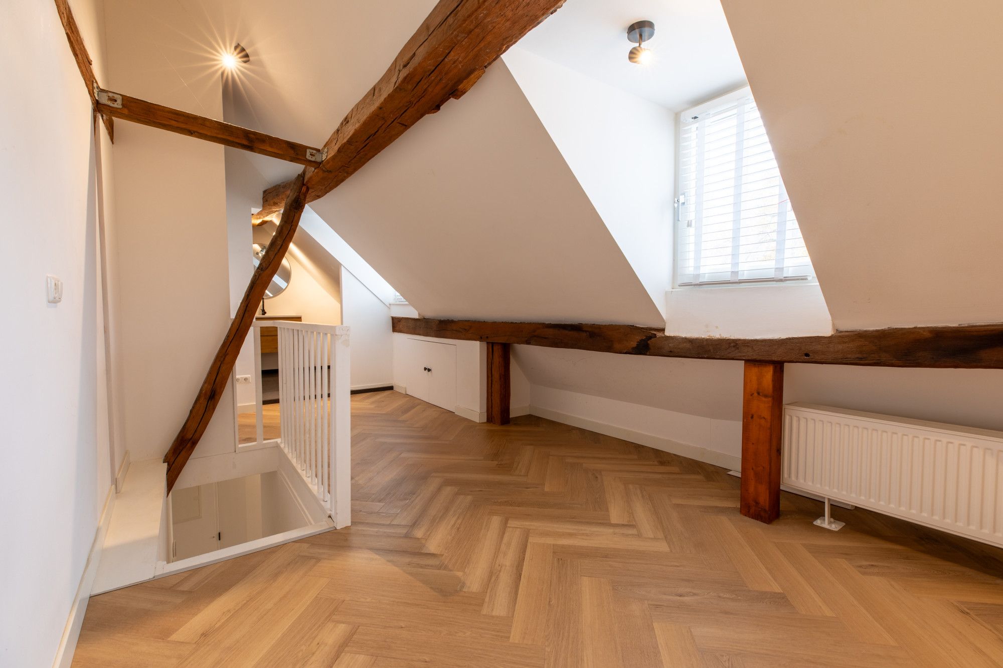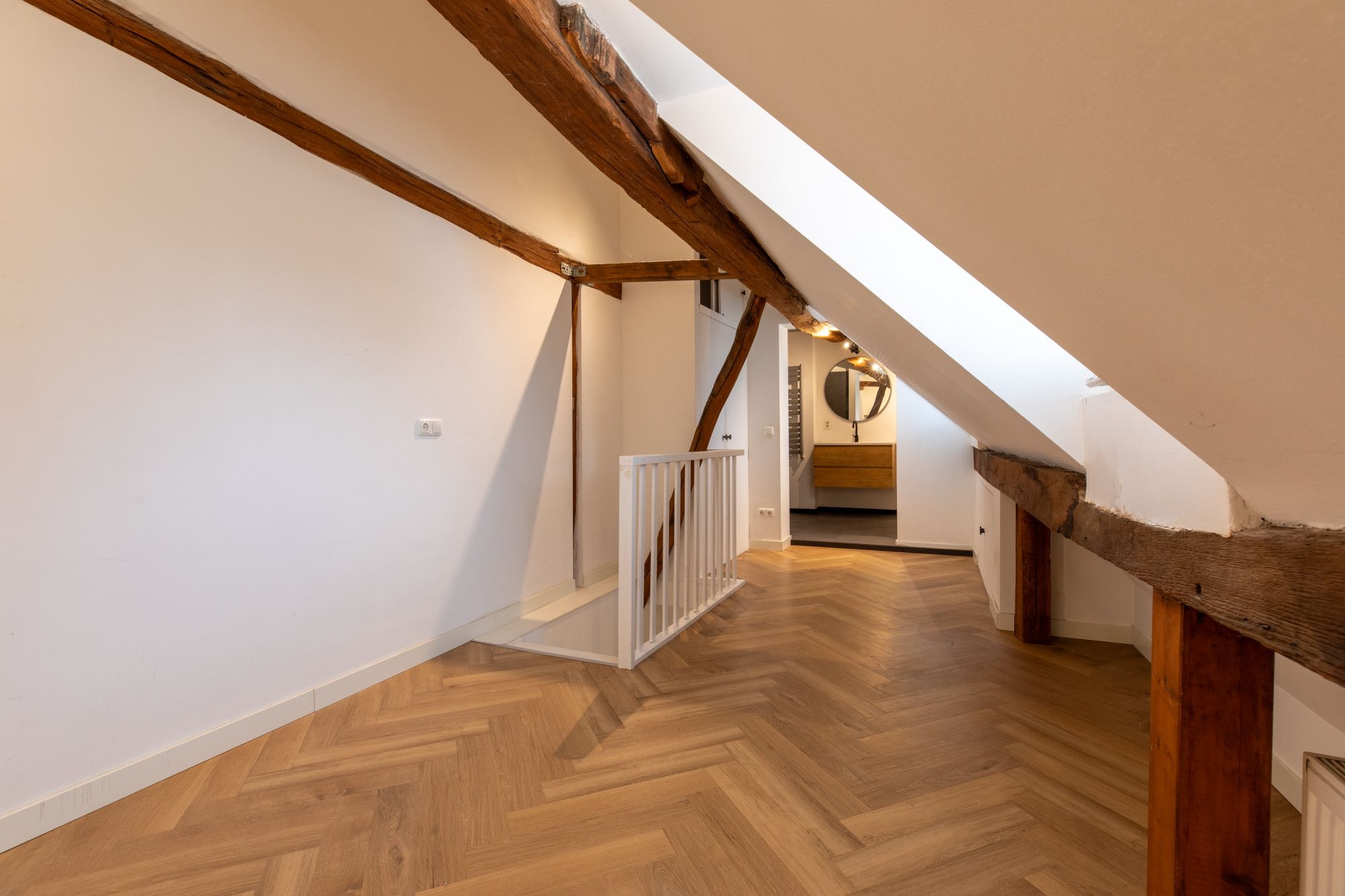 - Middels vaste trap bereikbare slaapkamer van ca. 12m² eveneens met een fraaie visgraat vloer, inbouwkast en ensuite badkamer met inloopdouche, wastafel, 2e toilet en wasmachine aansluiting.