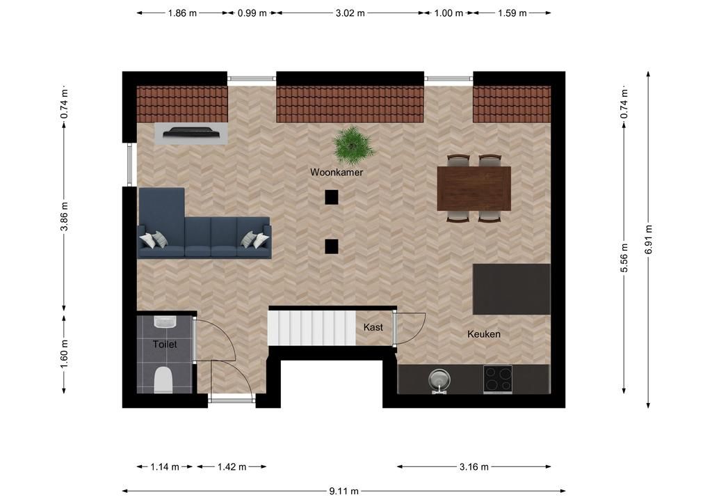 - Ruime woonkamer met open keuken (totaal ruim 35 m²) geheel voorzien van een fraaie visgraat vloer. De moderne keukenopstelling met een riant eiland is o.a. voorzien van een 4 pits inductie kookplaat, oven, koelkast en vaatwasser.