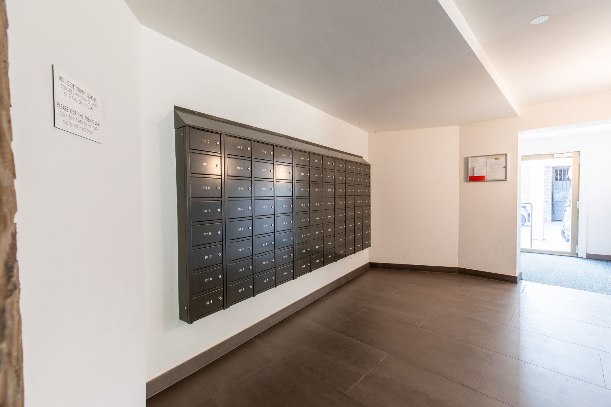 Hoofdentree met centrale hal, postbussen, video/intercominstallatie, lift en trappenhuis.