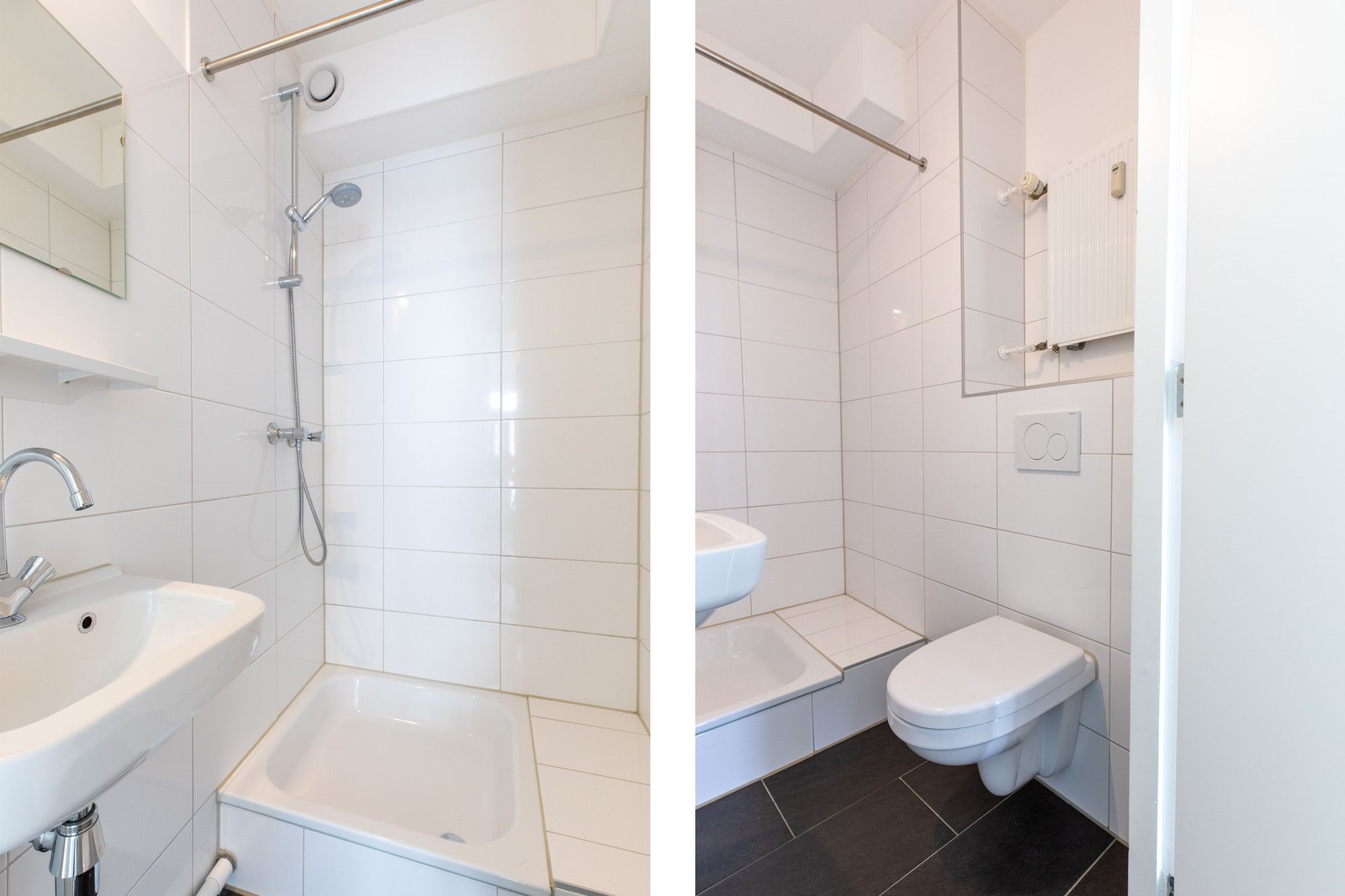 De volledig betegelde badkamer beschikt over een douche, wastafel en een wandcloset.