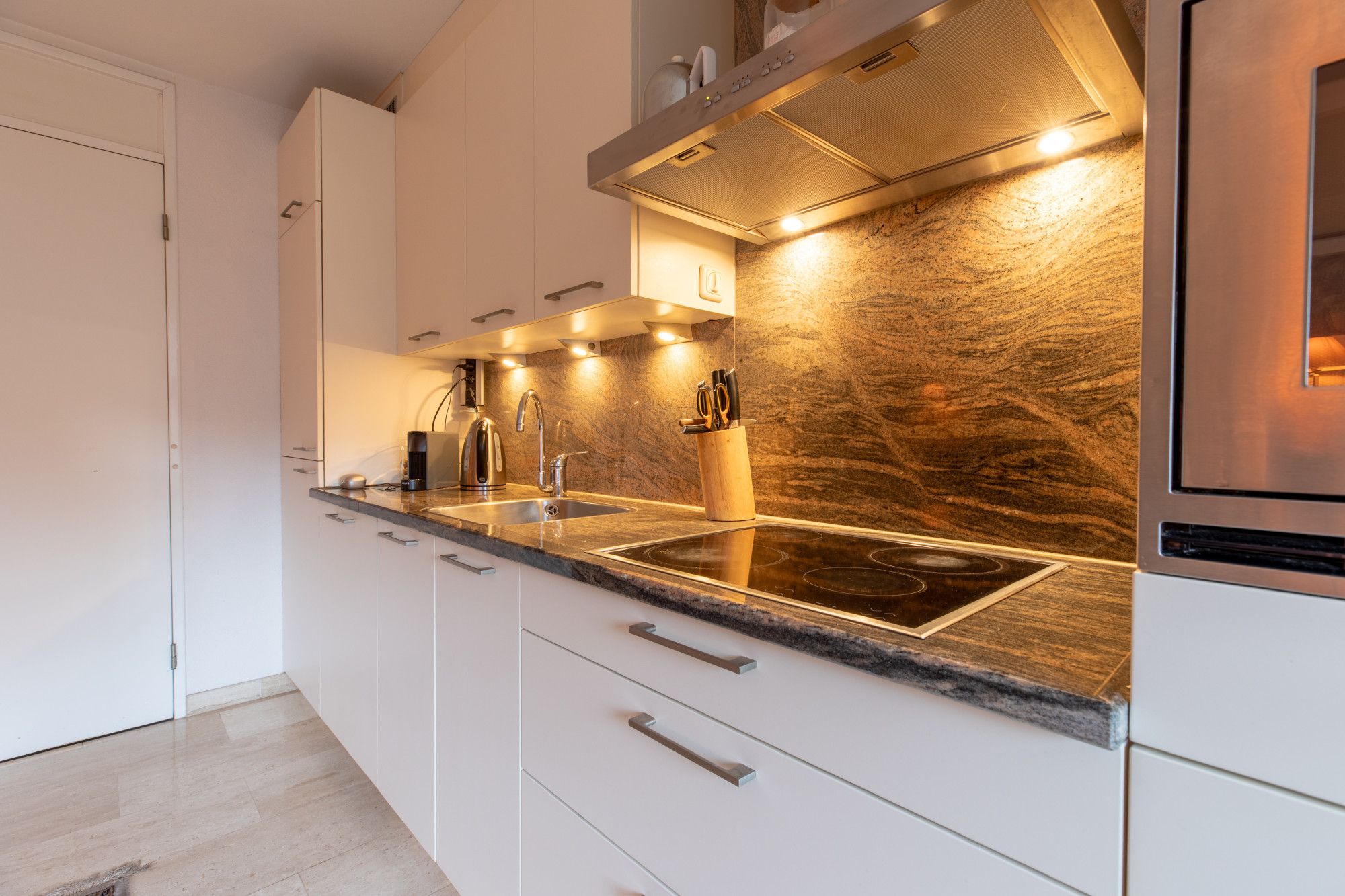 - Open keuken van ca. 16 m² met grote ramen voor een fantastische lichtinval. De fraaie keukenopstelling is afgewerkt met een natuurstenen werkblad en voorzien van diverse inbouwapparatuur zoals een vaatwasser, vierpits inductiekookplaat en koelkast. Koken wordt hier een beleving.