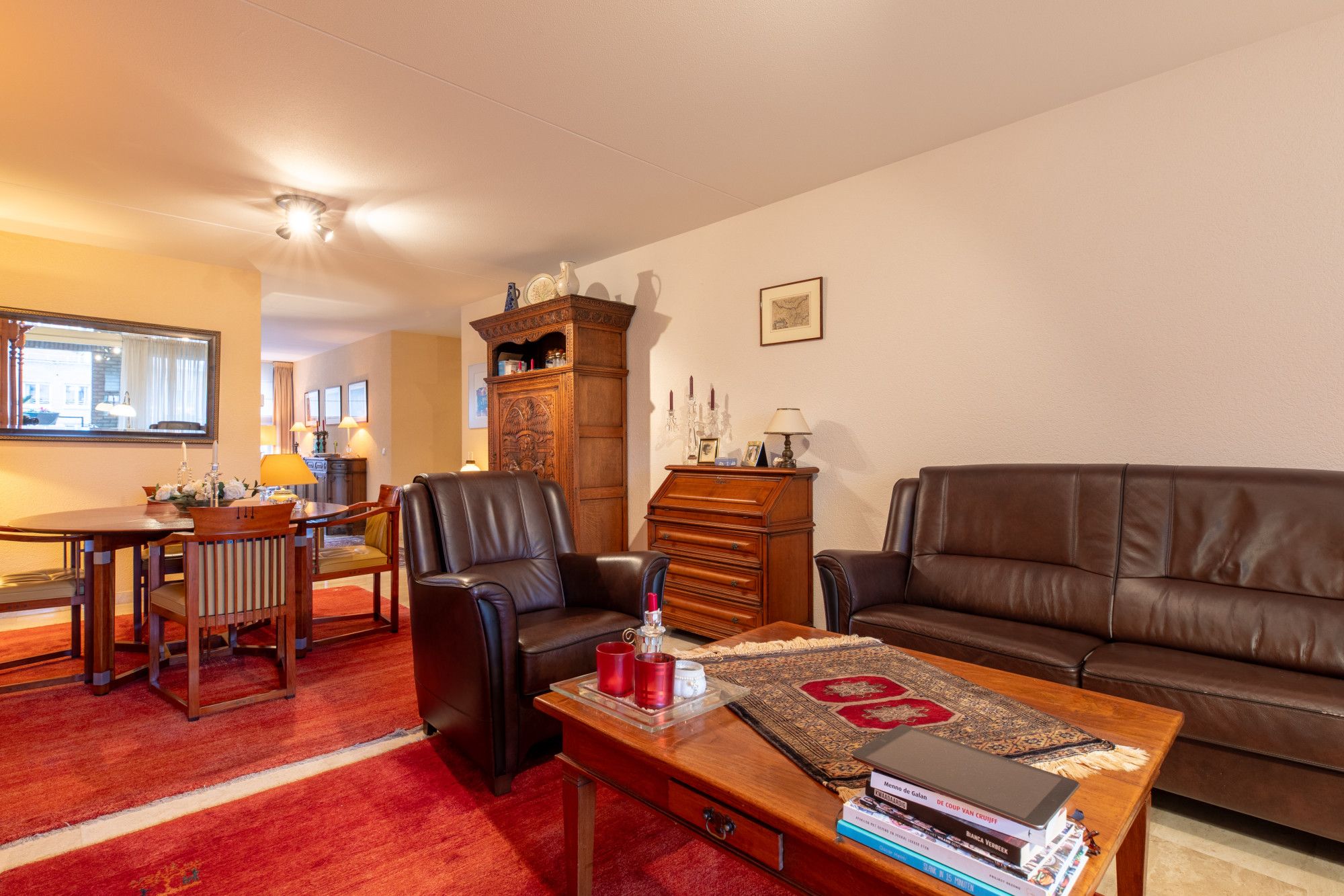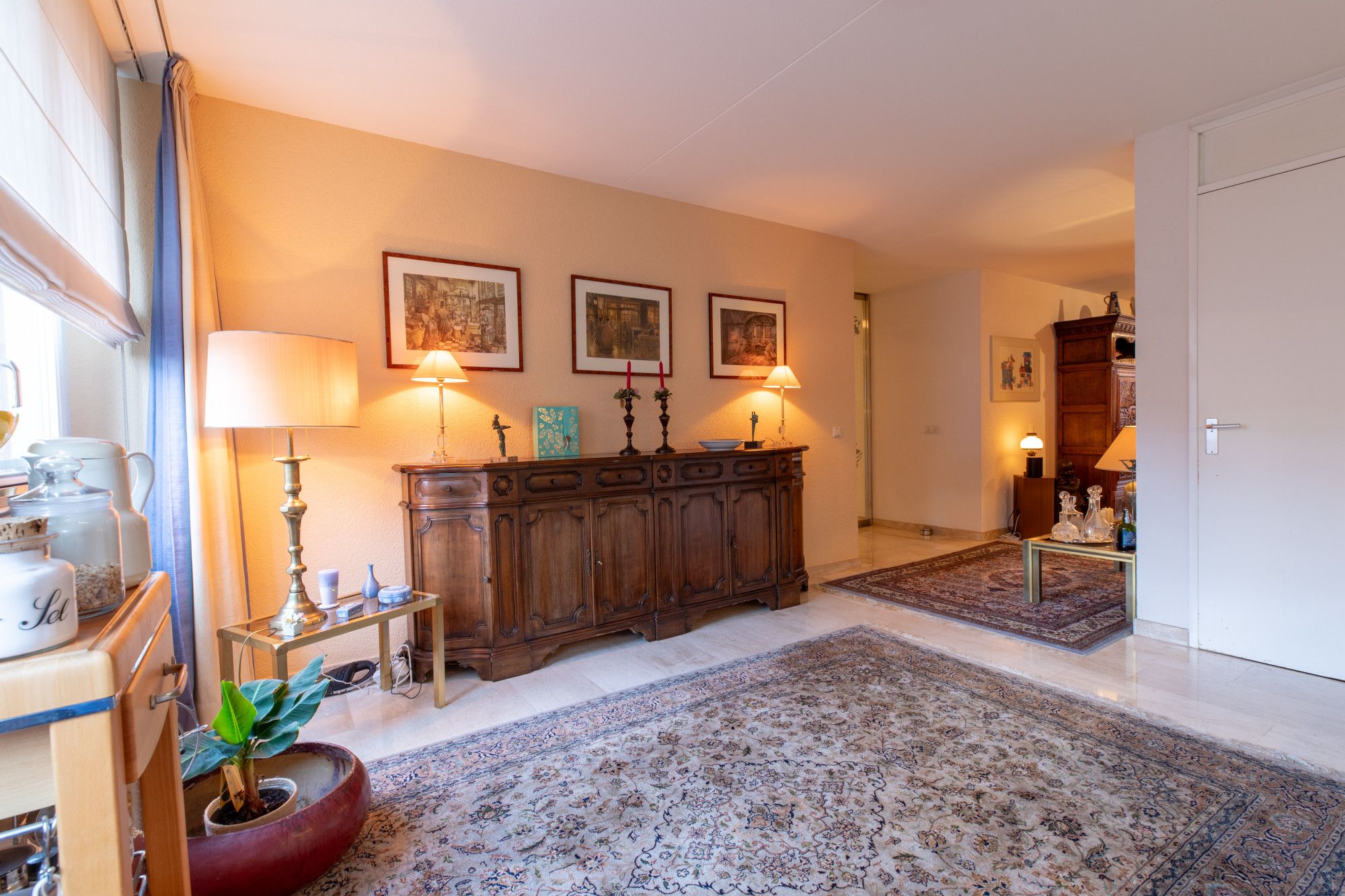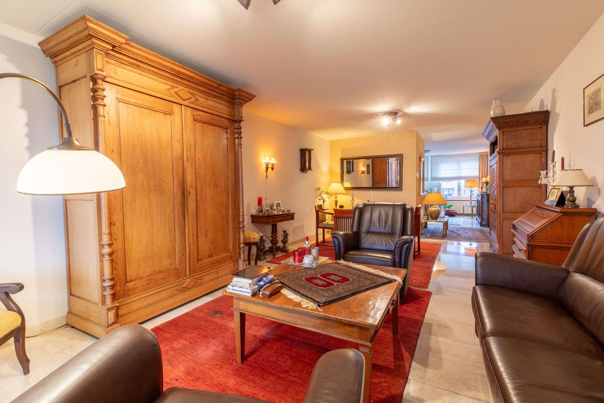 - De woonkamer van ca. 36 m² ademt ruimte en comfort en geeft via een schuifpui toegang tot de loggia van circa 9 m². Deze ligt op het zuiden en biedt een heerlijk beschut buitengevoel met uitzicht over het omsloten park – een zeldzame luxe in de stad.