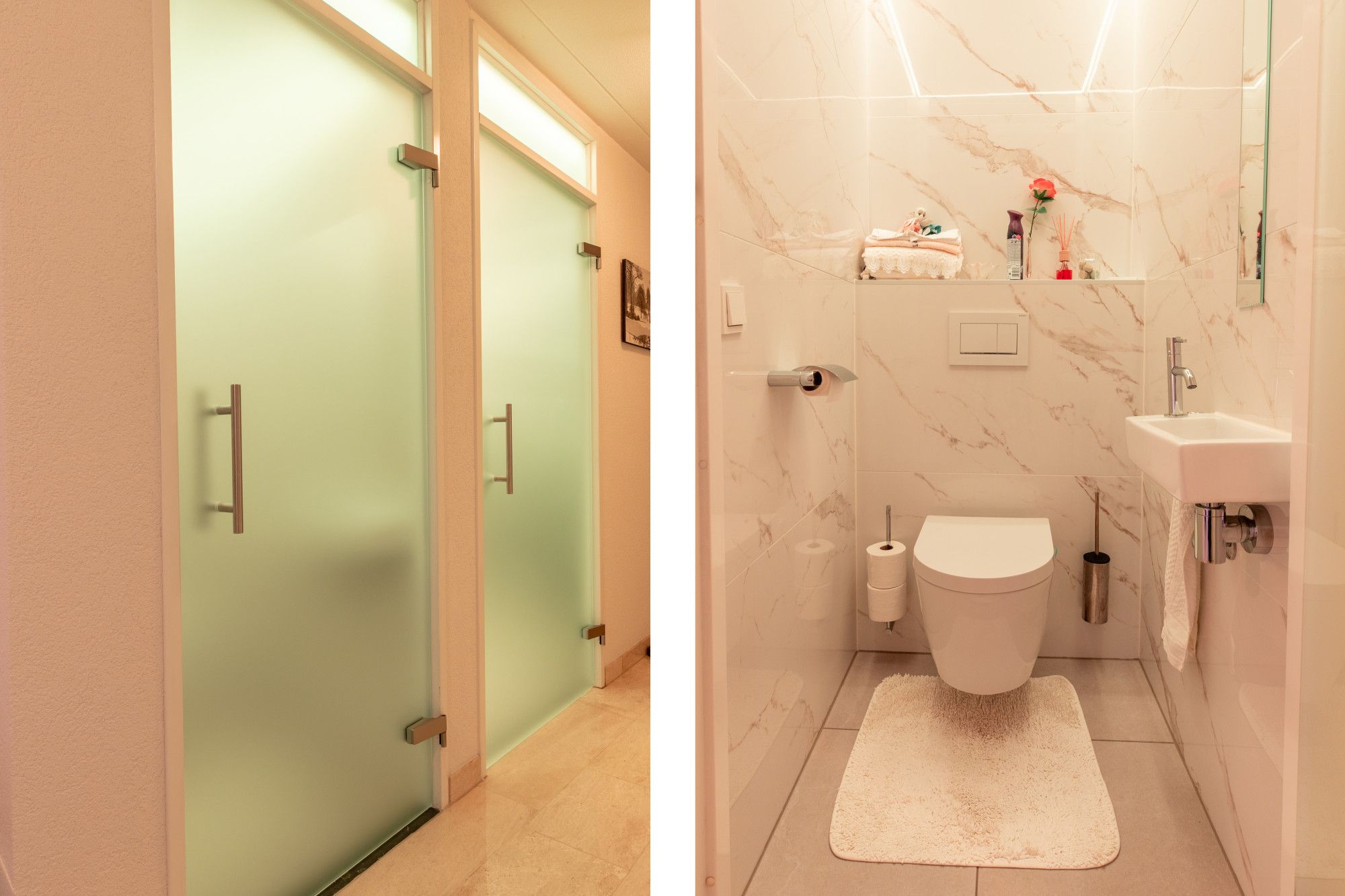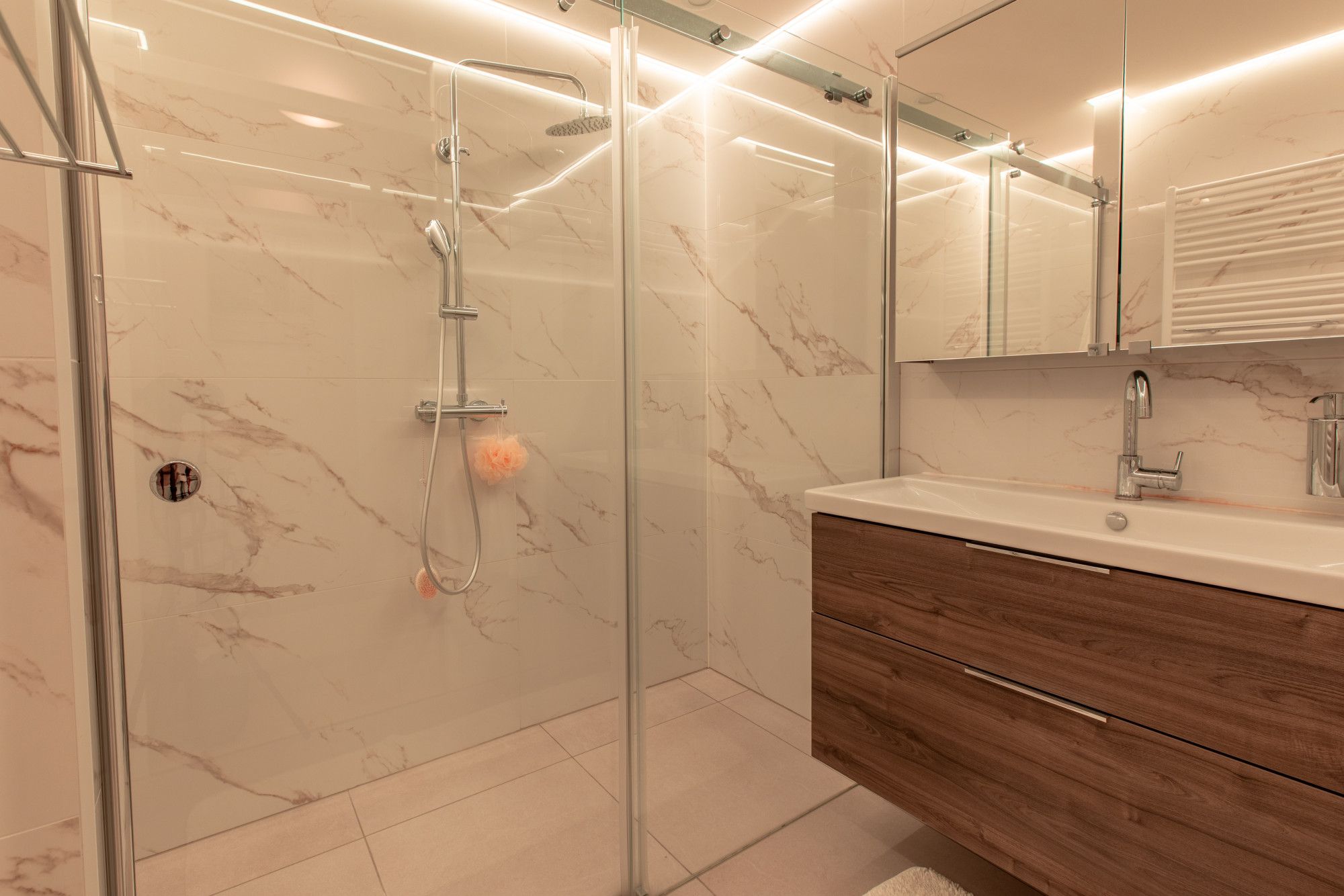 - Luxe badkamer met glazen douchecabine en wastafel: strak, modern en comfortabel.