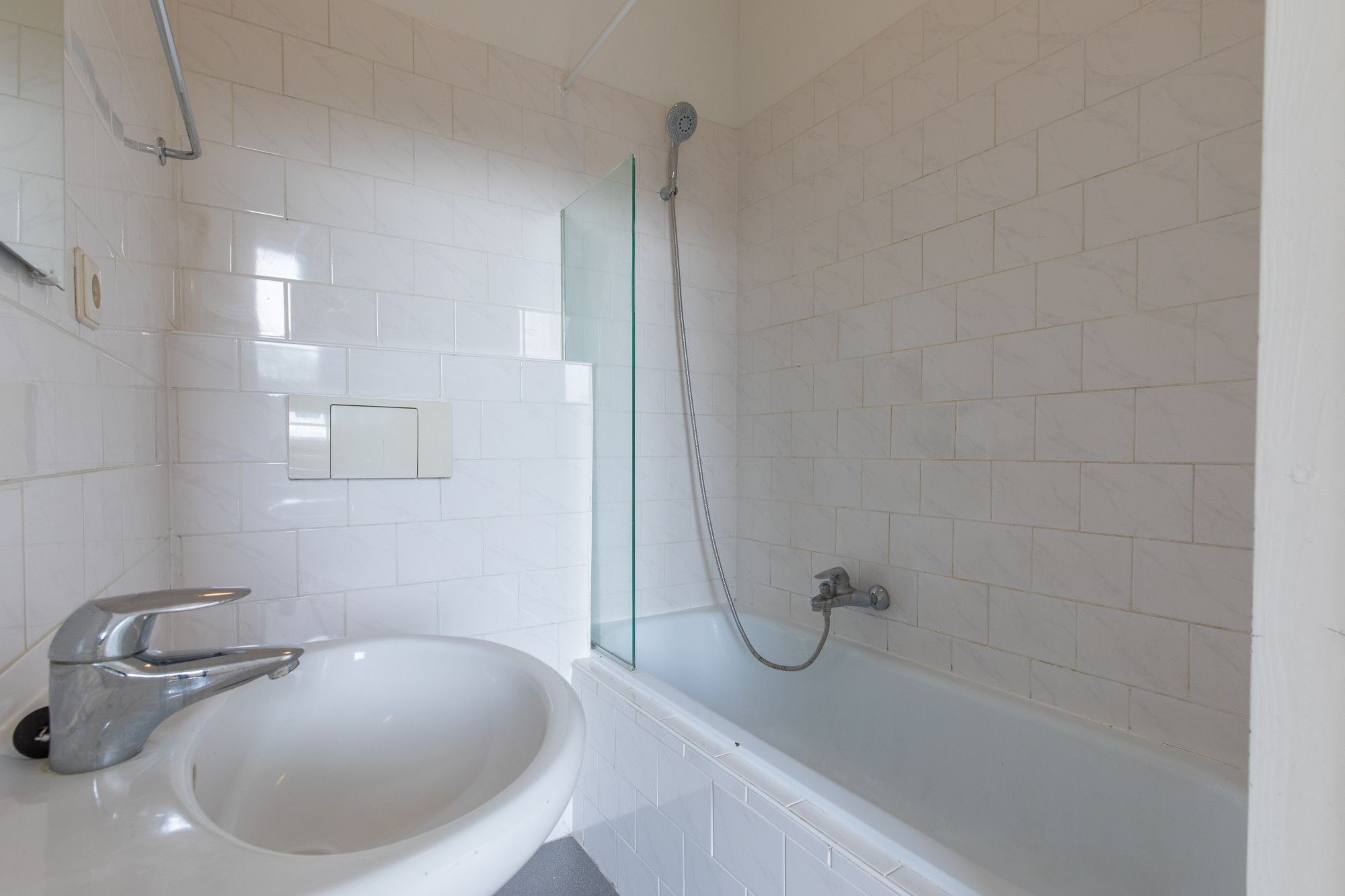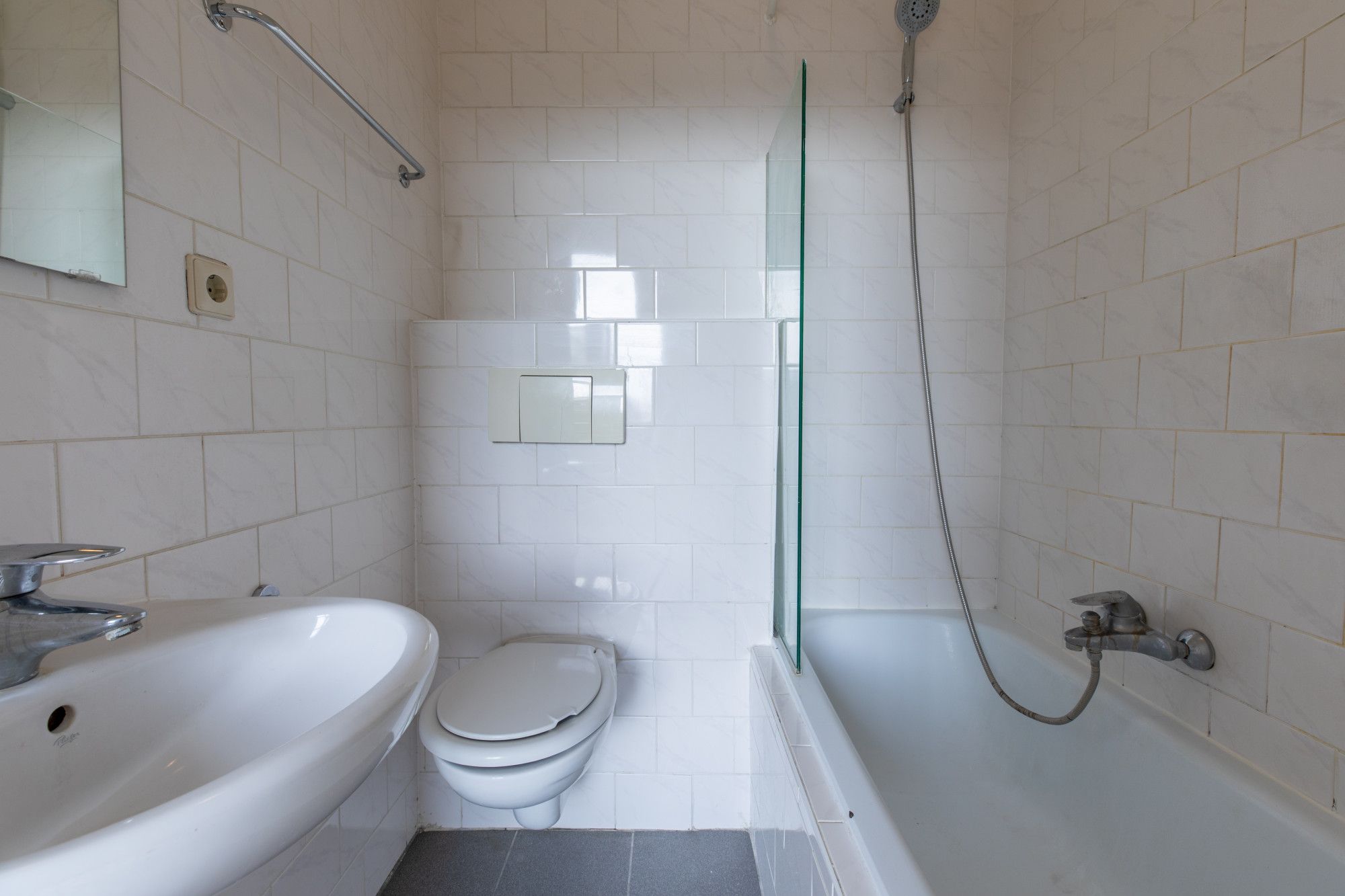 - Compacte betegelde badkamer van ca. 3 m² met ligbad/douche, wastafel en toilet.